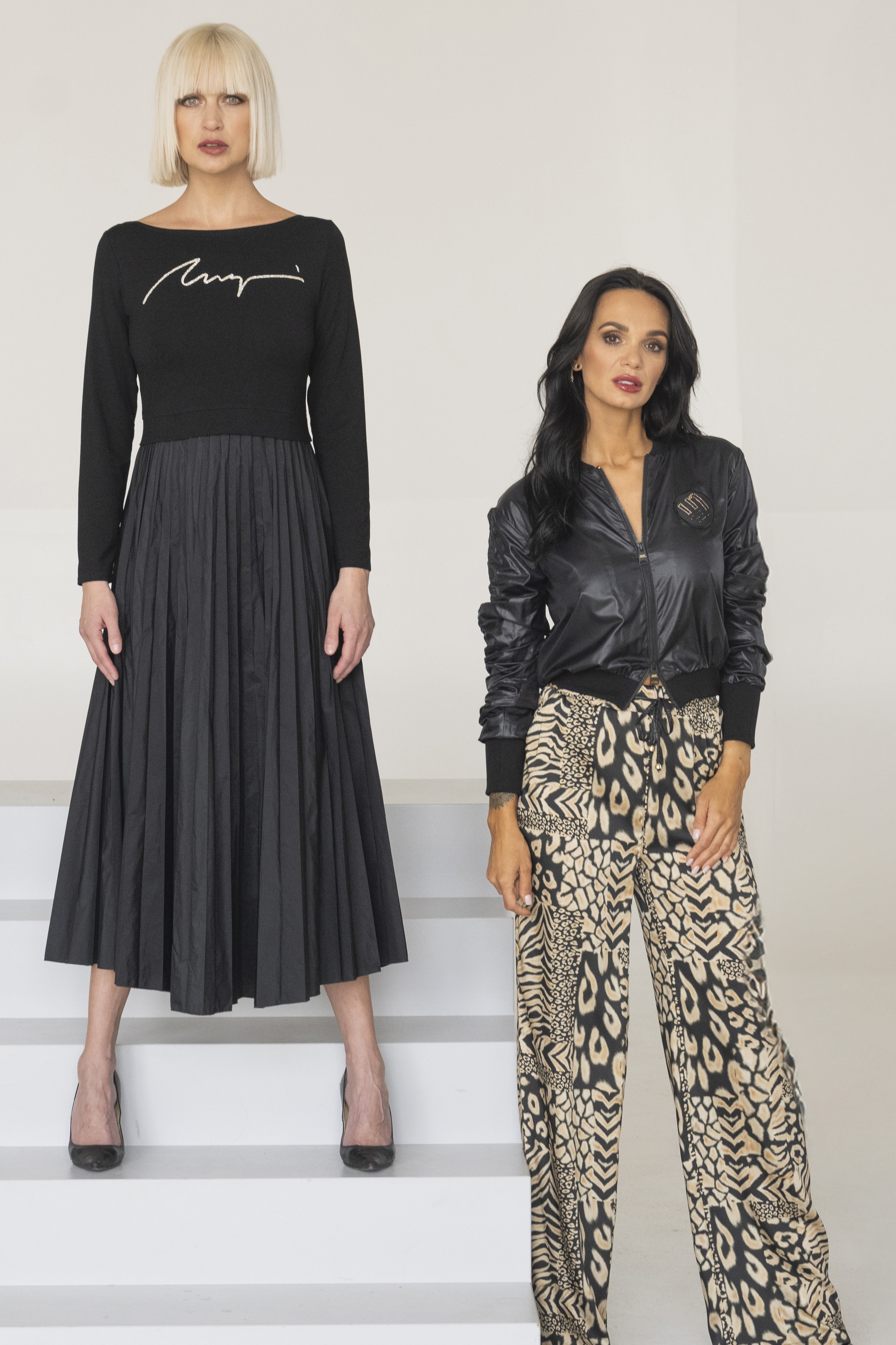 Šaty Infinite přestřižené nad pasem. Zlatý tisk na předním díle. Plisovaná šusťáková sukně.