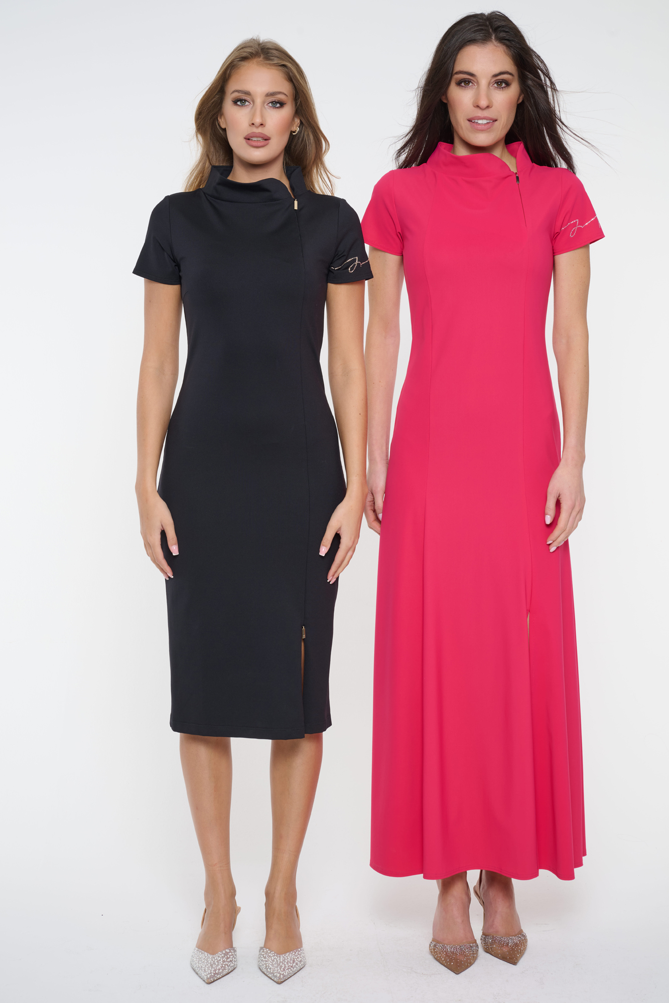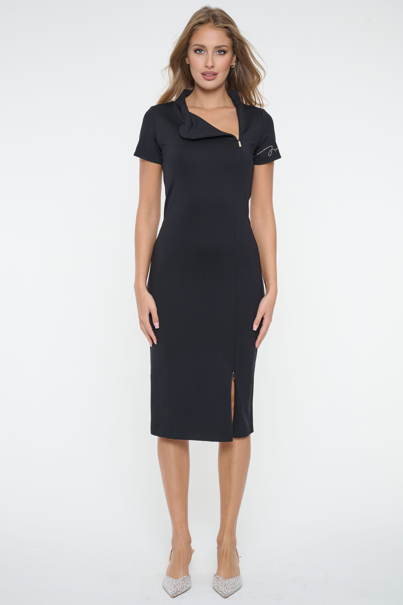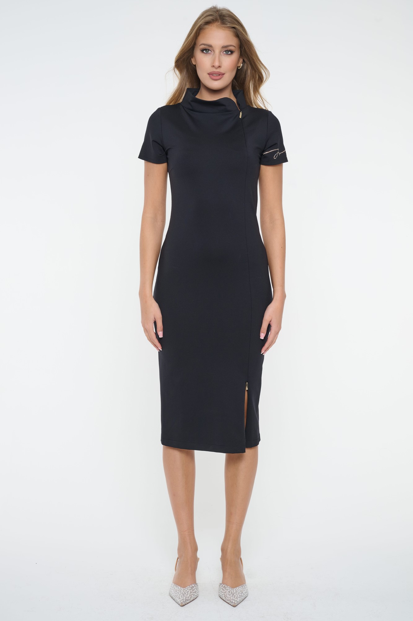 Tubové šaty se stojákem. Zlatý zip ve výstřihu a v rozparku na sukni. Na rukávu nápis Infinite ze zlatých krystalů Preciosa. Zlatý zip i v rozparku na sukni,