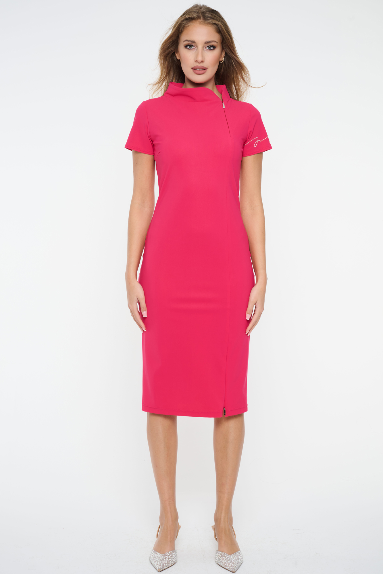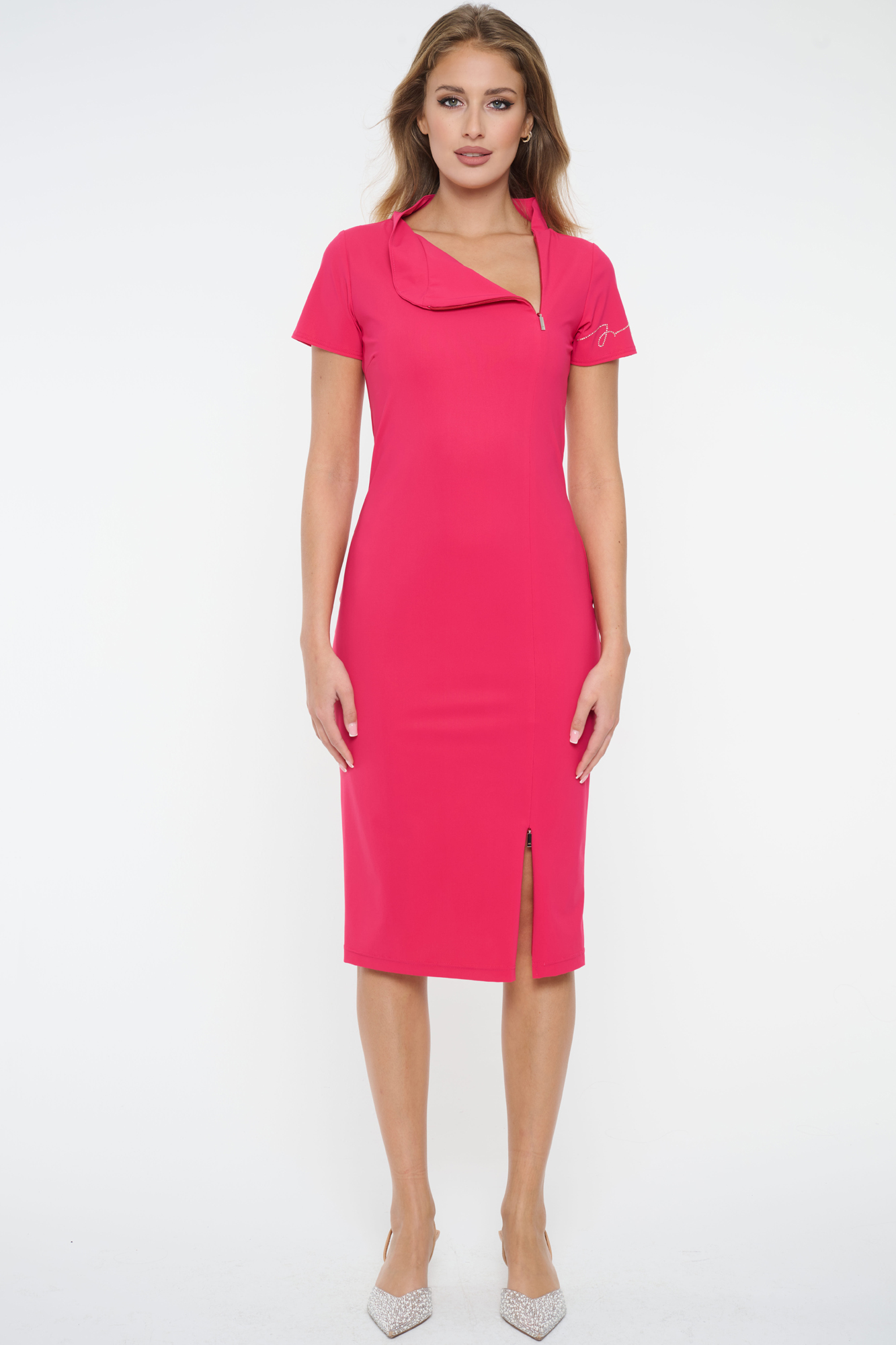 Tubové šaty se stojákem. Zlatý zip ve výstřihu a v rozparku na sukni. Na rukávu nápis Infinite z krystalů Preciosa. Zlatý zip i v rozparku na sukni.