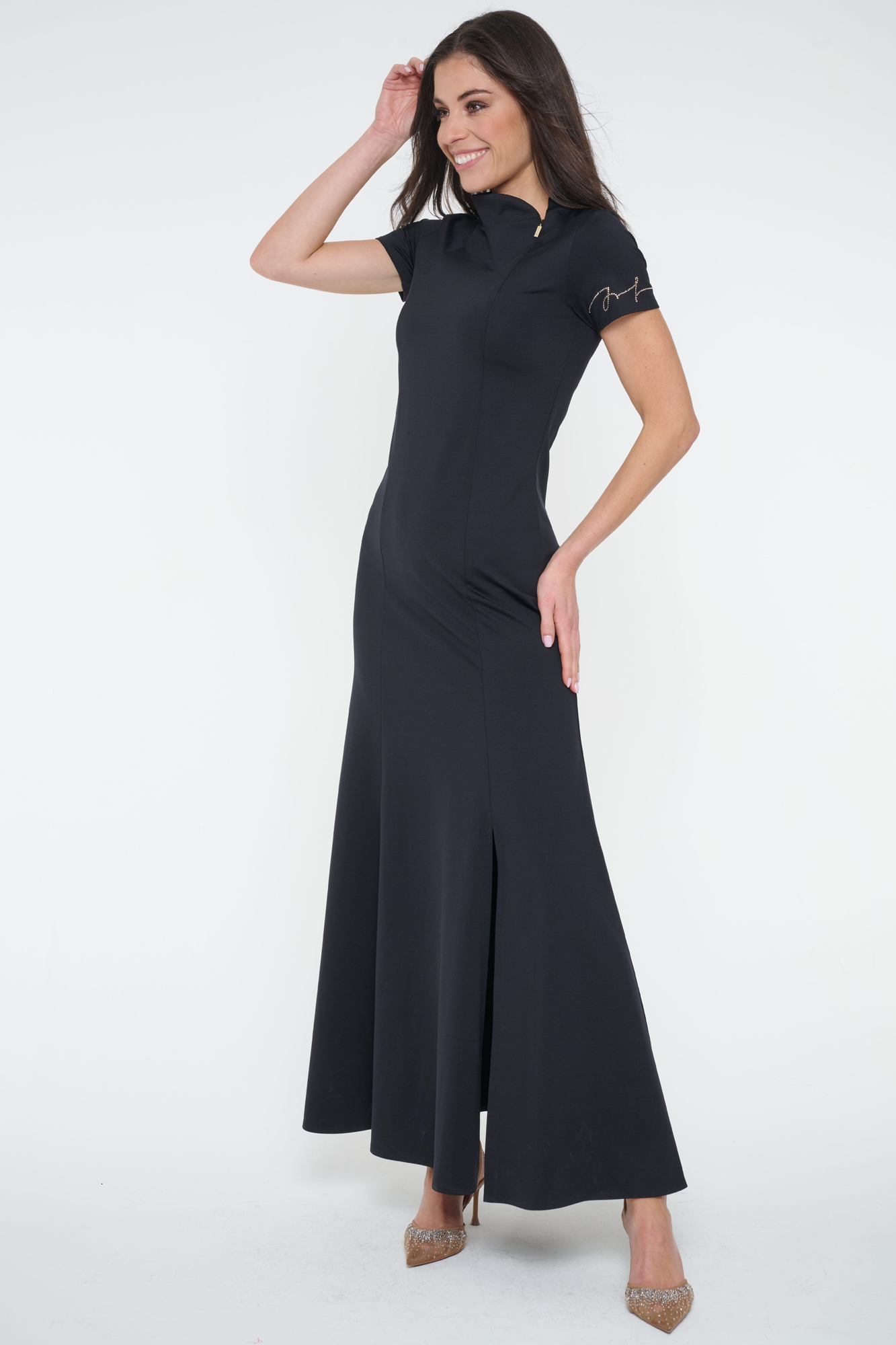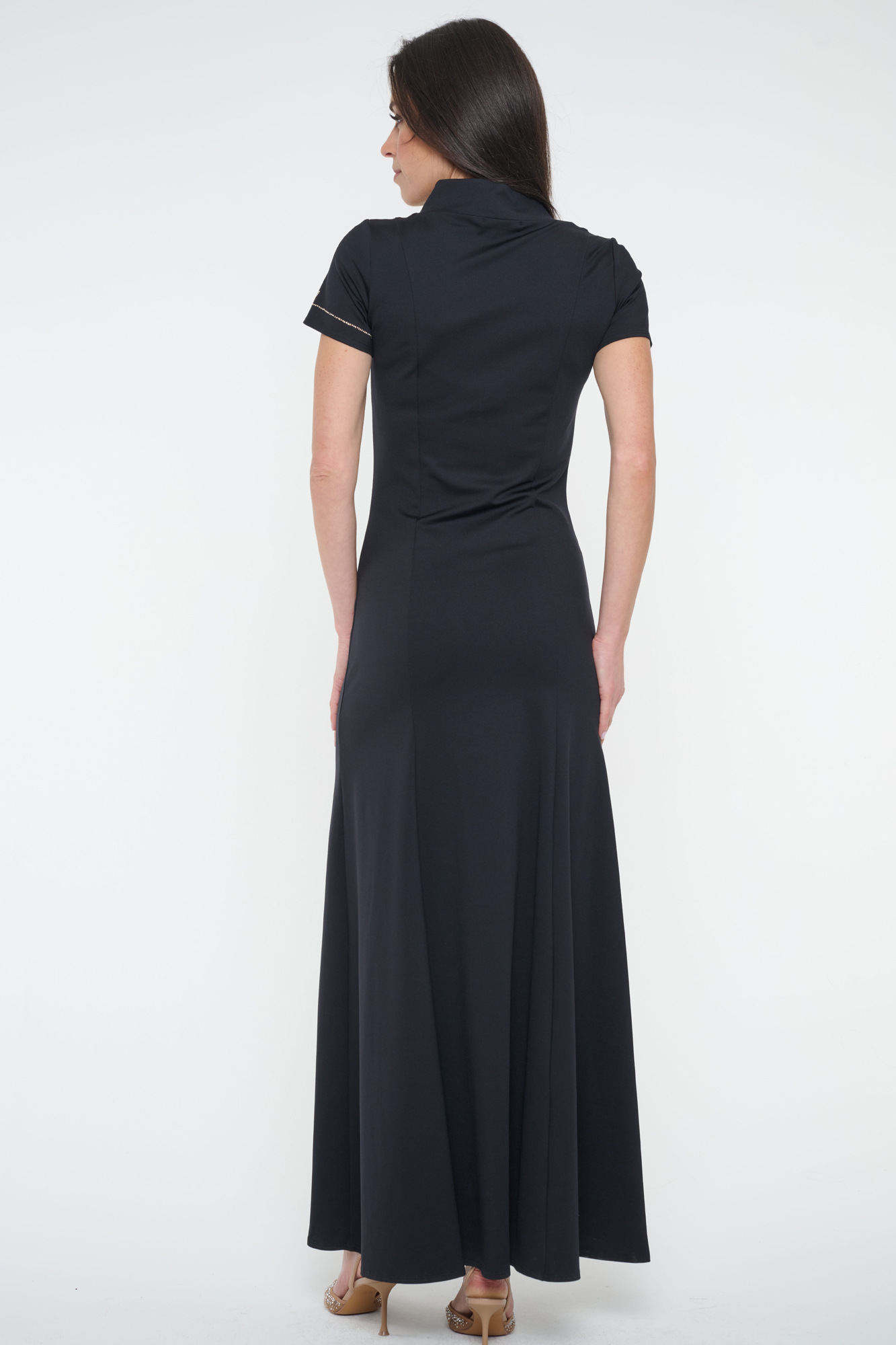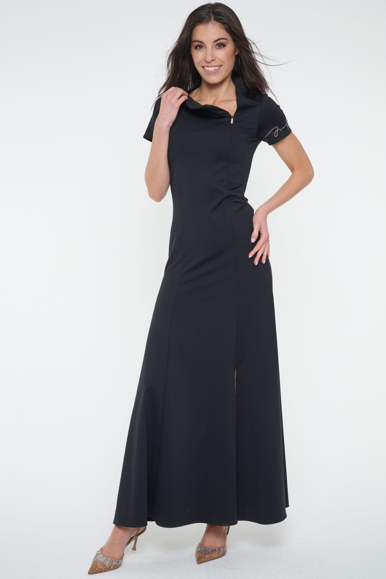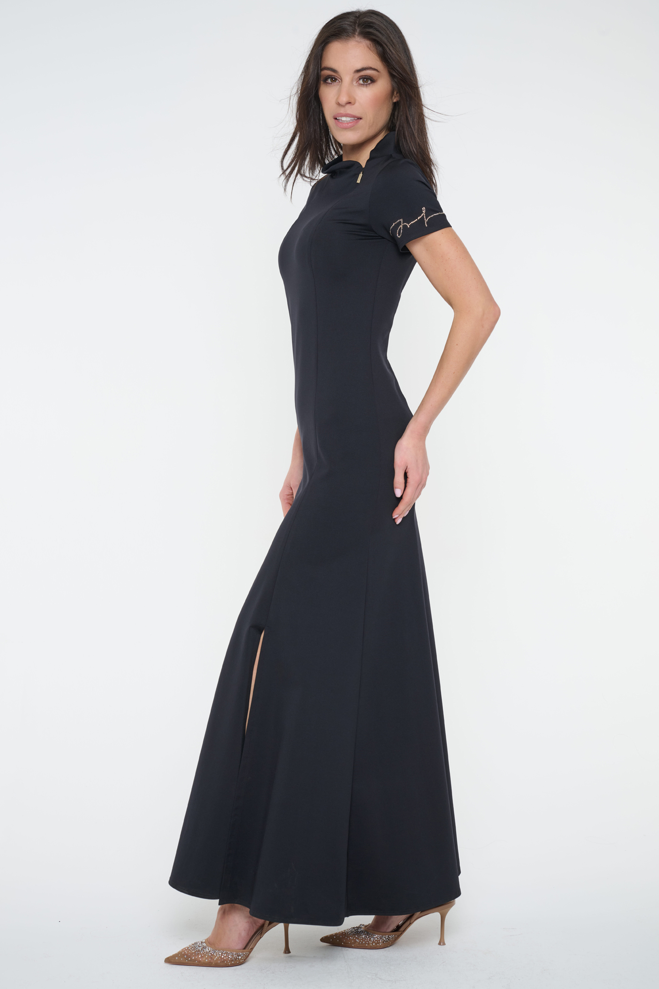 Tubové šaty se stojákem. Zlatý zip ve výstřihu. Na rukávu nápis Infinite z krystalů Preciosa.