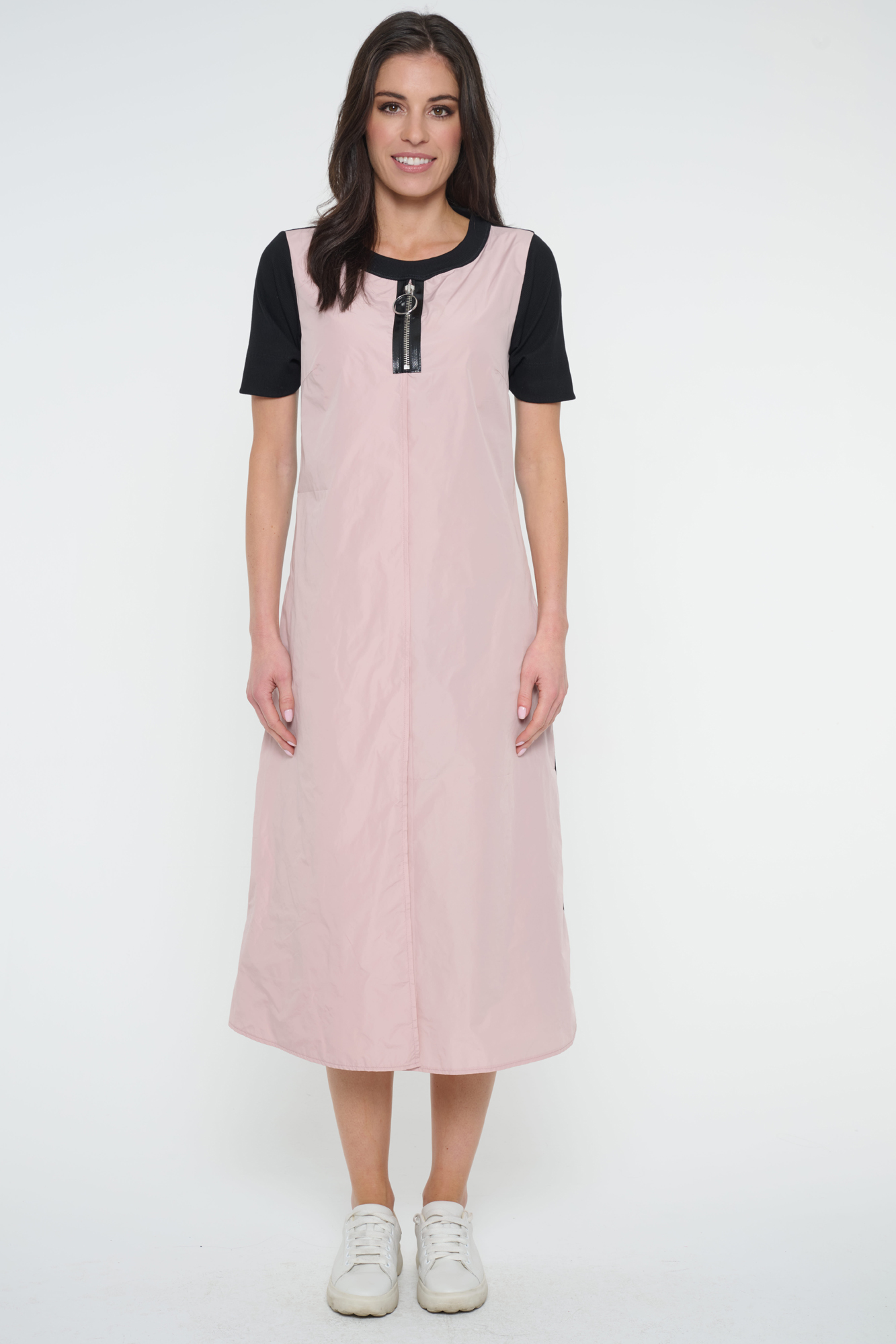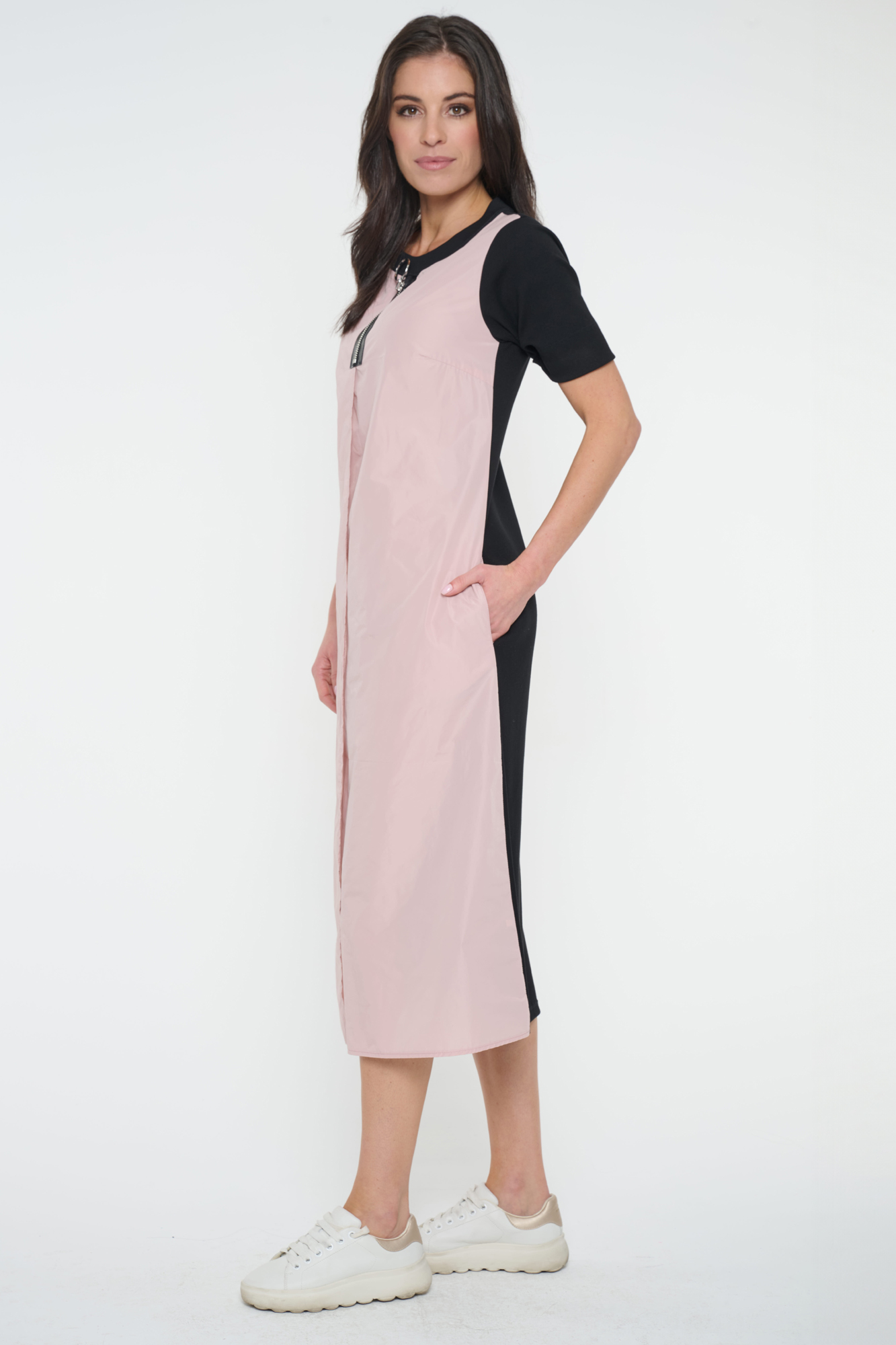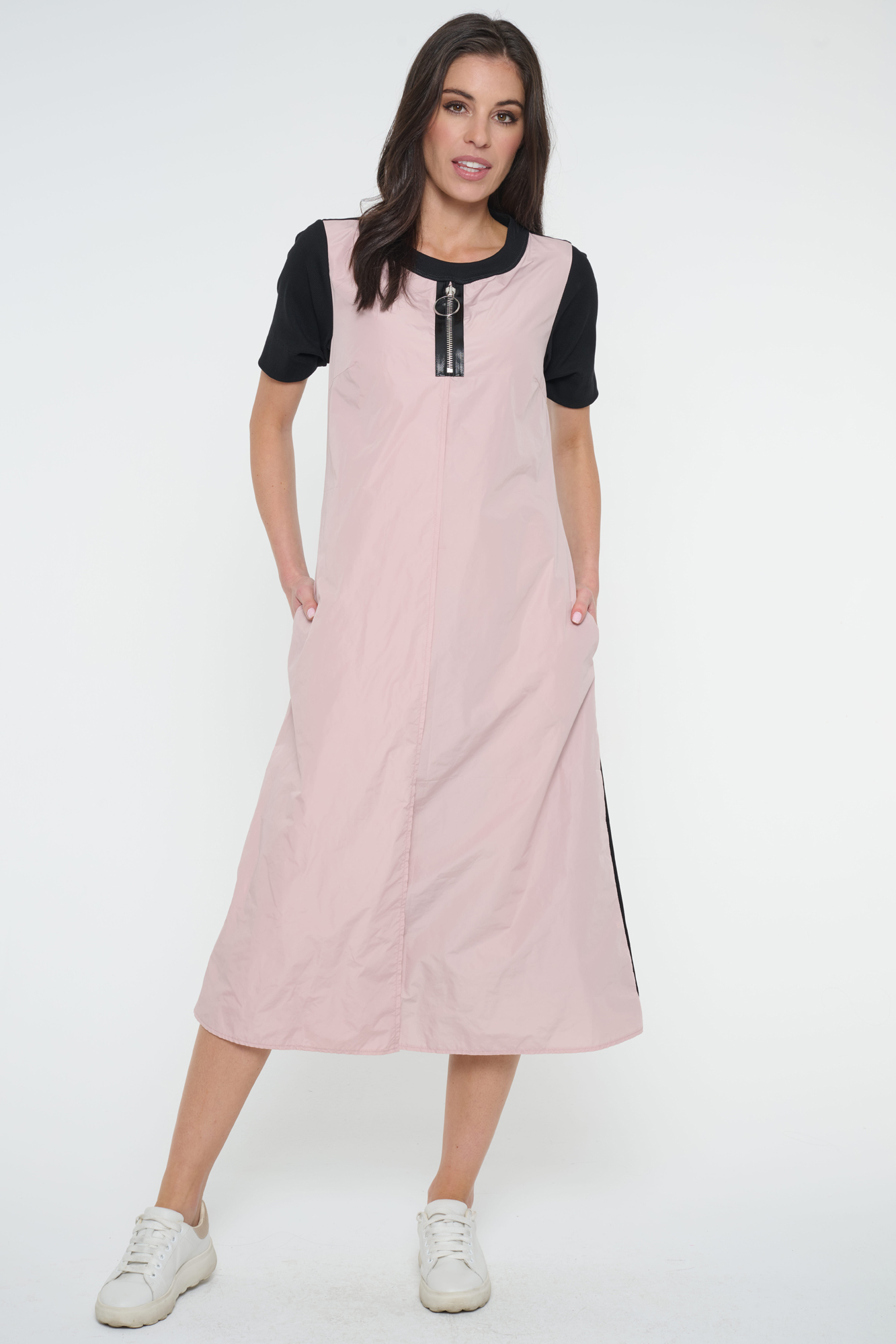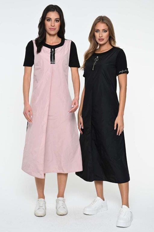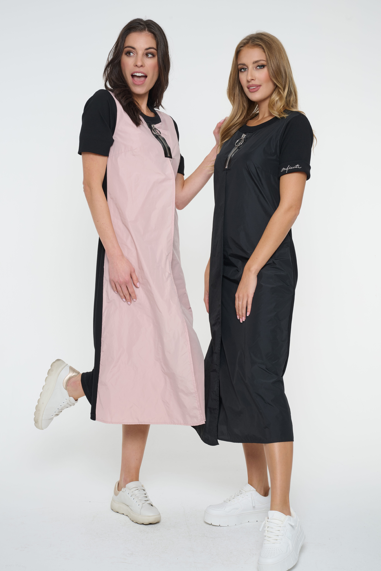 Šaty Infinite sportovního vzhledu. Kombinace šusťáku a úpletu. Ve výstřihu efektní stříbrný zip. Na rukávu nápis Infinite z krystalů Preciosa.