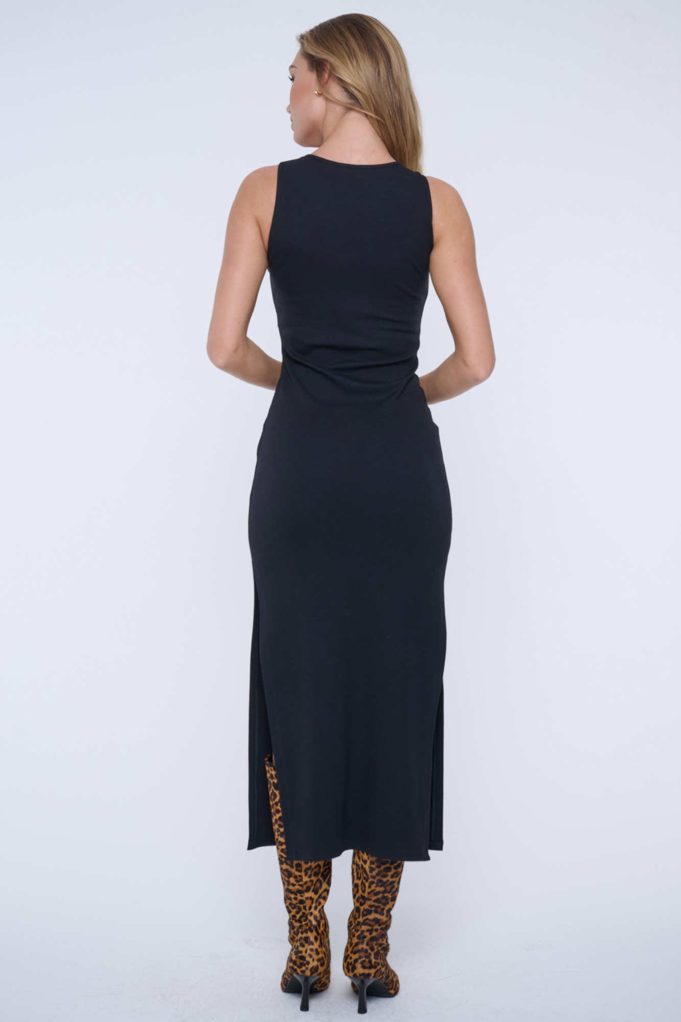 Šaty dlouhé ze strečového "rib" materiálu, který díky svému unikátnímu složení bavlny, modalu a elastanu je velmi příjemný na nošení. Na bocích rozparky. Na předním díle nový typ loga Infinite z krystalů Preciosa.