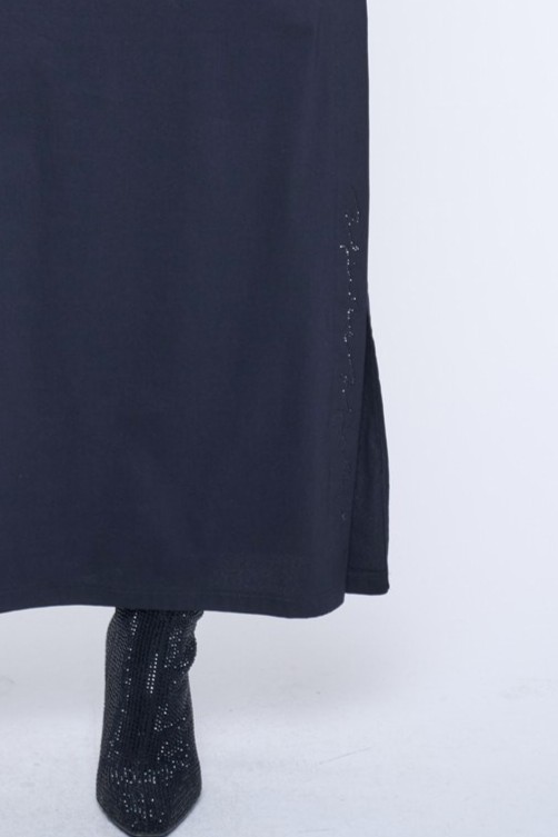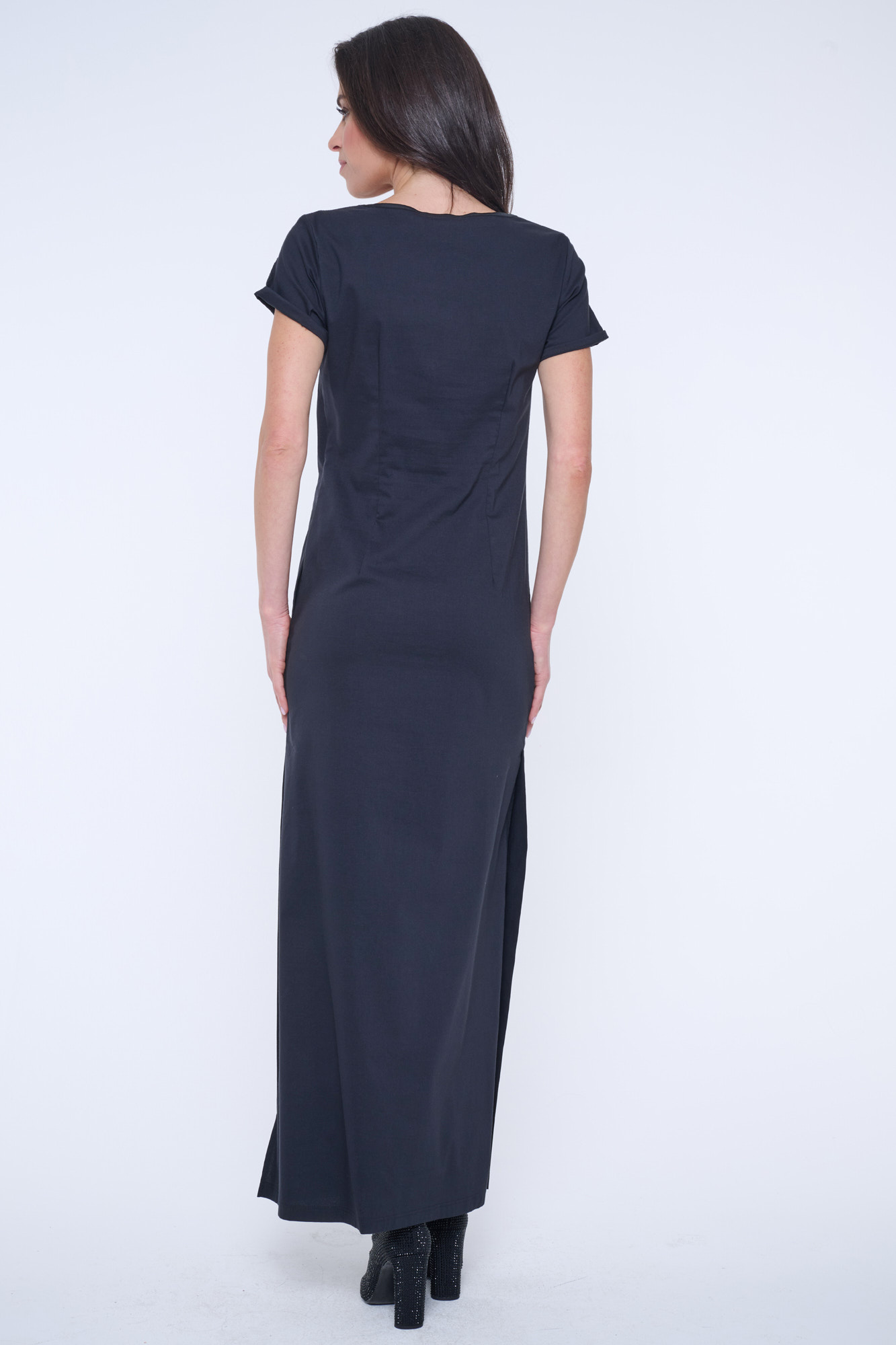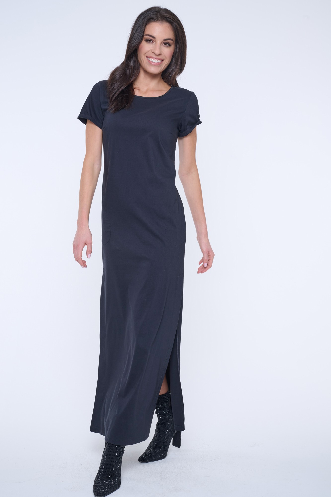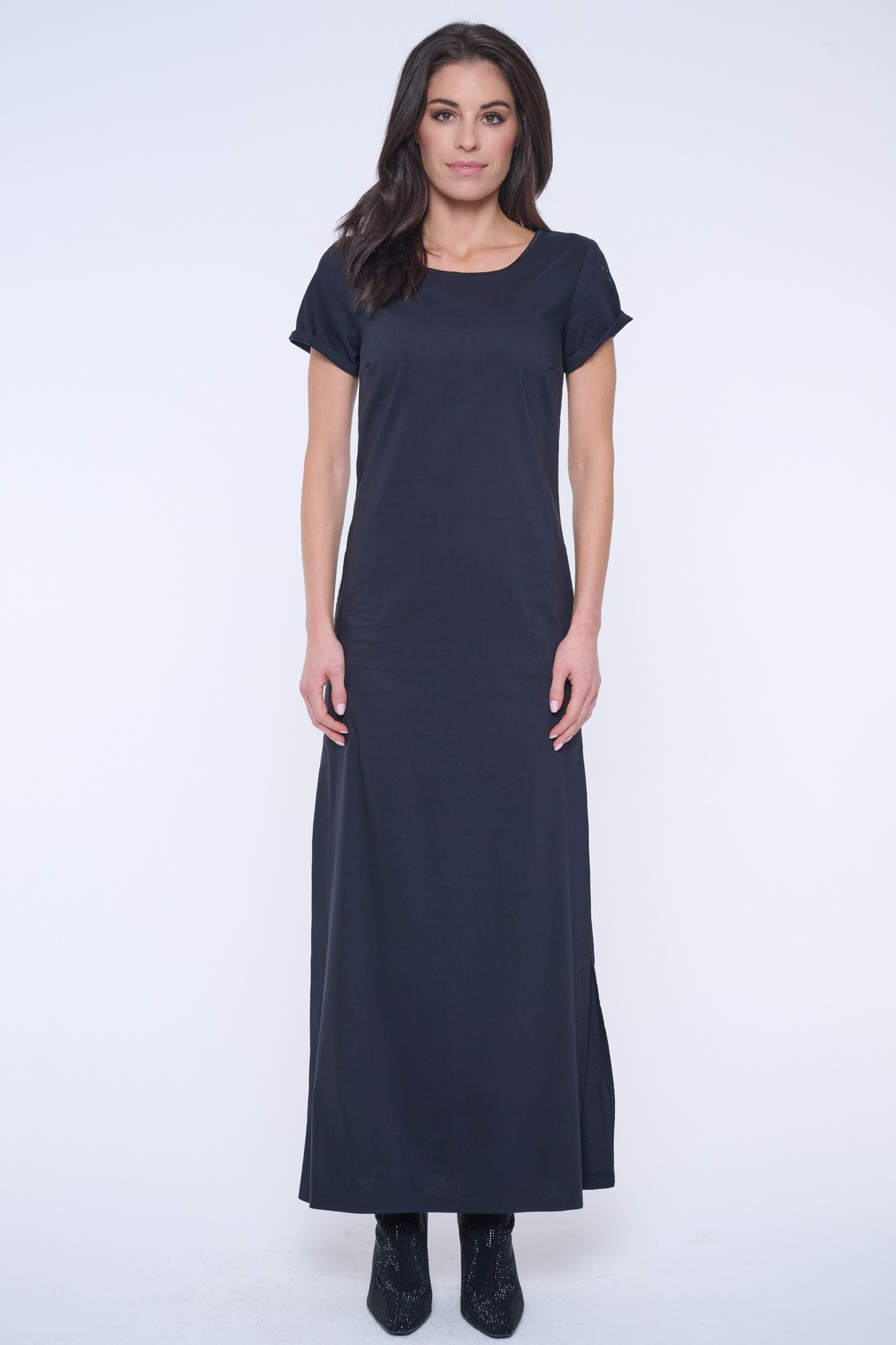 Evergreen šaty Infinite. Tentokrát poprvé v dlouhé variantě. Osvědčený střih, který padne každé postavě. Na bocích rozparky. Šaty jsou z příjemného strečového bavlněného materiálu s příměsí polyamidu. Na rukávu nápis Infinite z černých krystalů Preciosa.