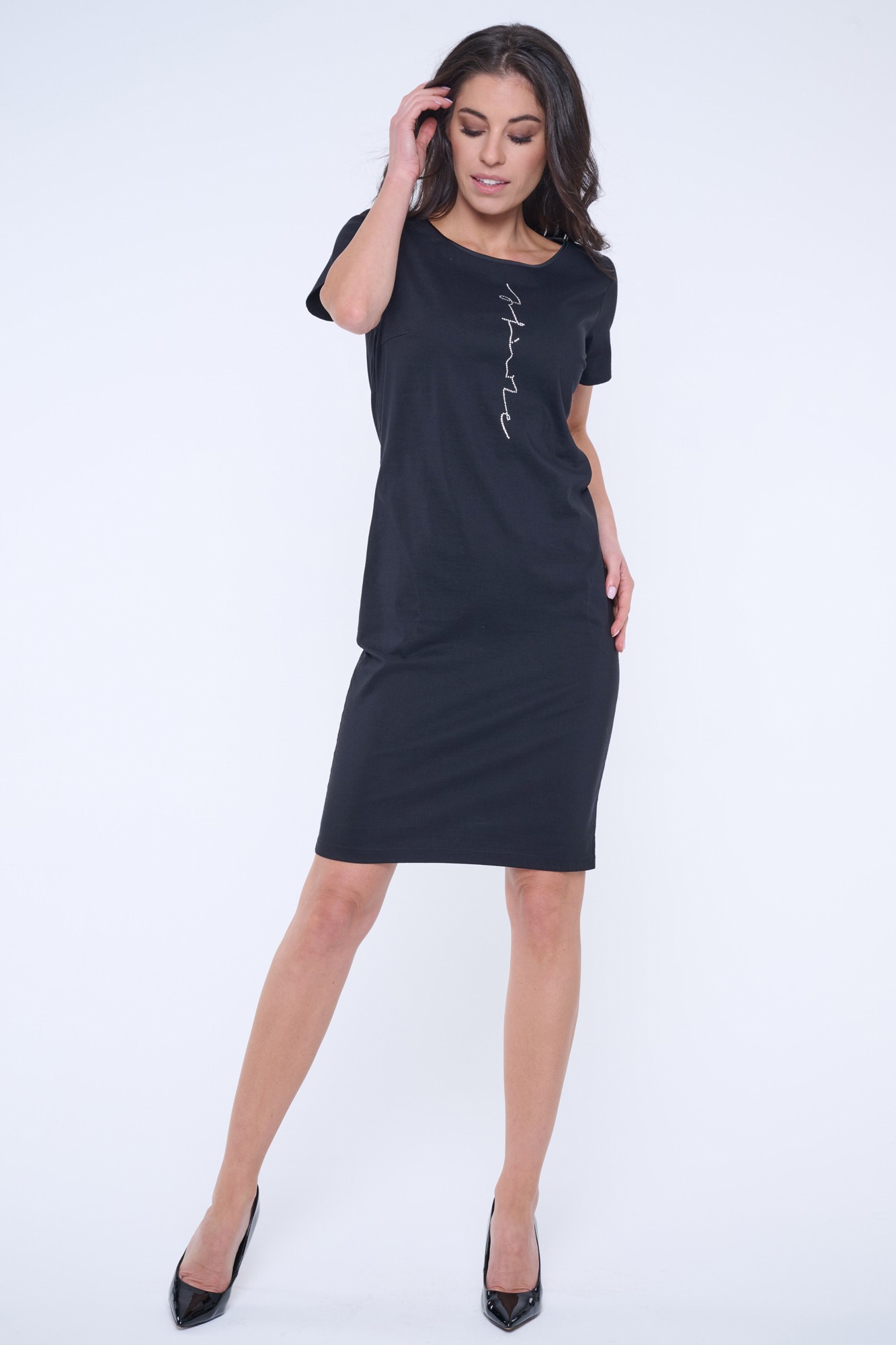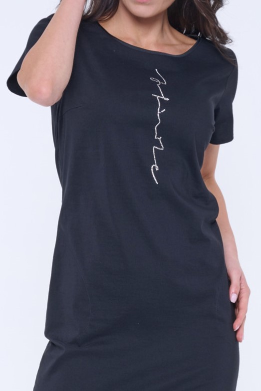 Šaty jsou z příjemného strečového bavlněného materiálu s příměsí polyamidu. Pokud dáváte přednost šatům s rukávkem, jsou vhodné i na dovolenou k moři. Na předním díle nápis Infinite z bílých krystalů Preciosa.