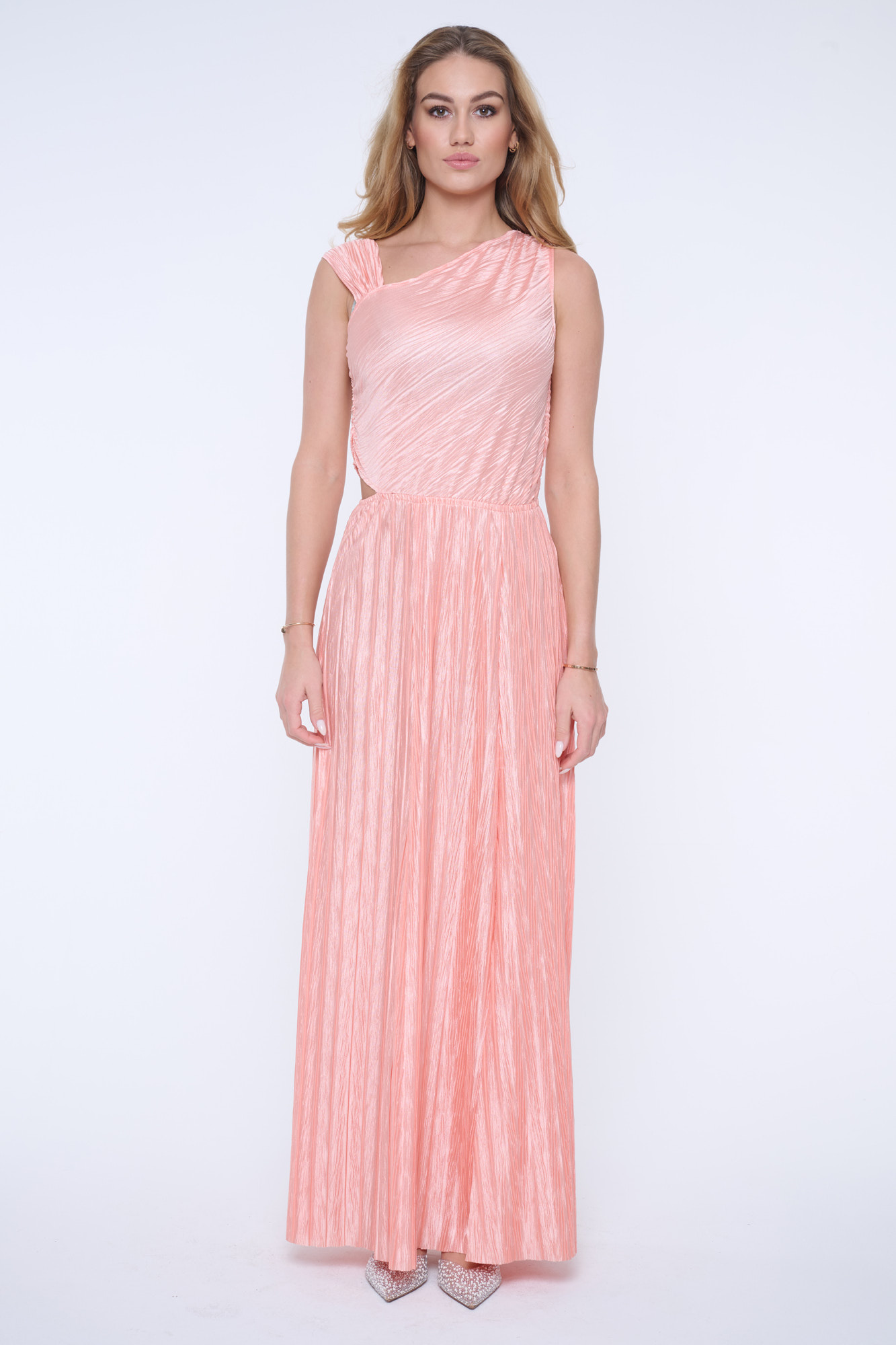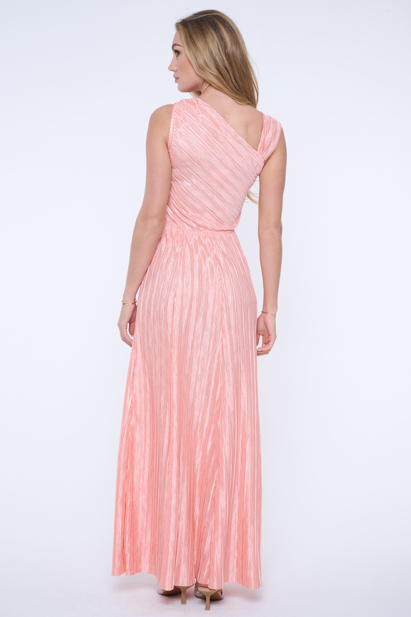 Asymetrické šaty Infinite ze zajímavého plisovaného nemačkavého materiálu. Otvor na jednom boku. Šaty jsou vhodné na svatbu, garden party nebo k teniskám do města.