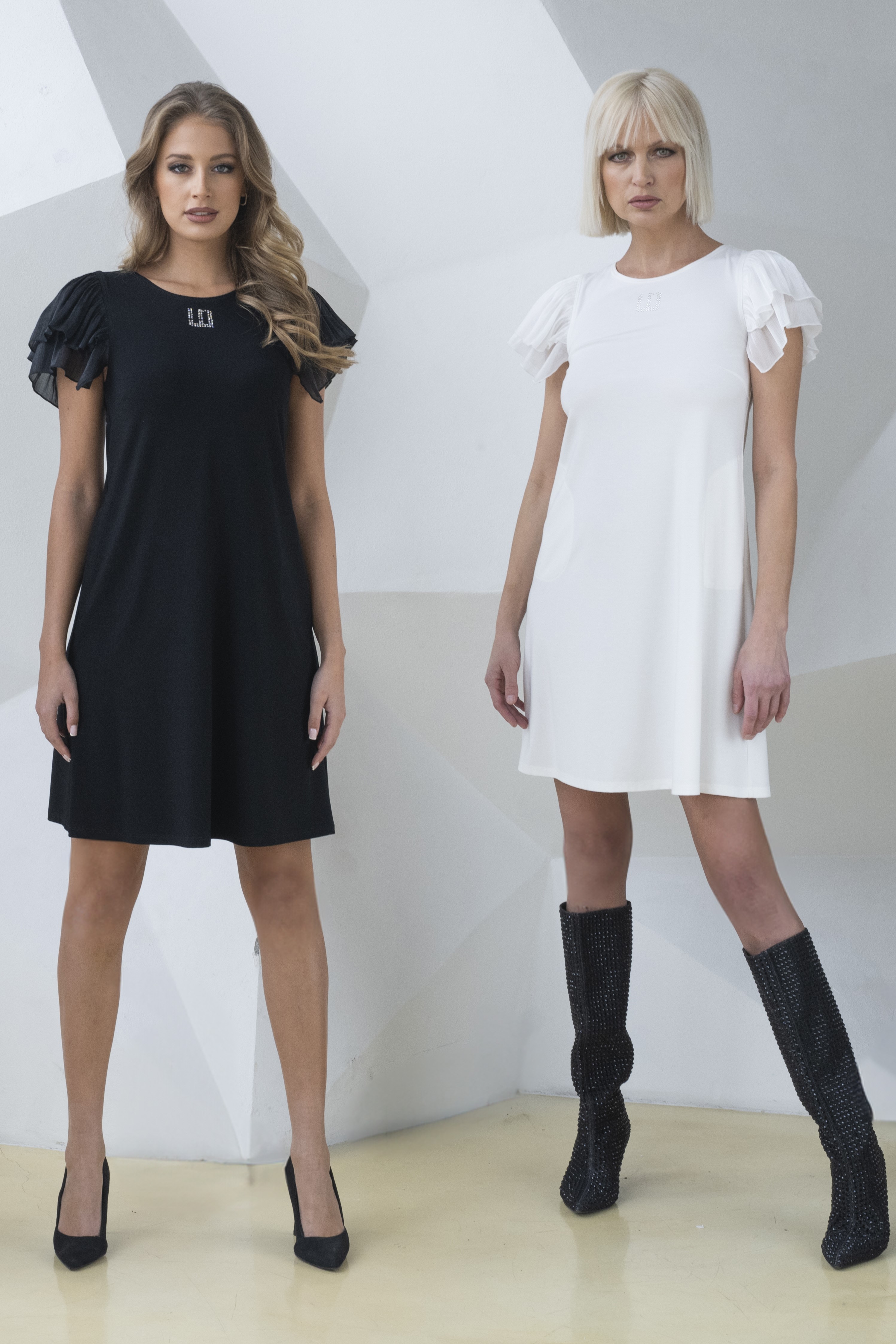 Trendy krátké šaty do áčka. Rukávy z volánku z efektního lesklého materiálu. Na předním díle minimalistický typ nového loga INF z krystalů Preciosa.