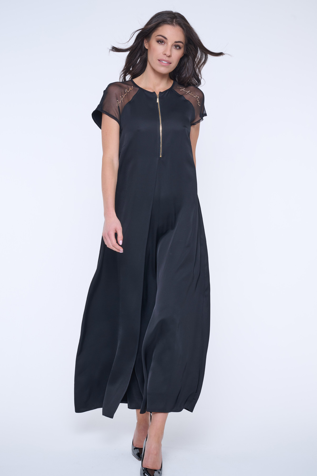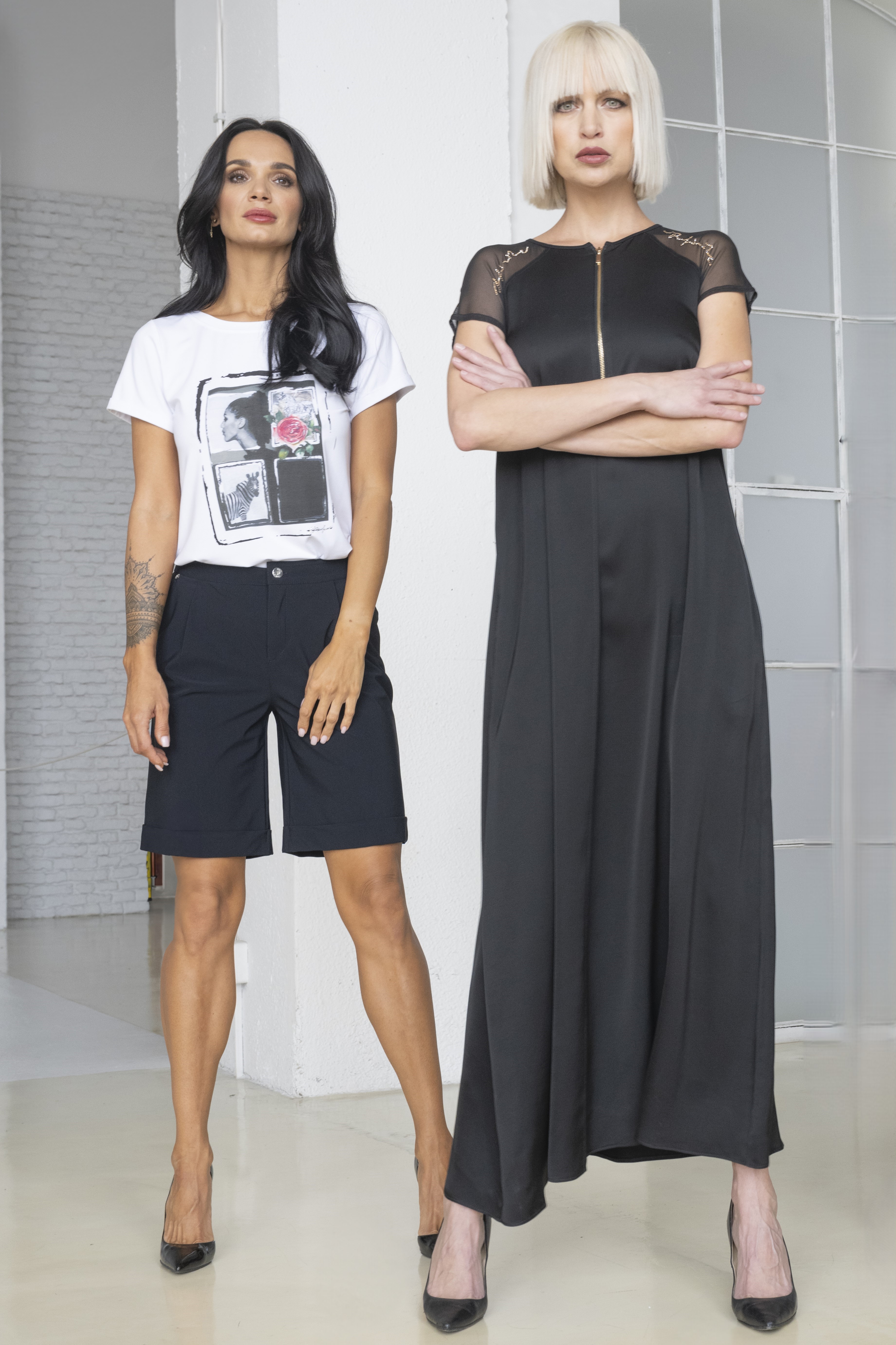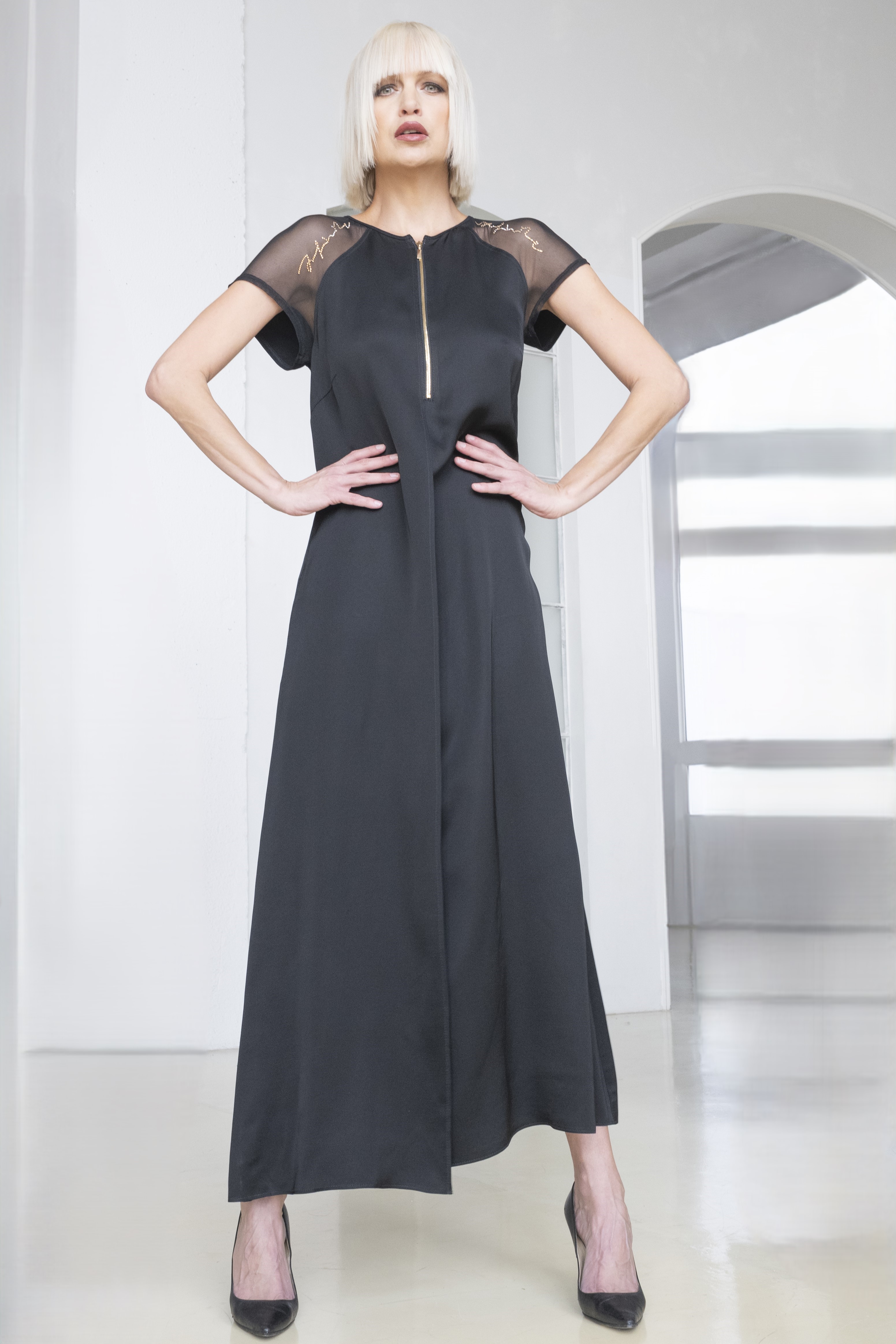 Stříbrný zip ve výstřihu a minimalistické logo INF z krystalů Swarovski.