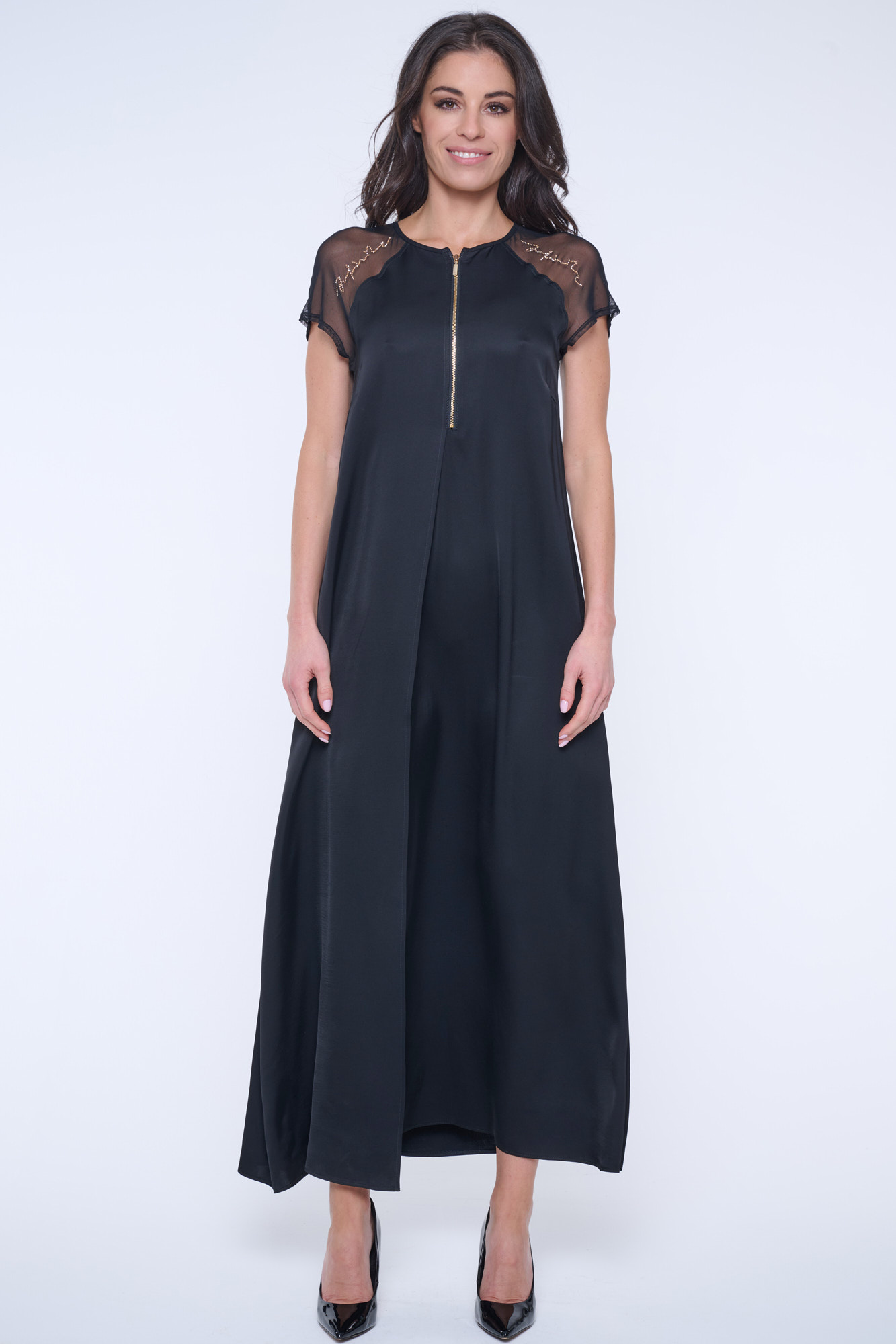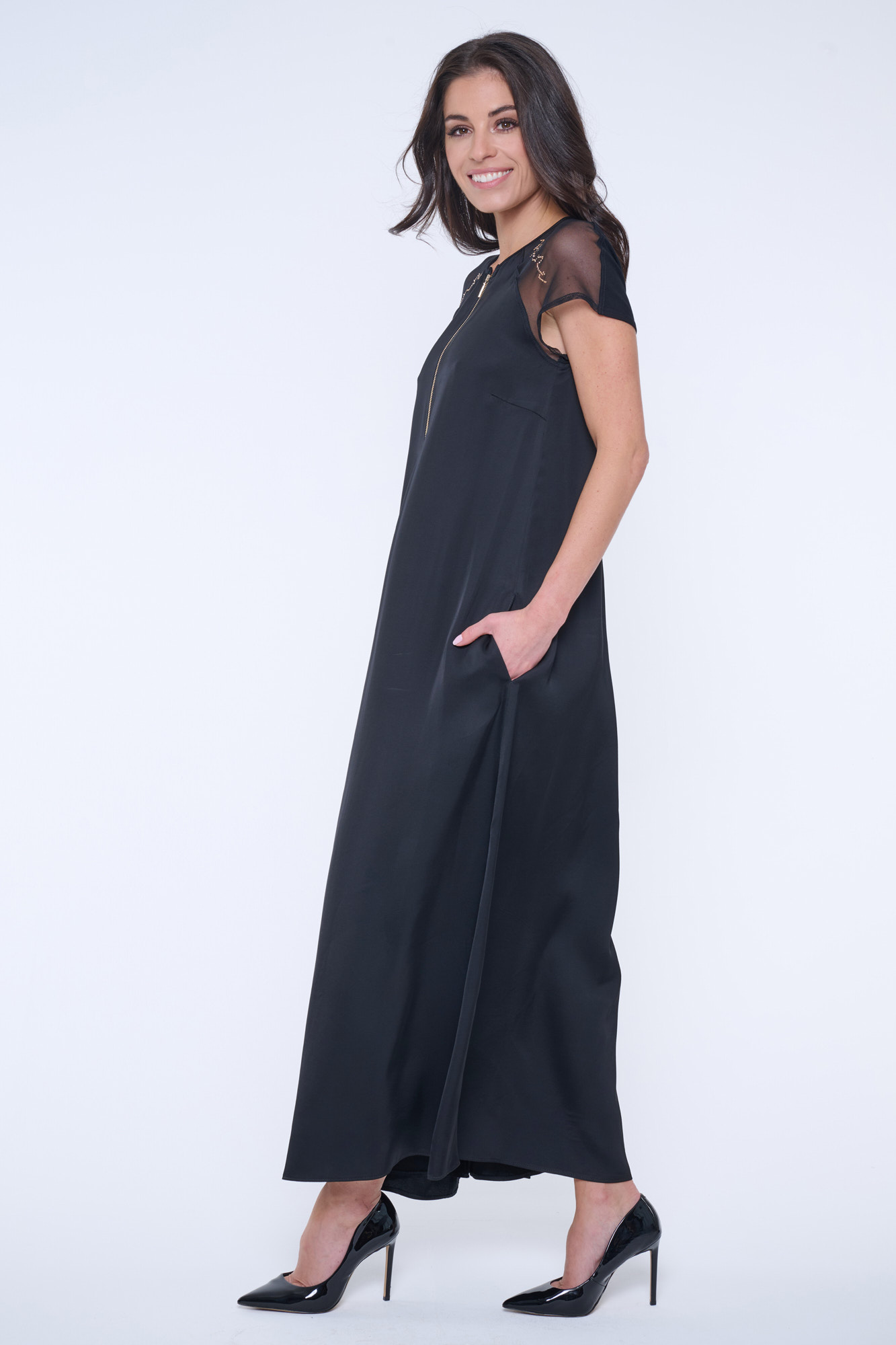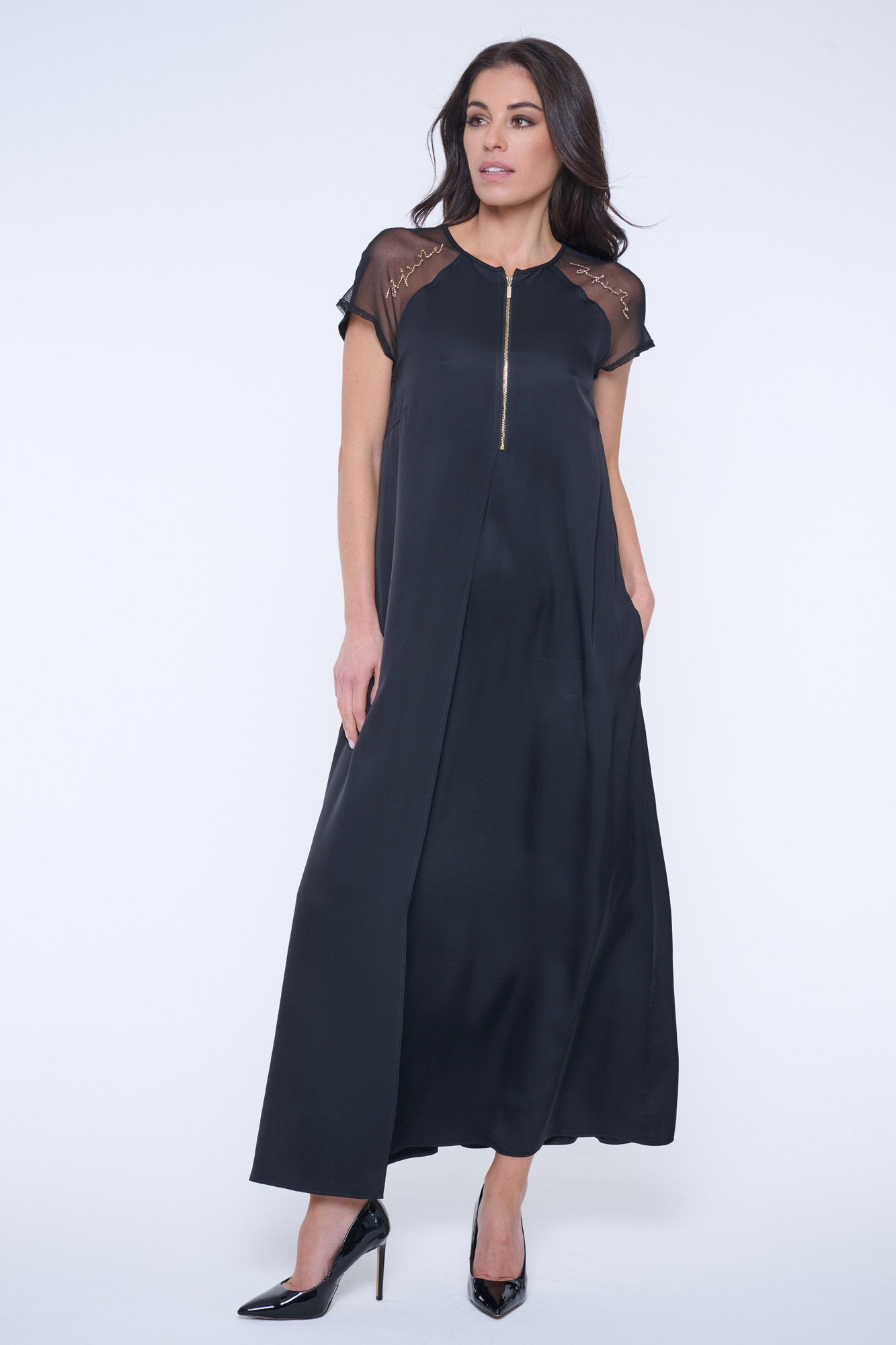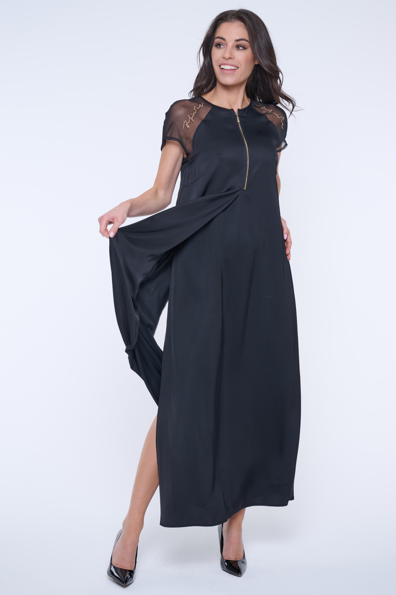 Stříbrný zip ve výstřihu a minimalistické logo INF z krystalů Swarovski.