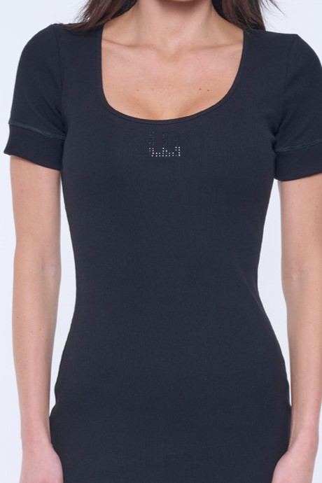 Šaty s výstřihem ze strečového "rib" úpletu, který díky svému unikátnímu složení bavlny, modalu a elastanu je velmi pohodlný na nošení. Na předním díle minimalistický nový typ loga Infinite z černých krystalů Preciosa.