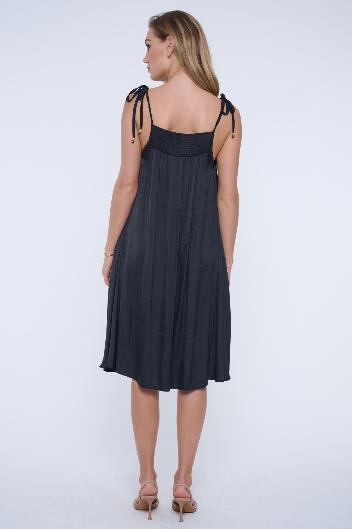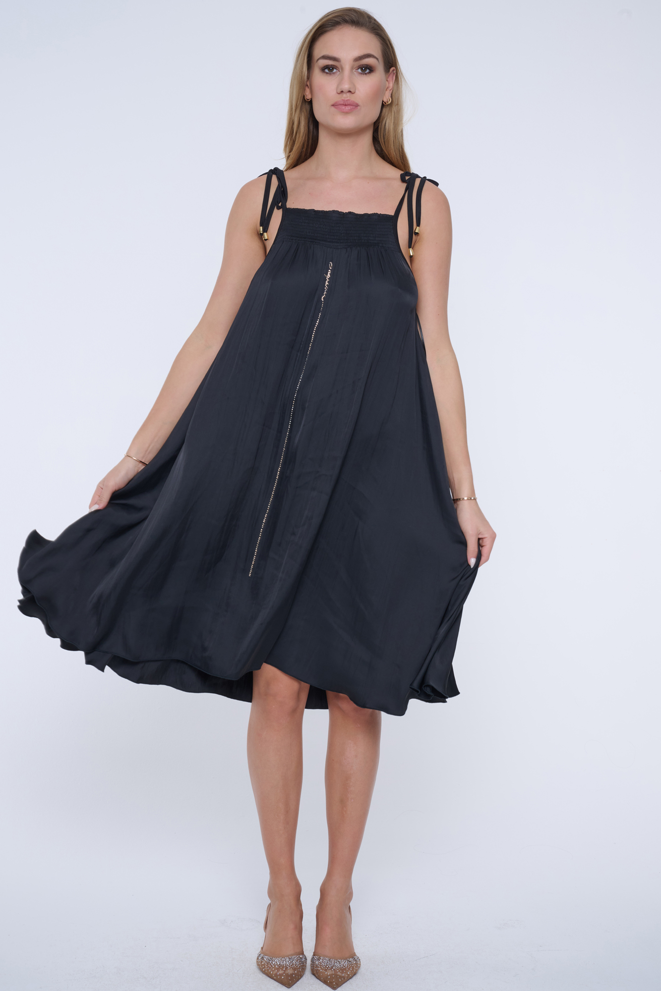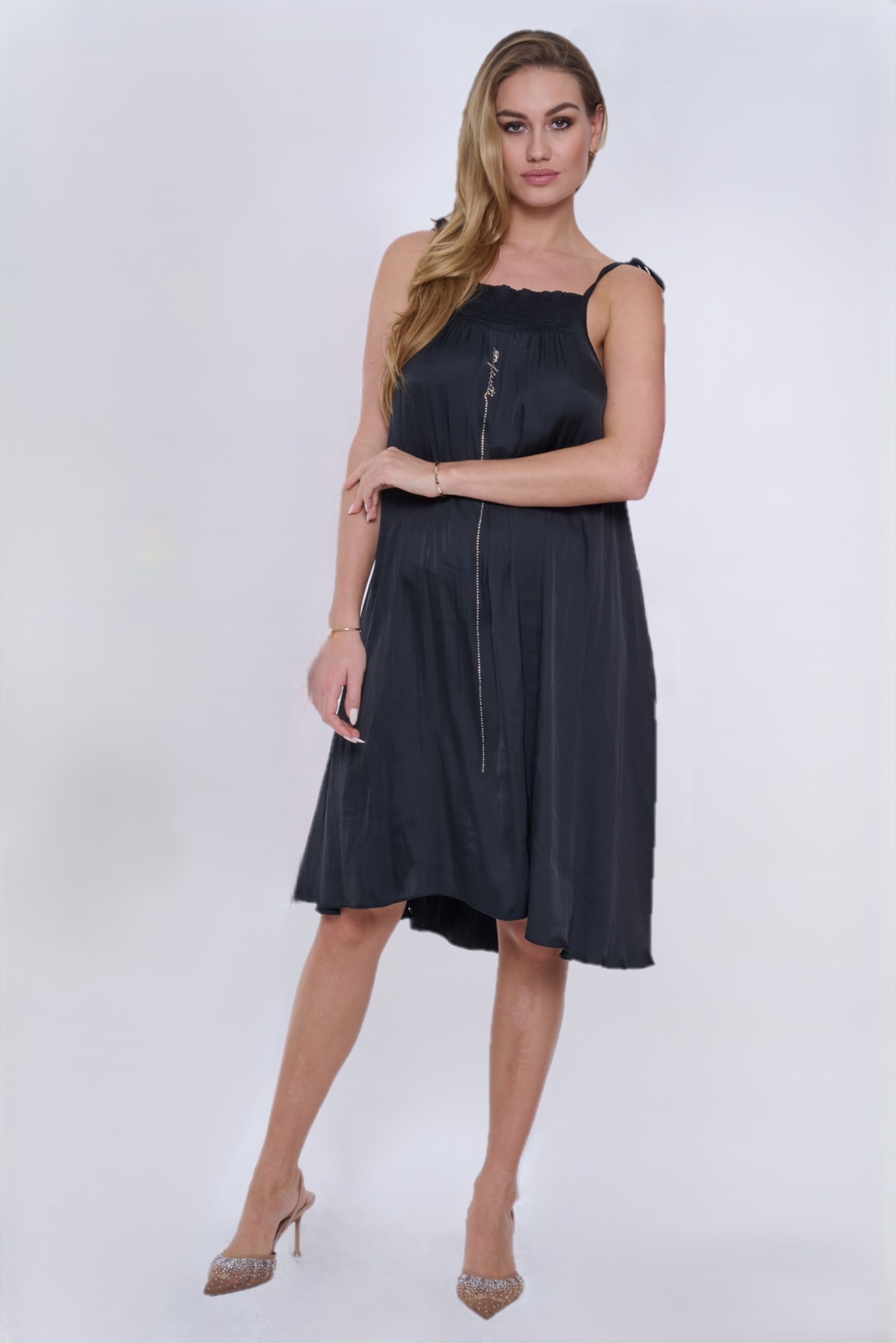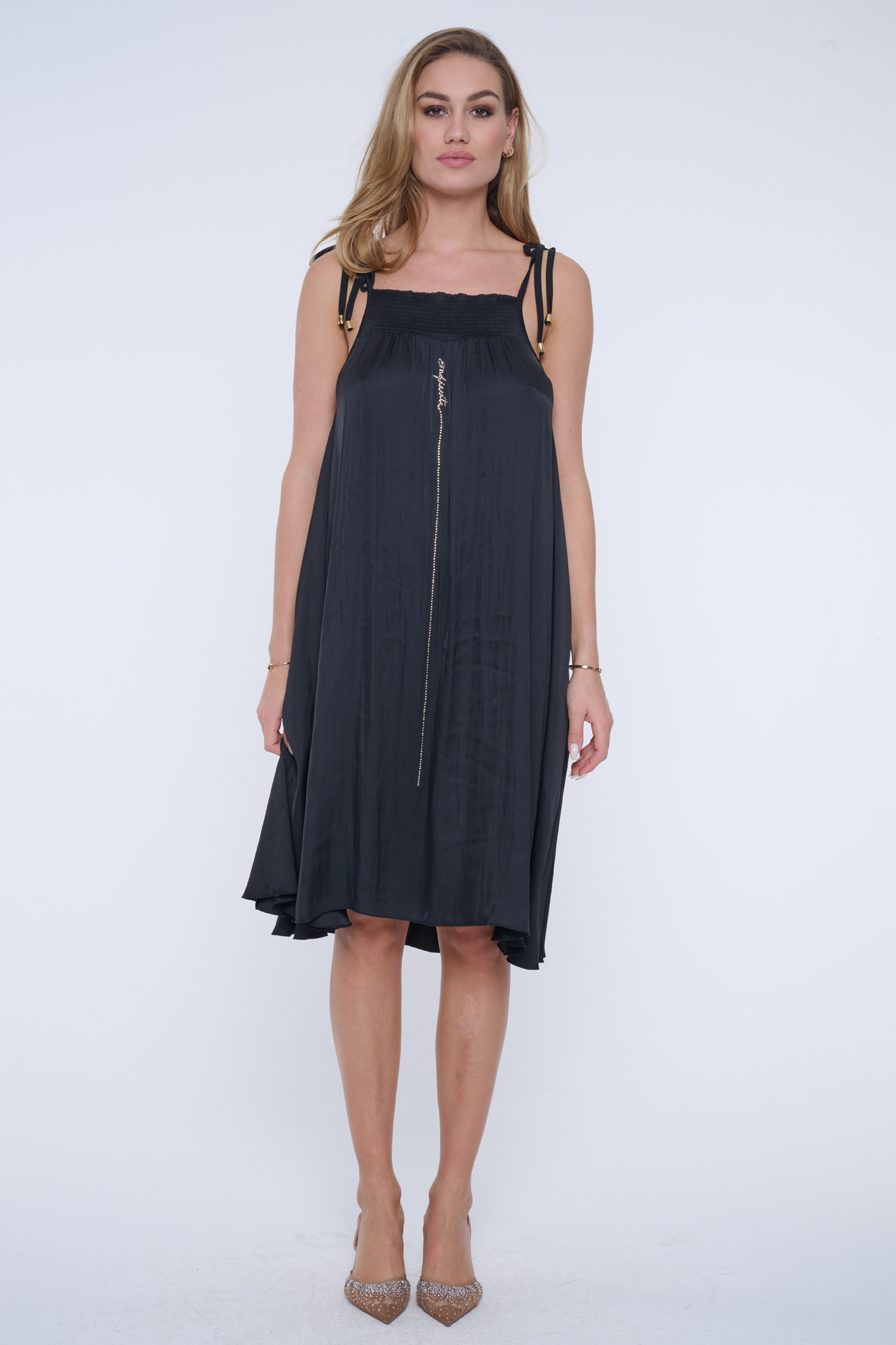 Krátké vzdušné šaty INF na úzká ramínka, které lze libovolně utáhnout. Ušity z nového typu materiálu s memory efektem. Na předním díle efektní svislá dlouhá linka s nápisem Infinite ze zlatých krystalů Preciosa.Ve výstřihu "žabičkové šití". Možnost stáhnutí páskem na bocích nebo v pase.