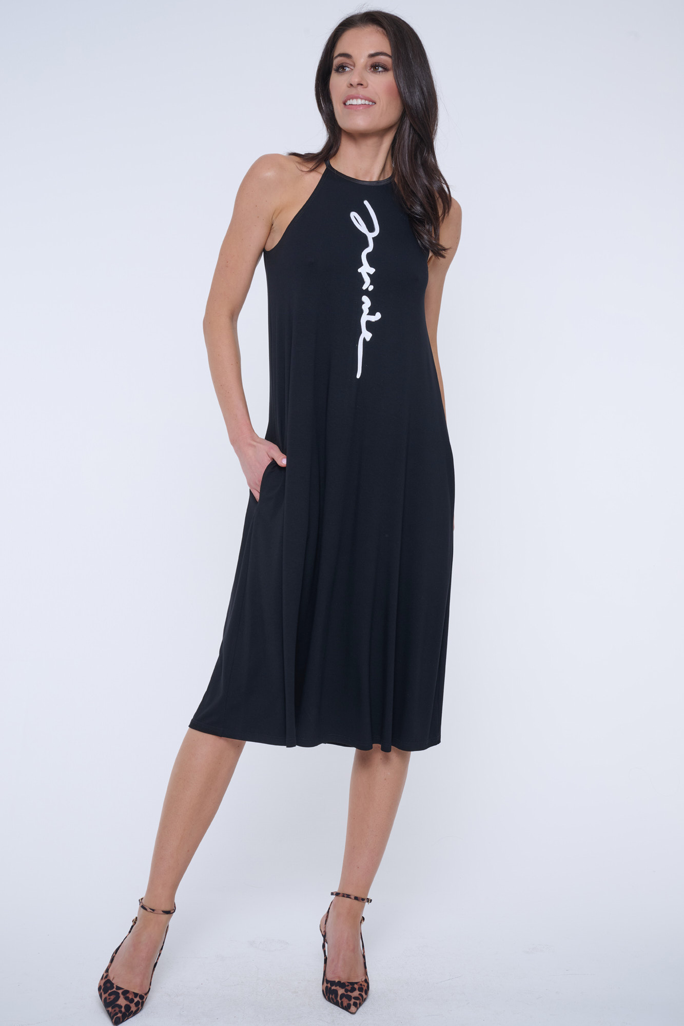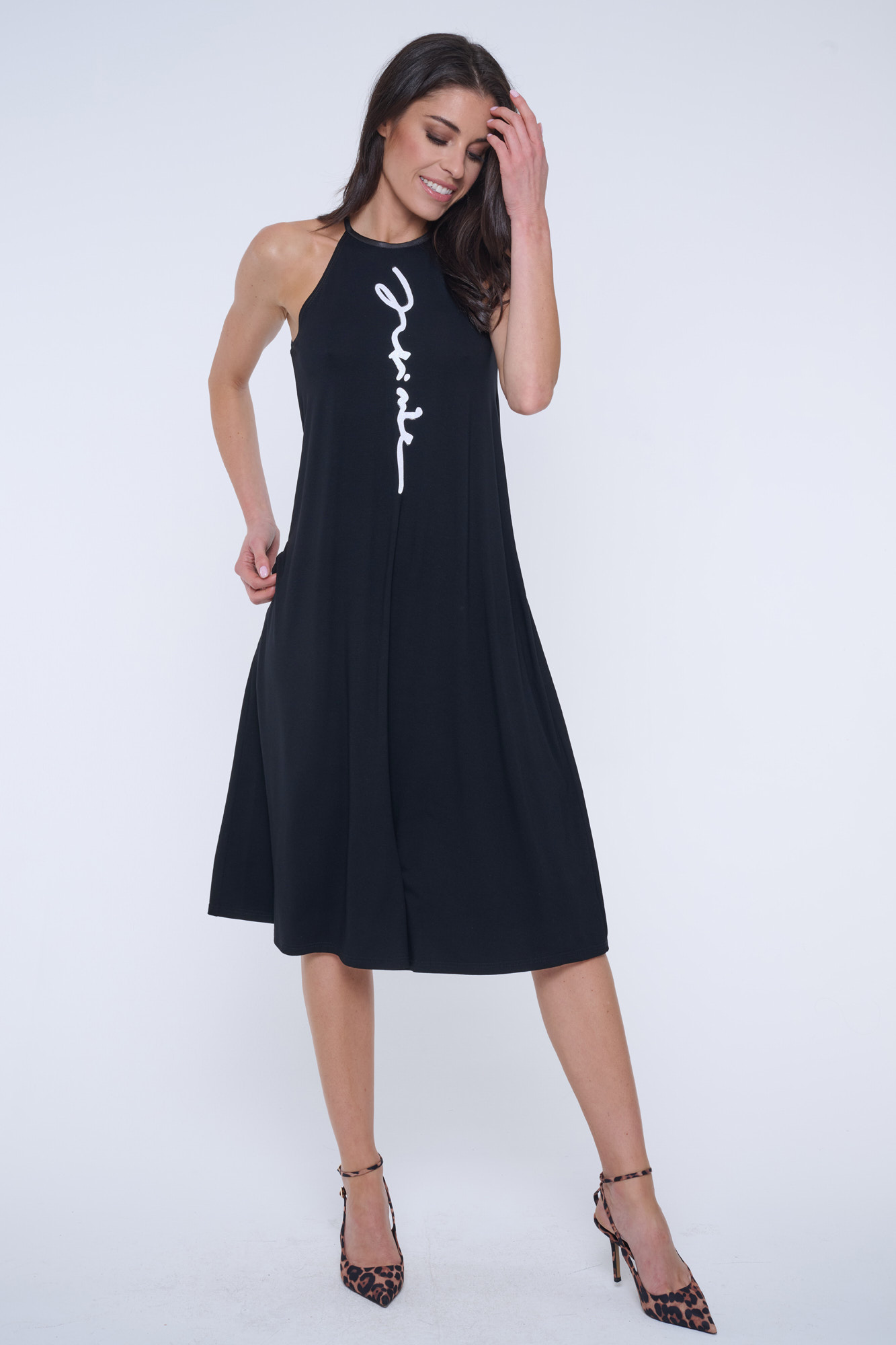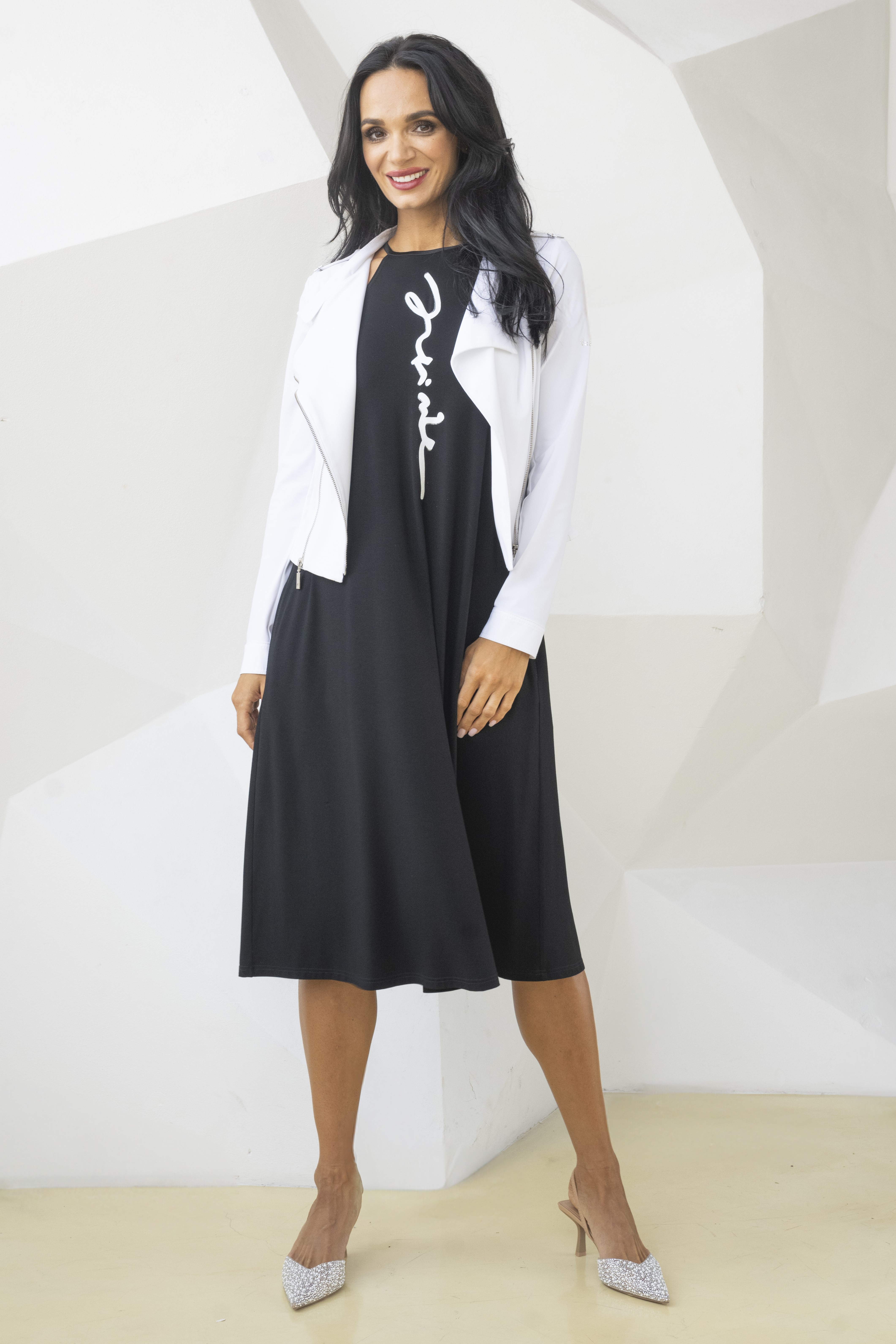 Úpletové šaty do áčka. Na předním díle bílý glitrový tisk Infinite.