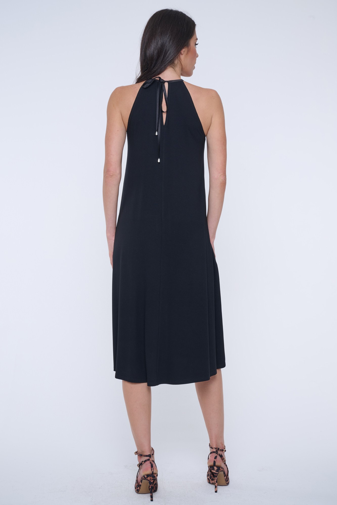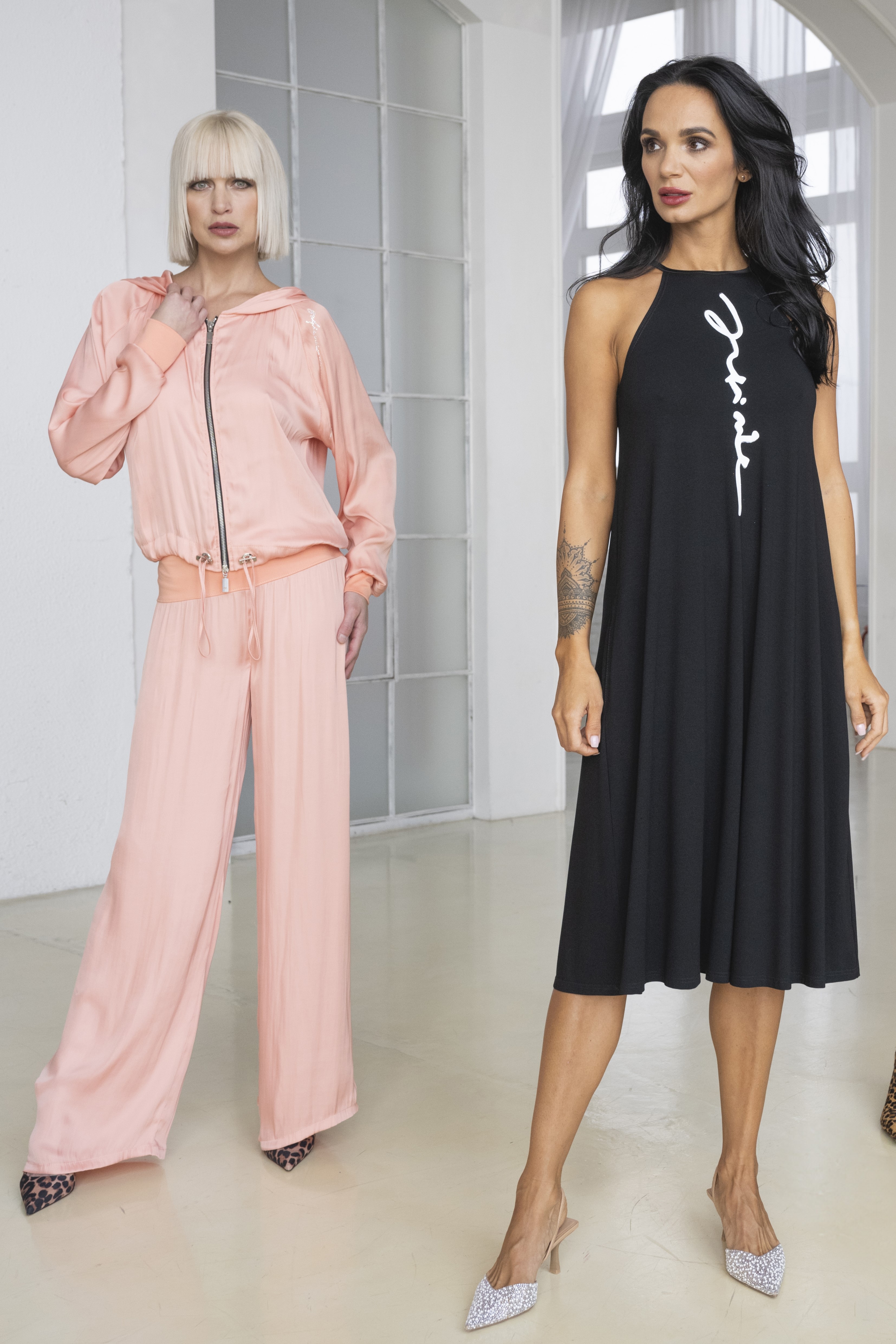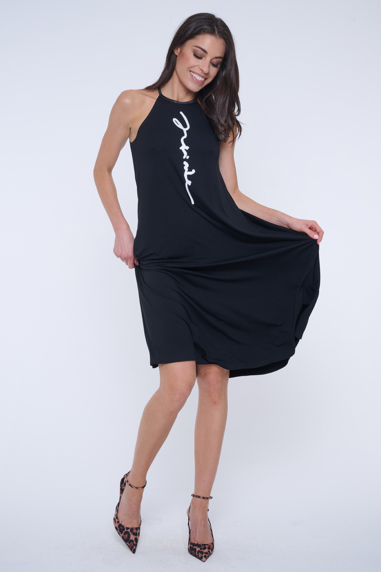 Úpletové šaty do áčka. Na předním díle bílý glitrový tisk Infinite.