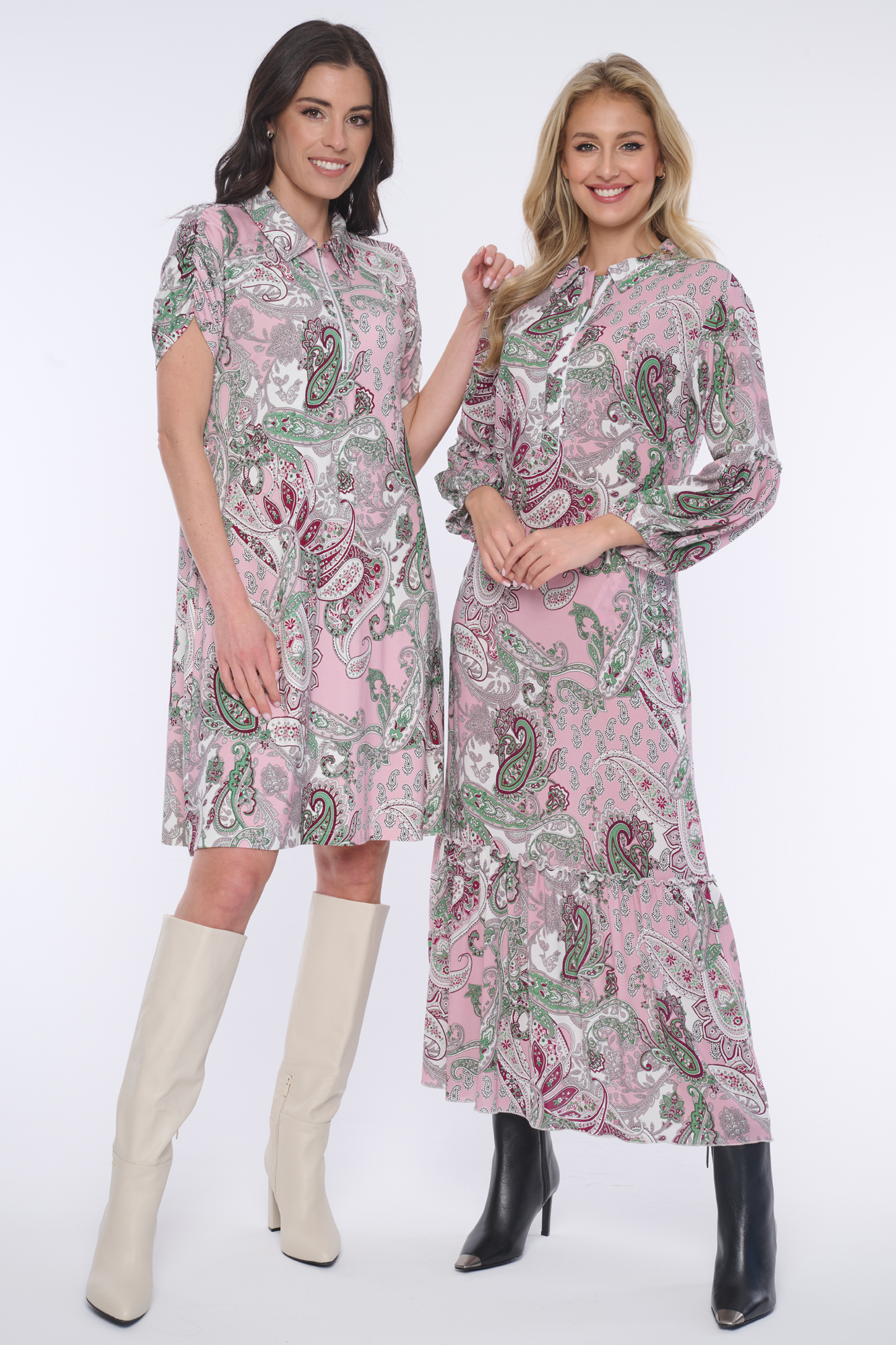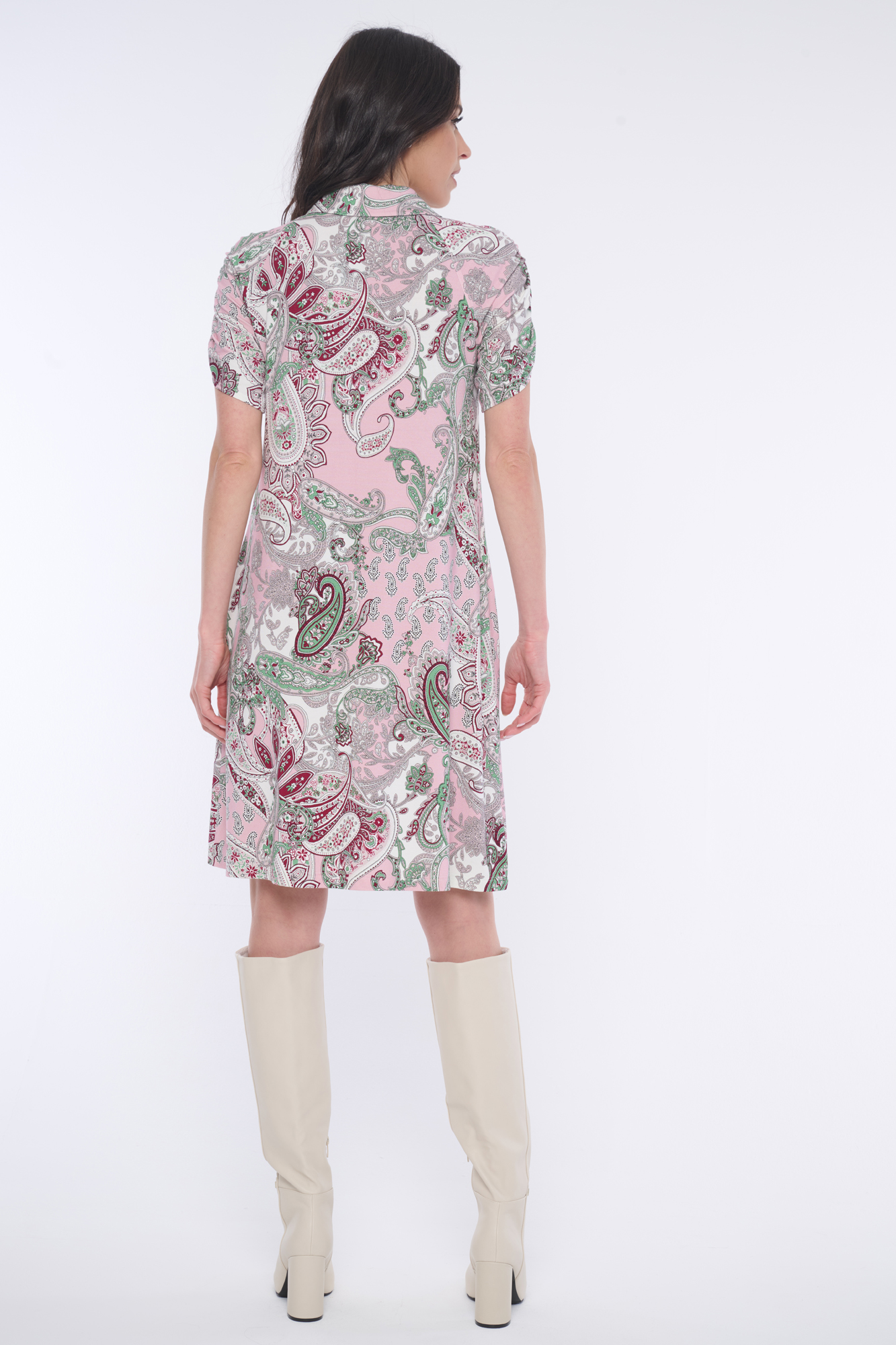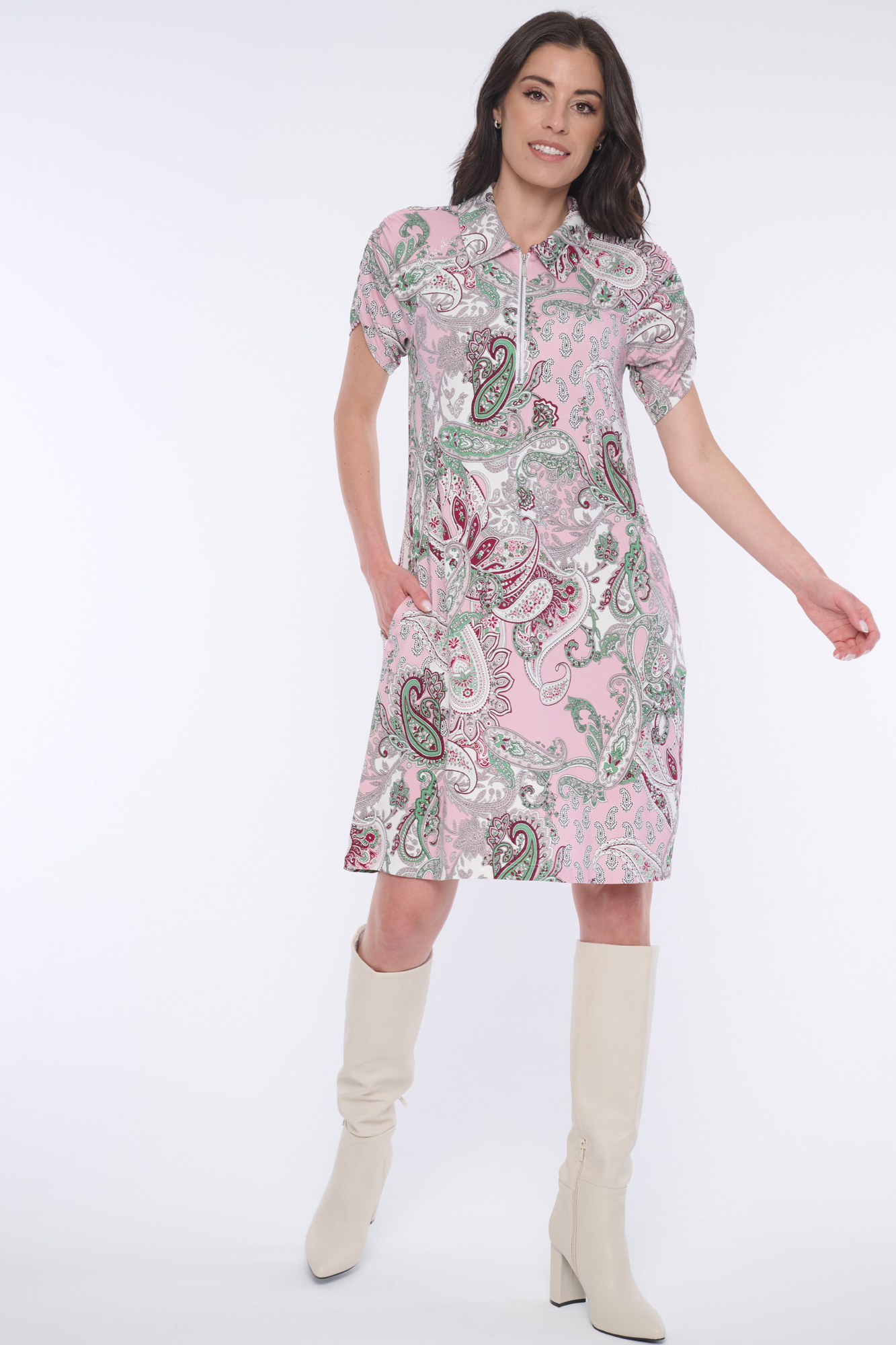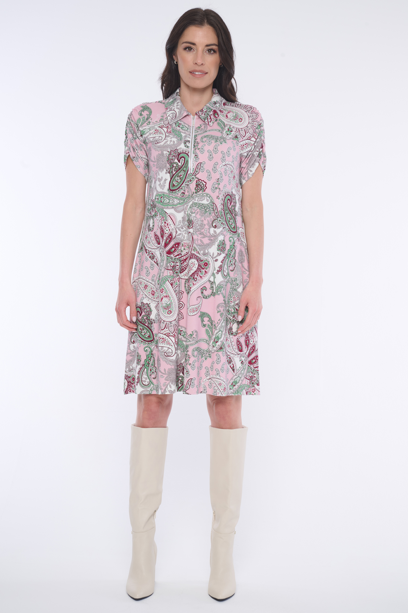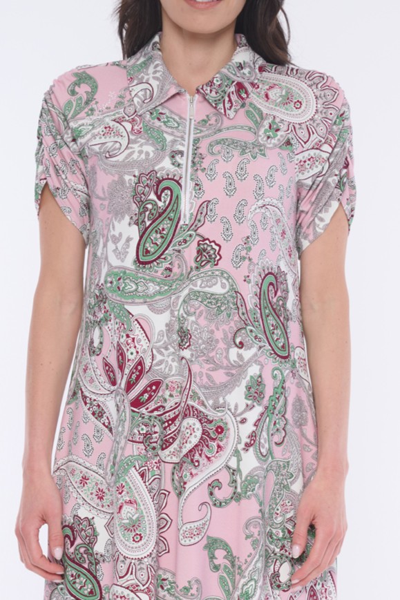 Úpletové šaty košilového střihu do "áčka" z kašmírového vzoru. Minimalistické logo Infinite z krystalů Preciosa. Zlatý zip.