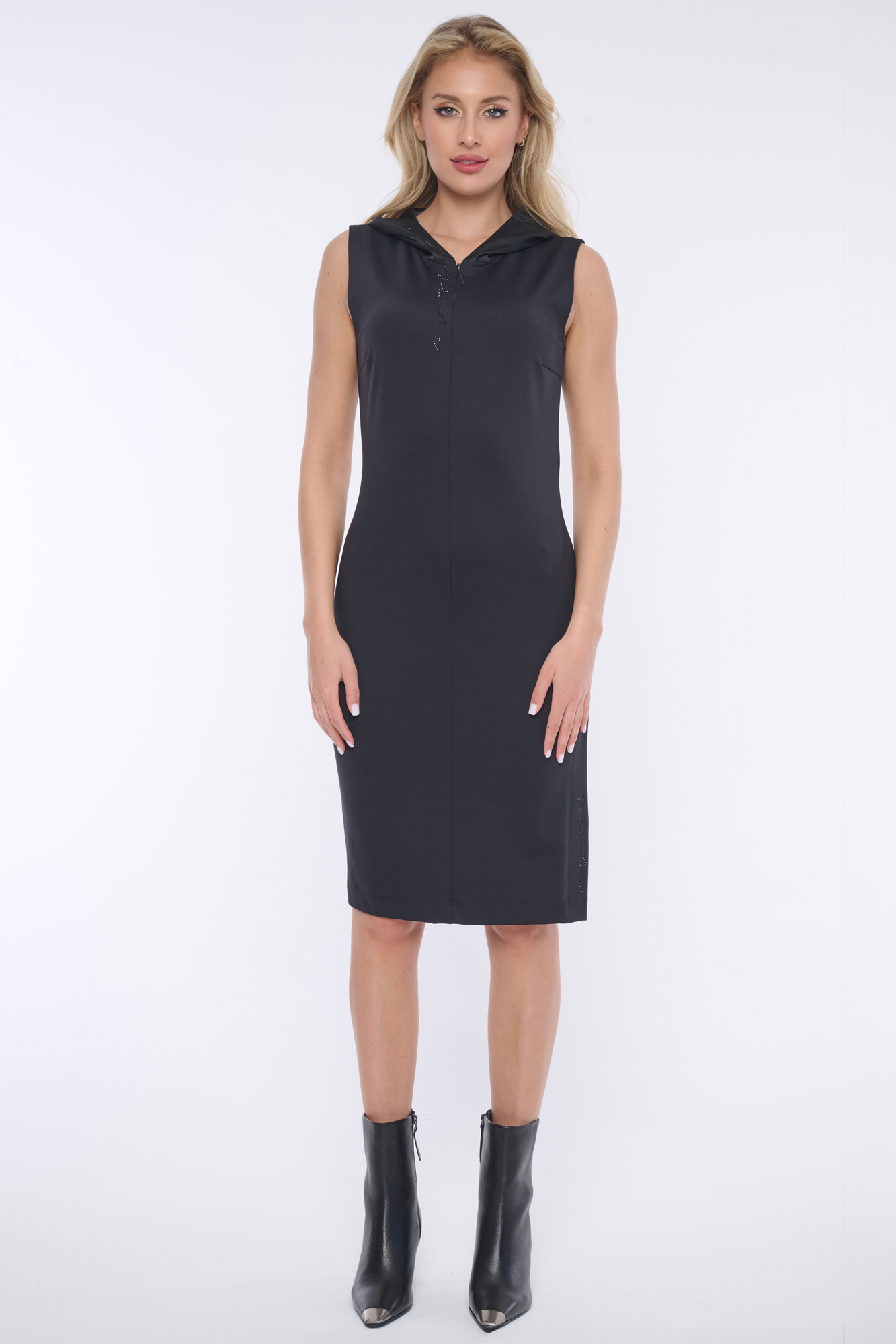 Elegantní tubové šaty s kapucí z úžasného strečového polyamidového úpletu. Tento materiál "drží" postavu a je téměř "nezničitelný". Ve výstřihu a v rozparku je nápis z černých krystalů Preciosa. Ve výstřihu minimalistický zip.