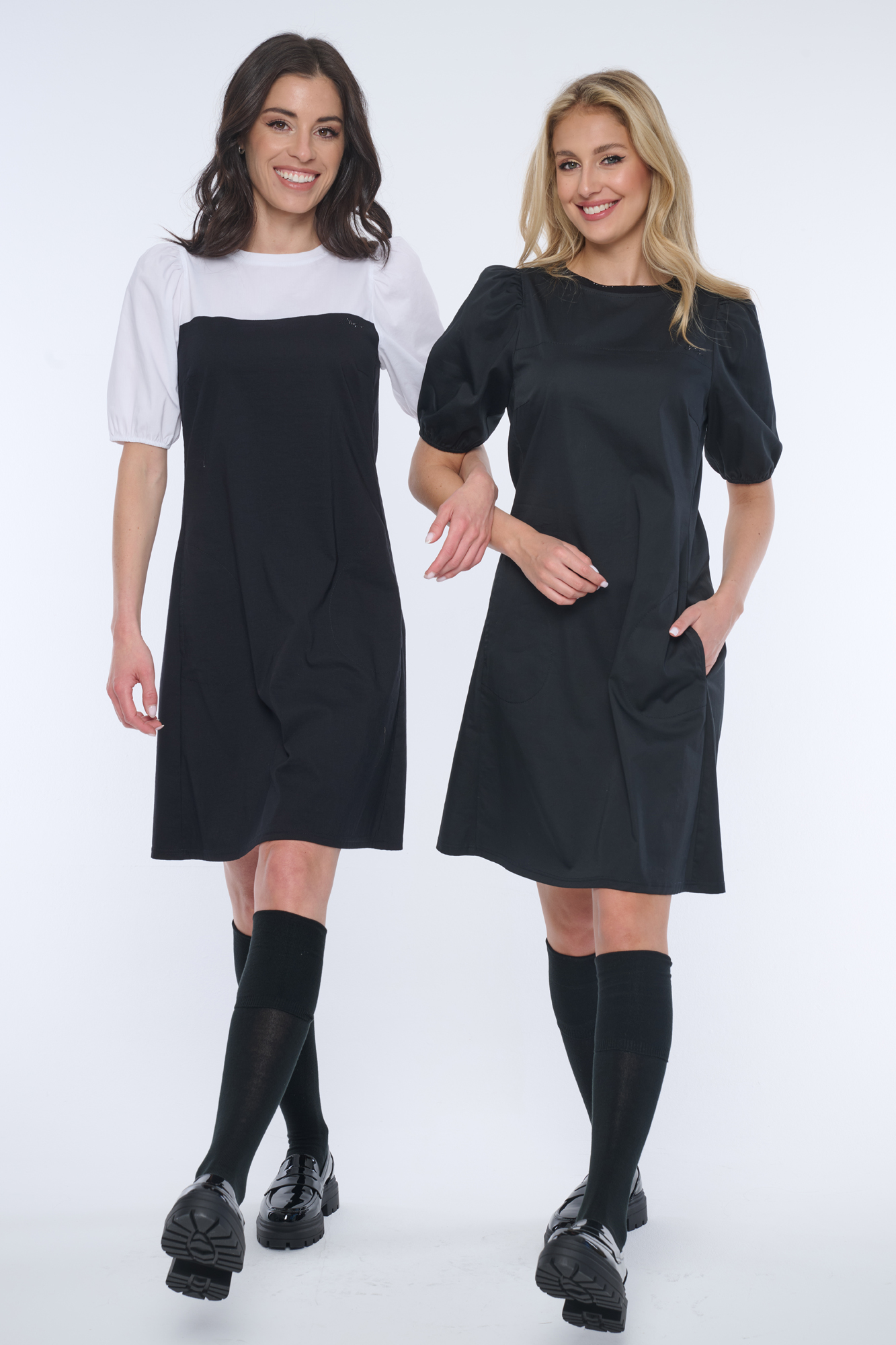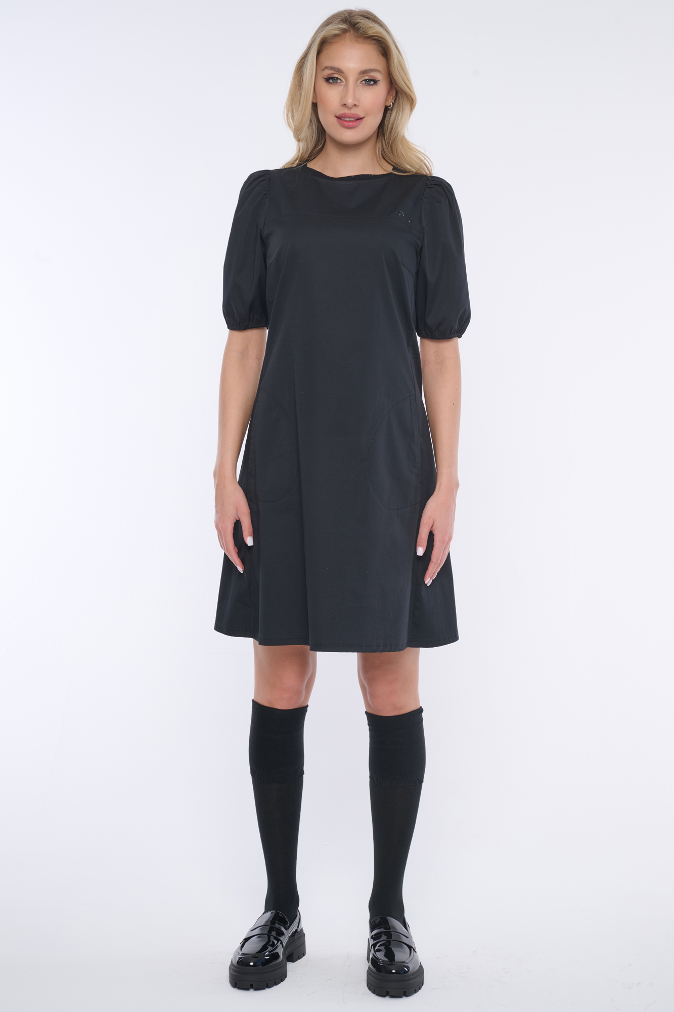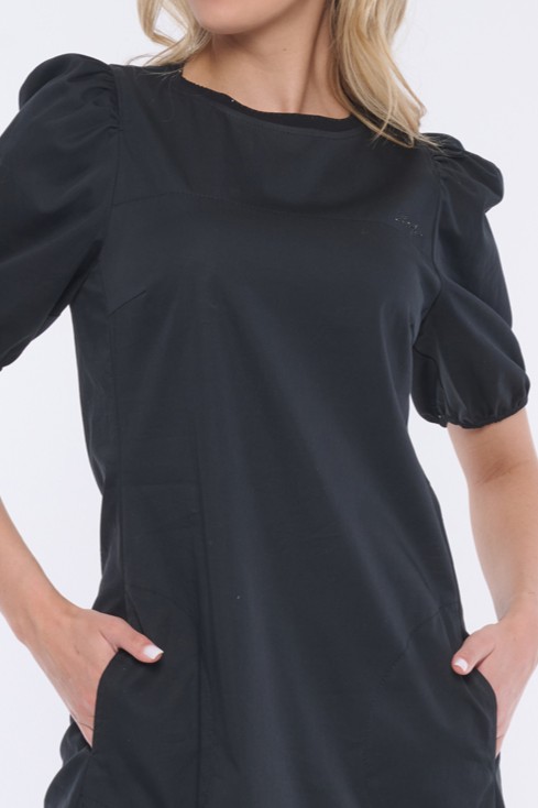 Elegantní šaty s balónkovými rukávky. Nebojte se tohoto střihu, rozhodně opticky nezvětšuje ramena. Minimalistické logo INF z černých krystalů Preciosa.