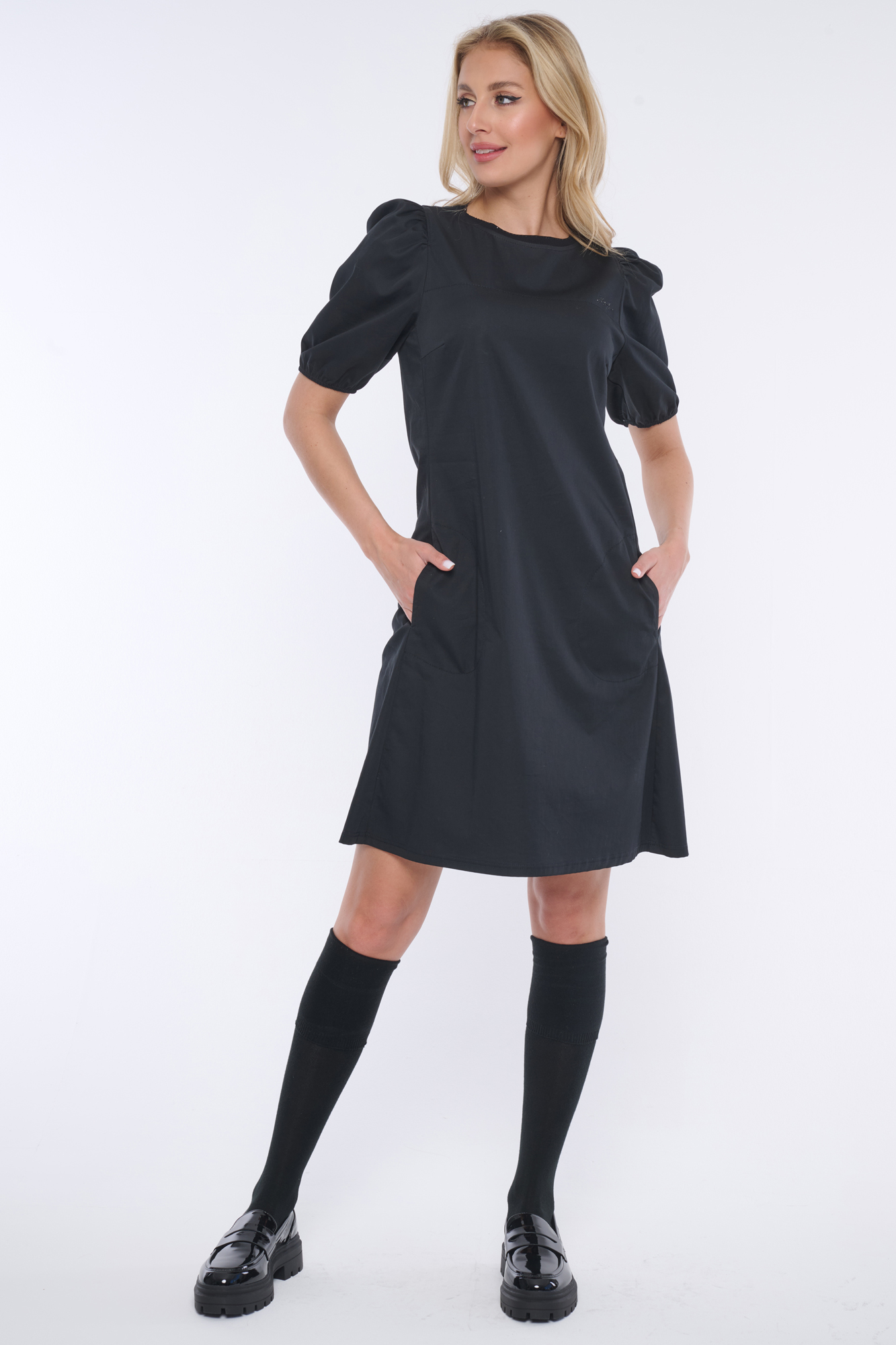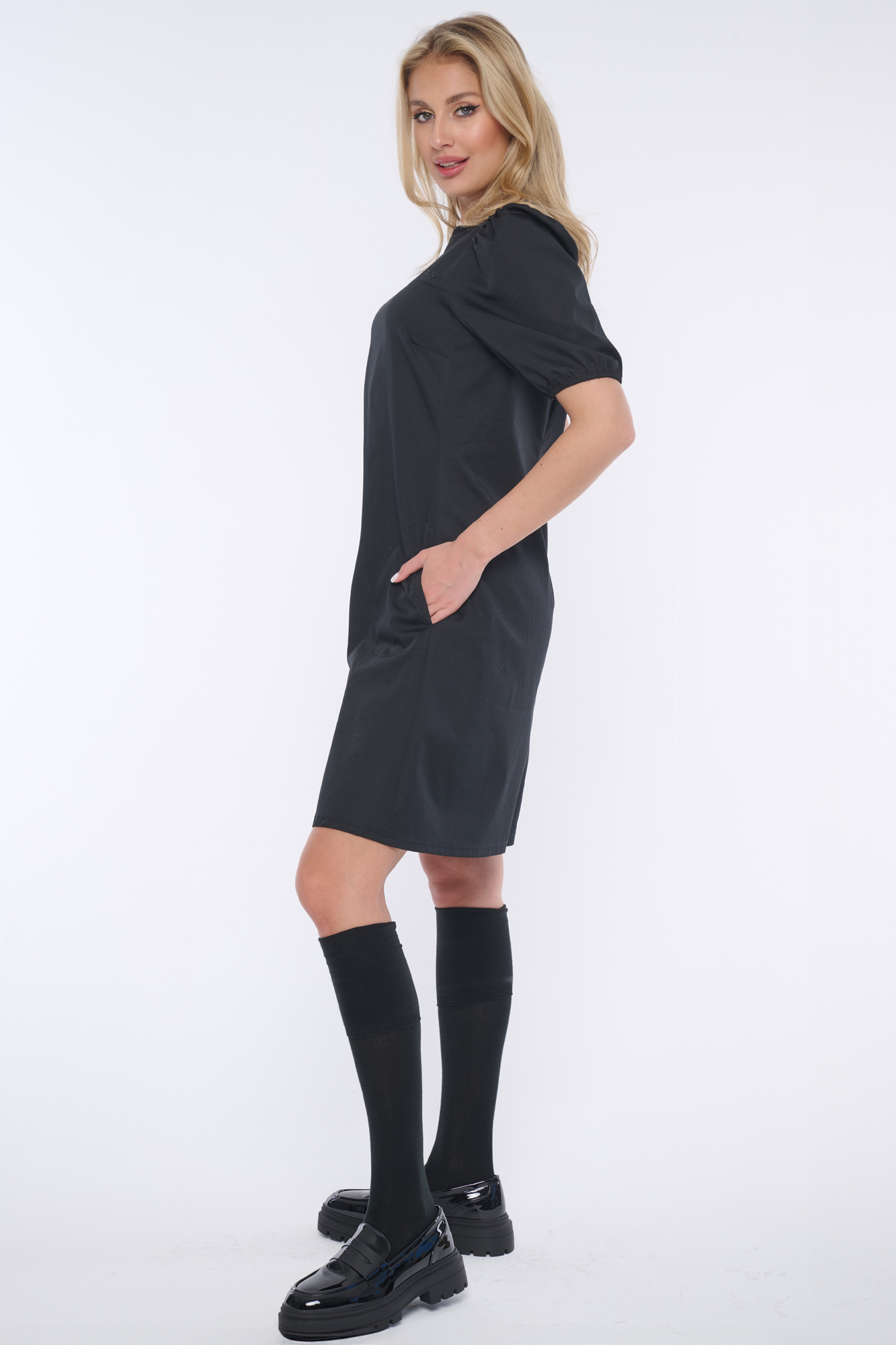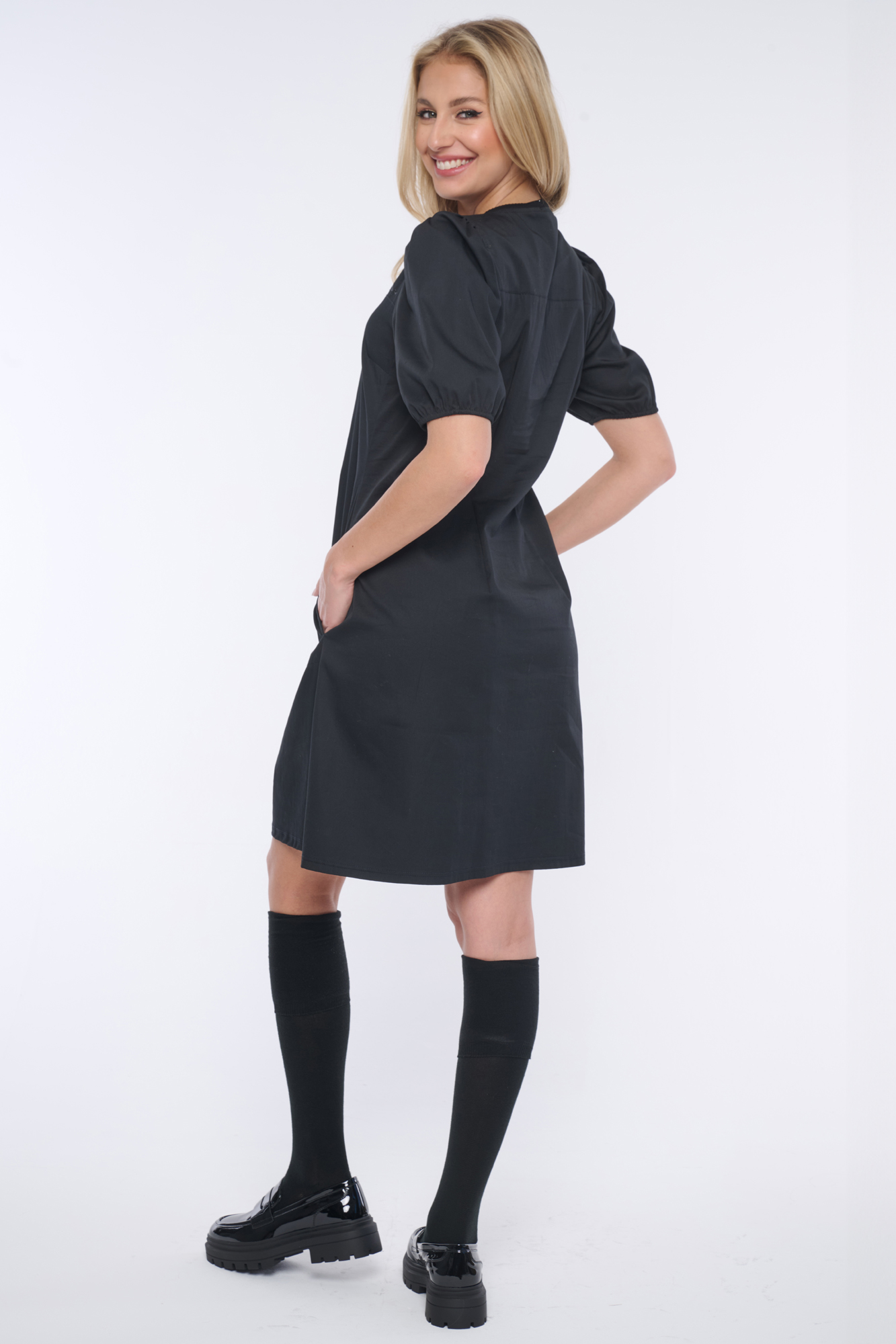 Elegantní šaty s balónkovými rukávky. Nebojte se tohoto střihu, rozhodně opticky nezvětšuje ramena. Minimalistické logo INF z černých krystalů Preciosa.