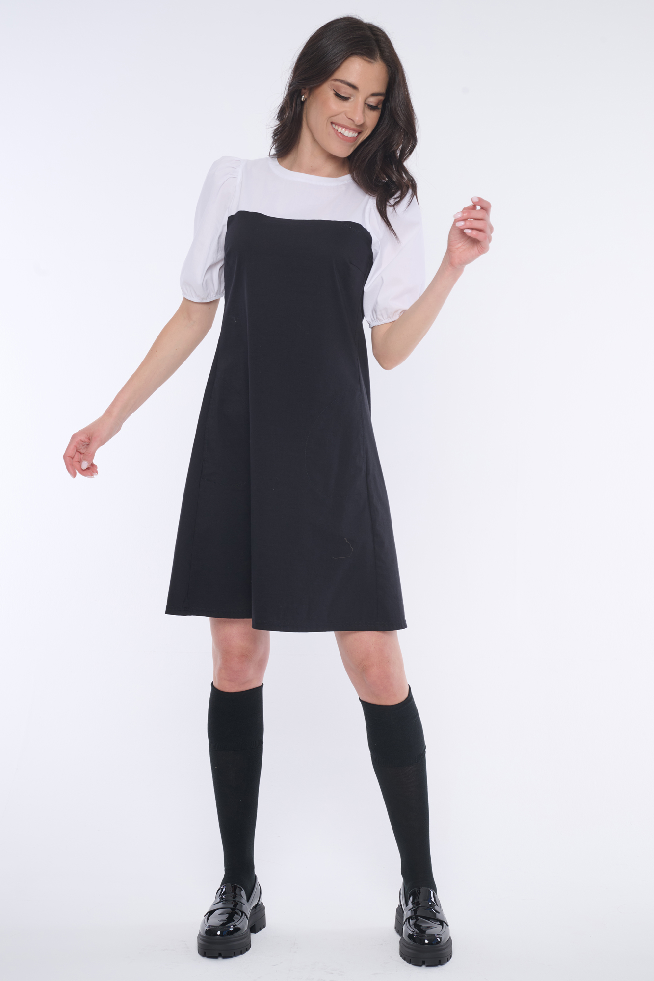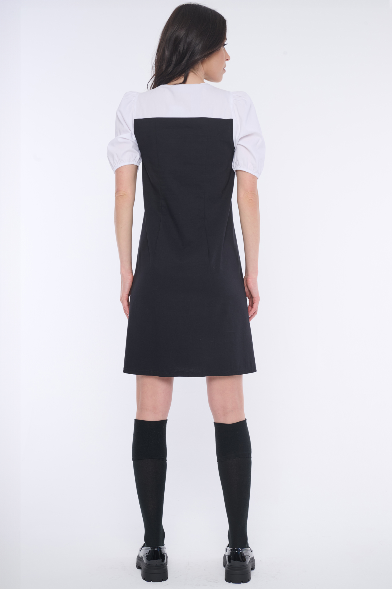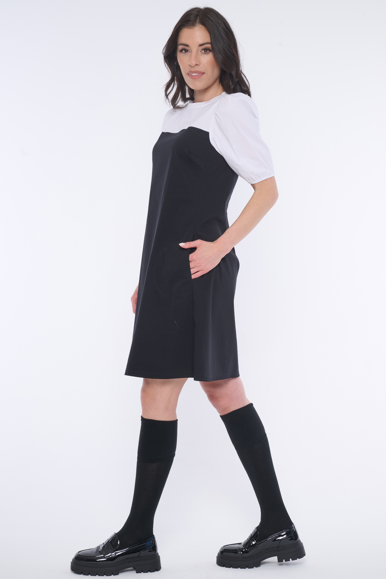 Elegantní šaty s balónkovými rukávky. Nebojte se tohoto střihu, rozhodně opticky nezvětšuje ramena. Minimalistické logo INF z černých krystalů Preciosa.