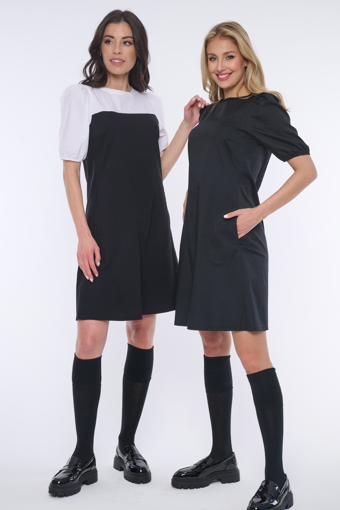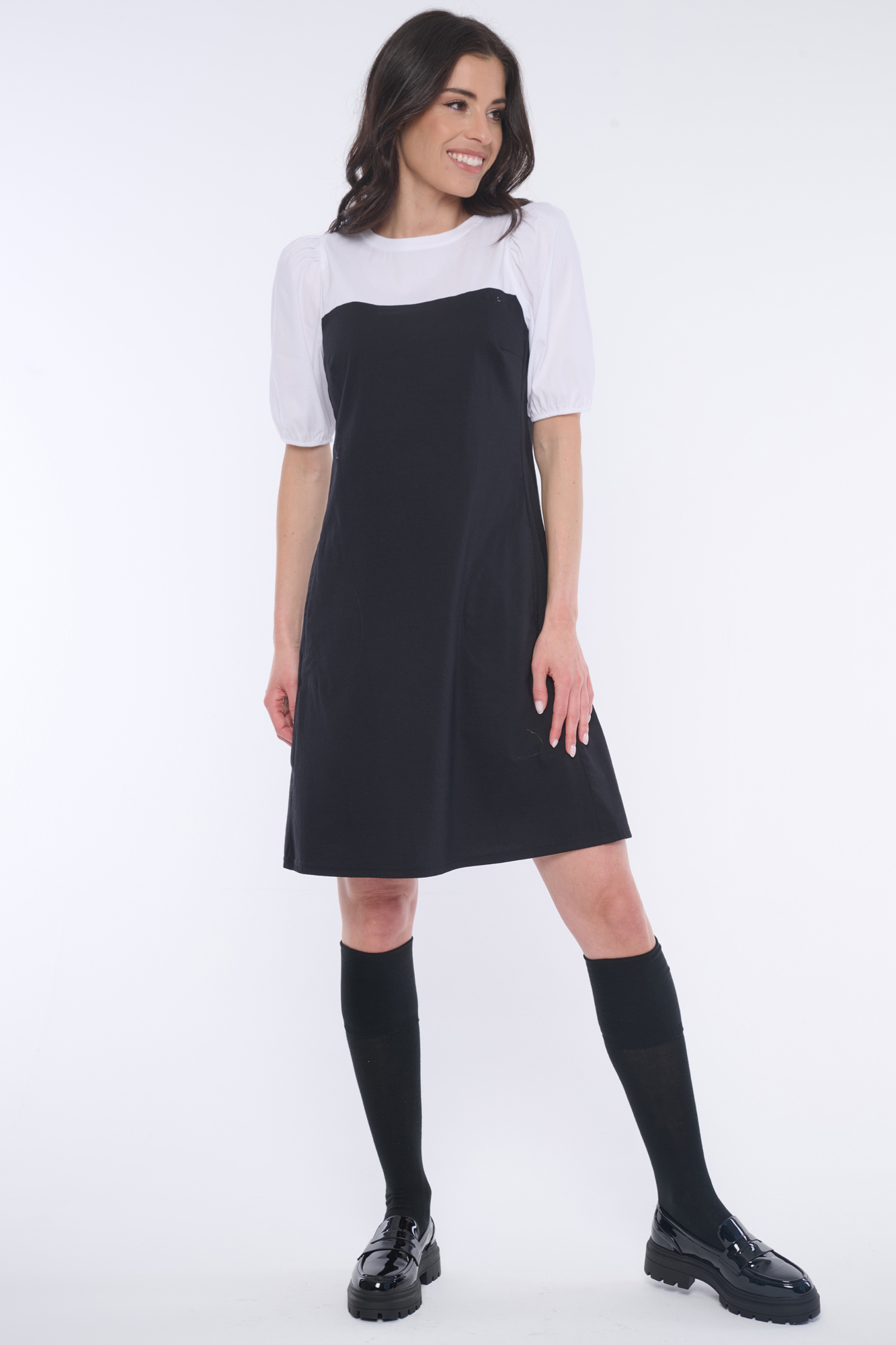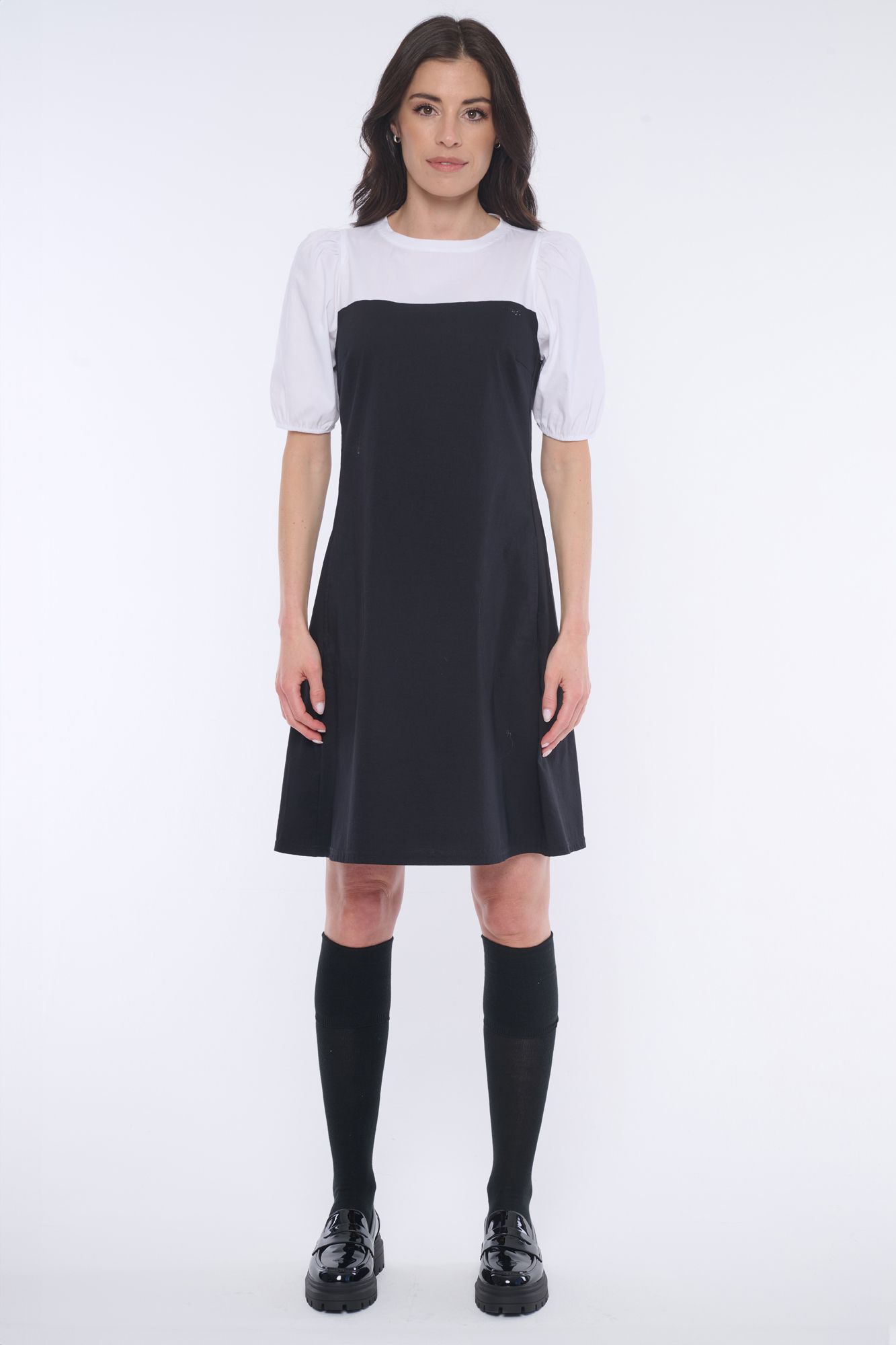 Elegantní šaty s balónkovými rukávky. Nebojte se tohoto střihu, rozhodně opticky nezvětšuje ramena. Minimalistické logo INF z černých krystalů Preciosa.