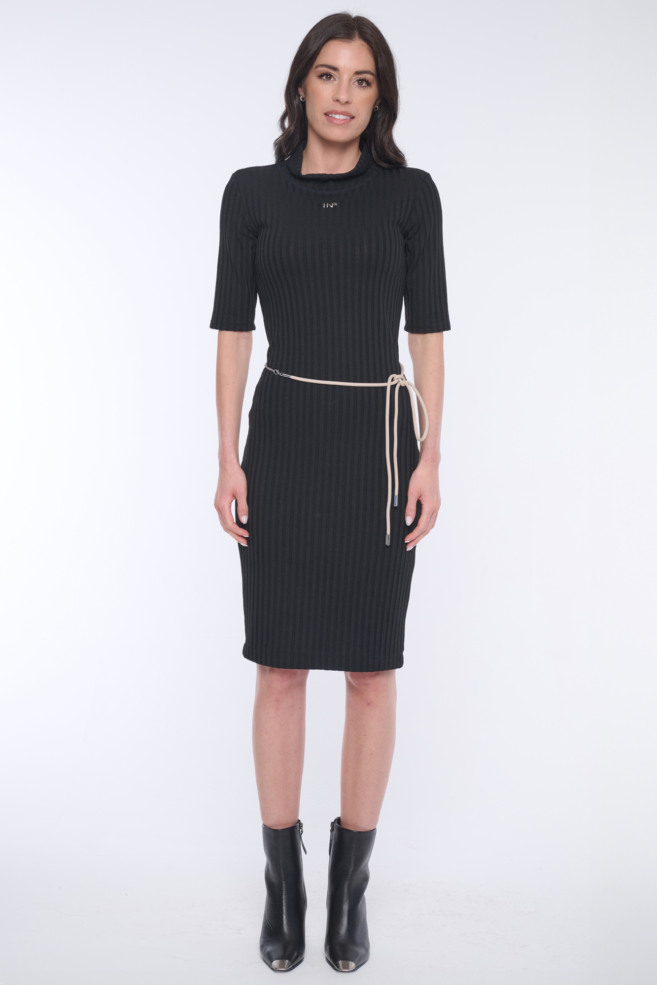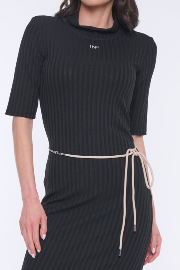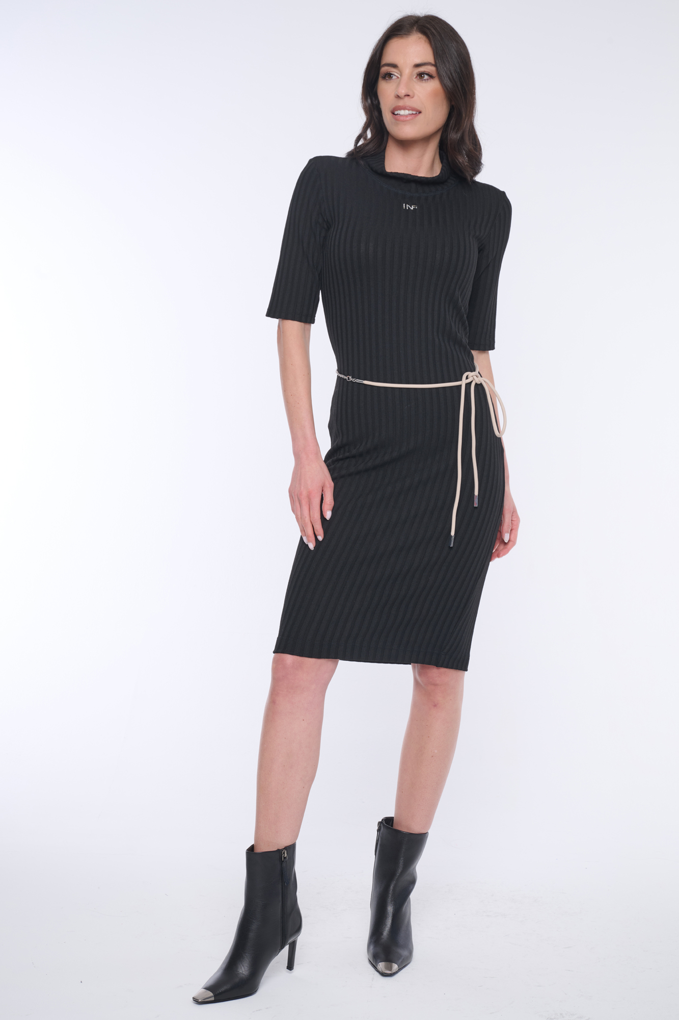 Šaty INFINITE ke kolenům. Na předním díle INF minimalistické logo ze stříbrných krystalů Swarovski.