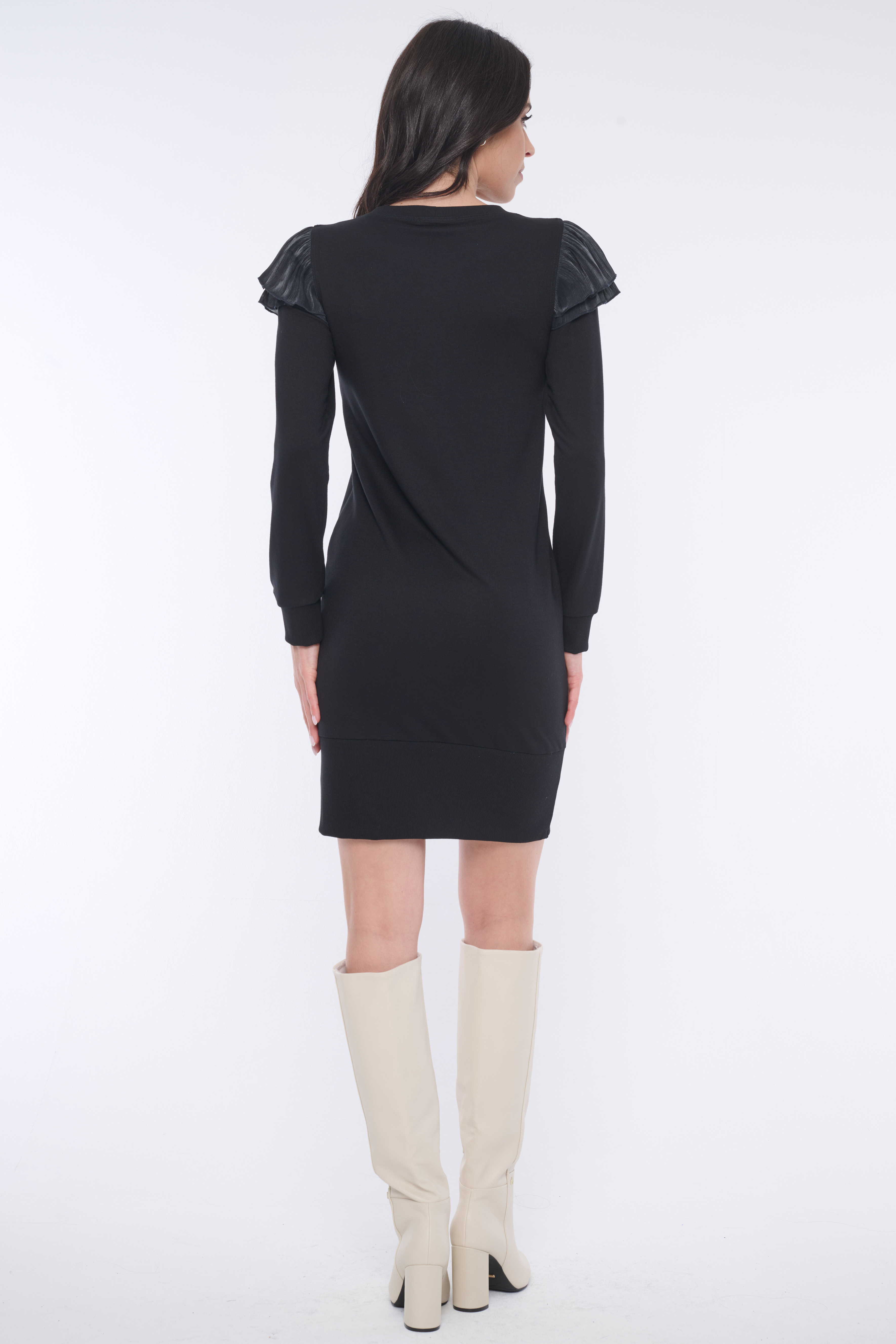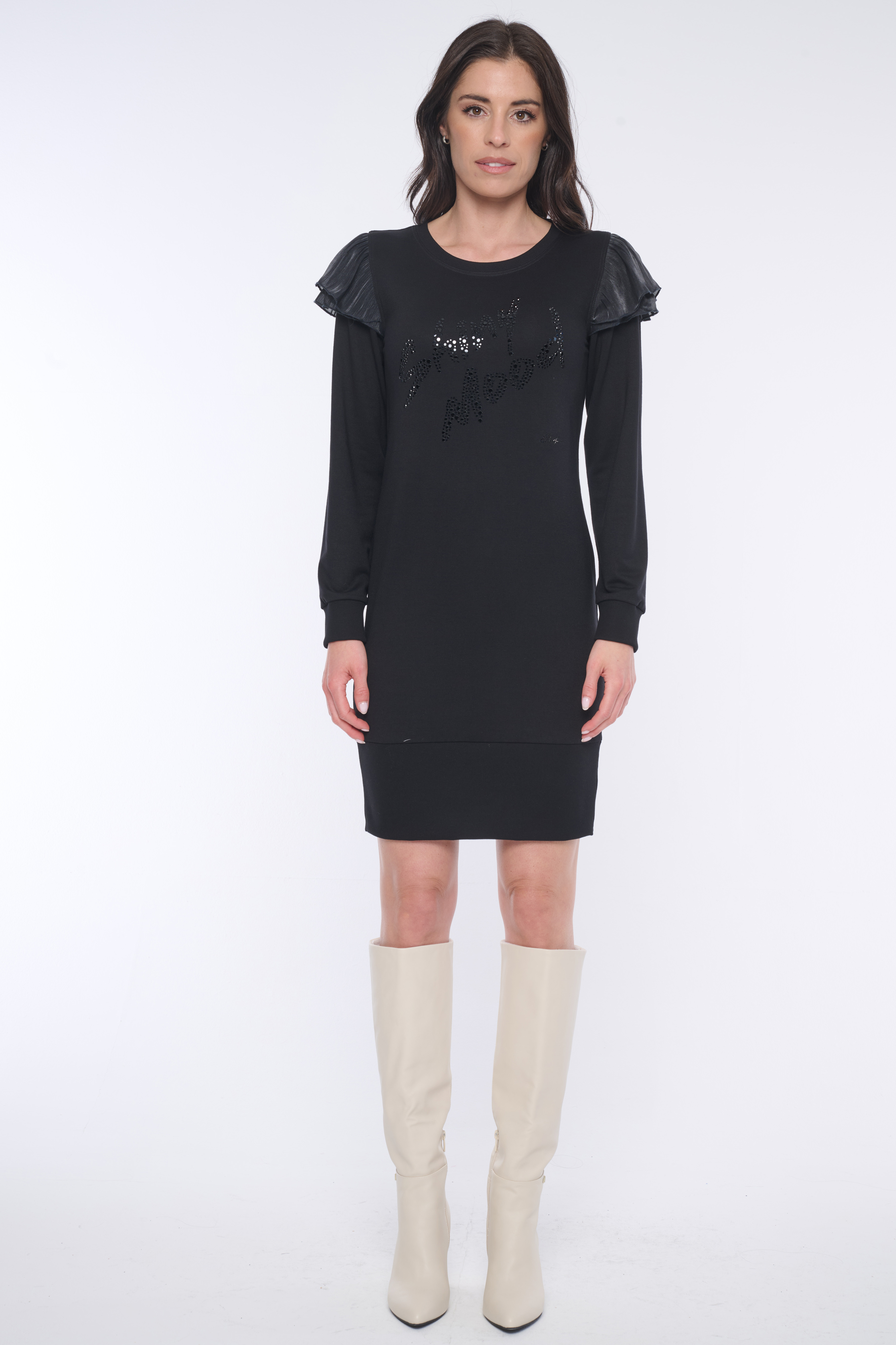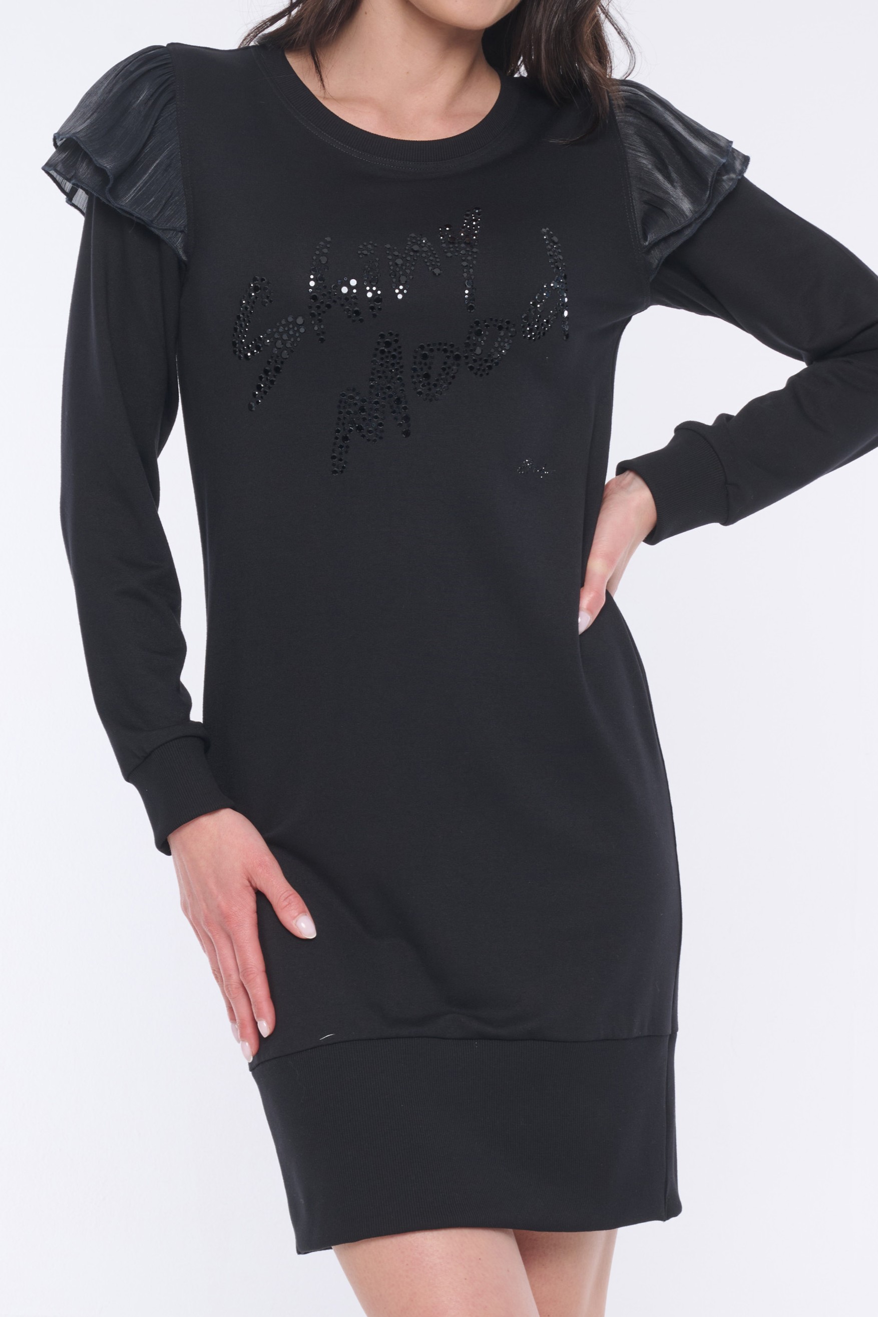 Mikinové šaty s efektním detailem na rukávu z monofilového materiálu. Na předním díle černý tisk "Shiny mood" a minimalistické logo INF z krystalů Swarovski. Velký podíl ruční práce.