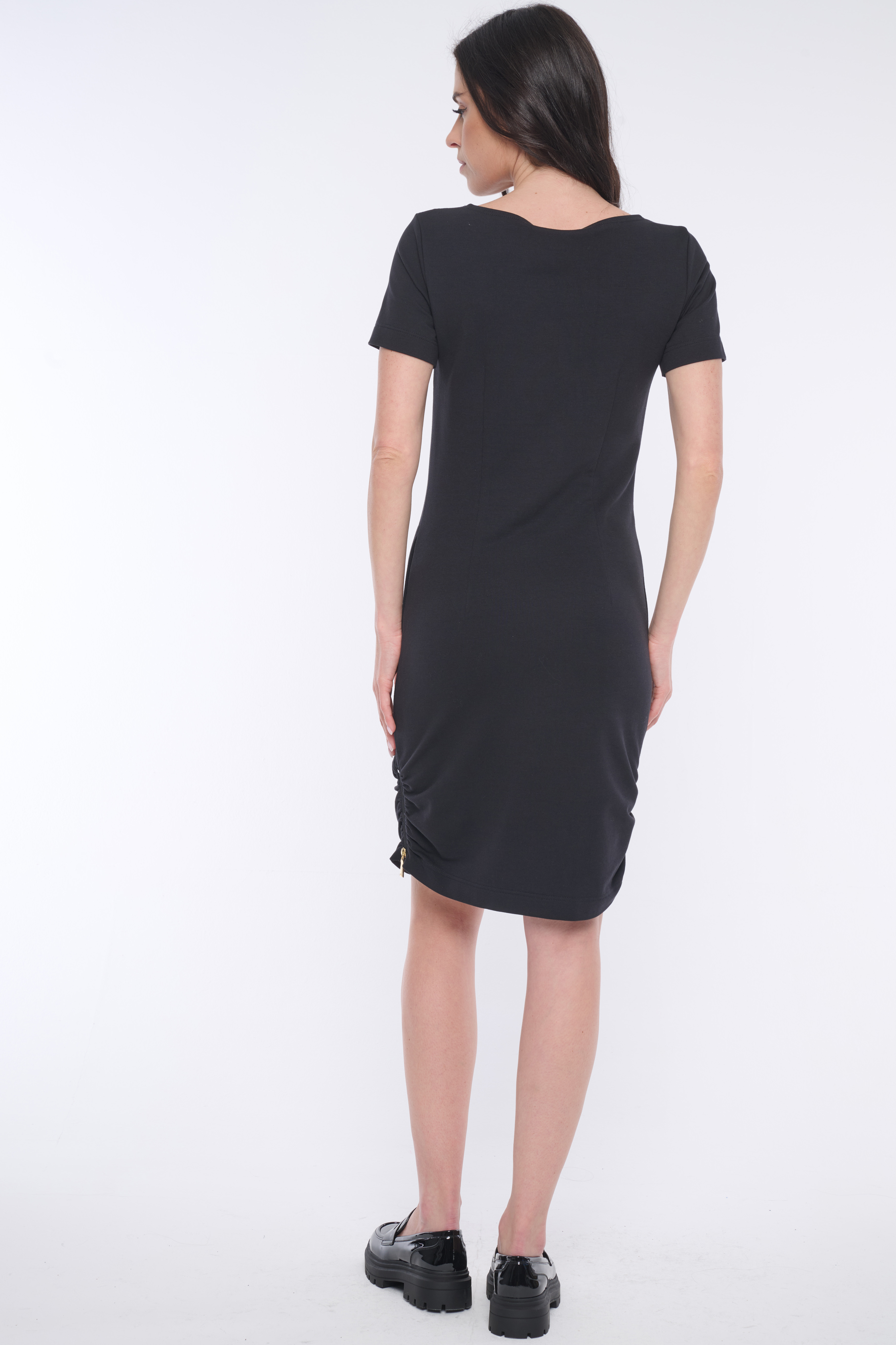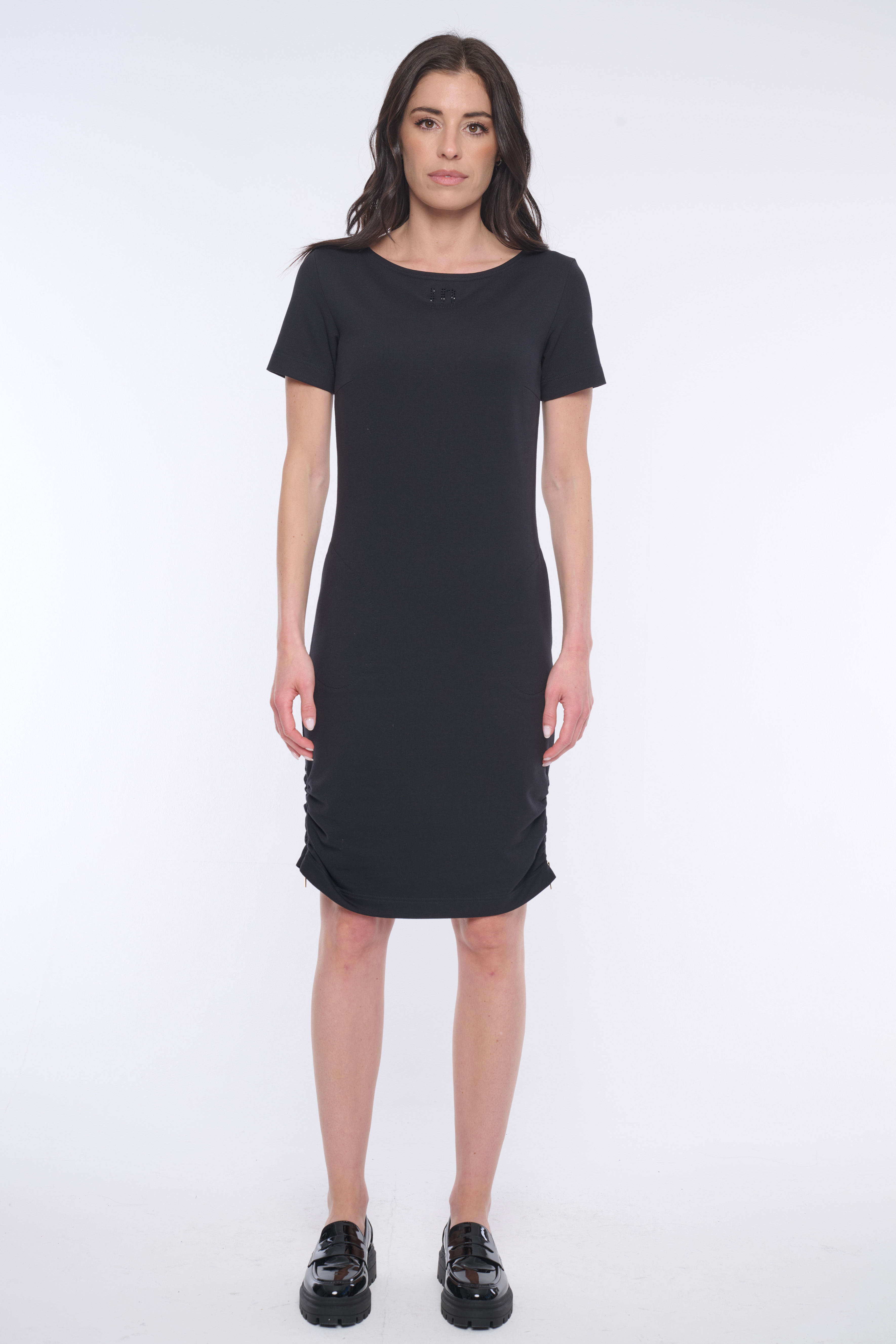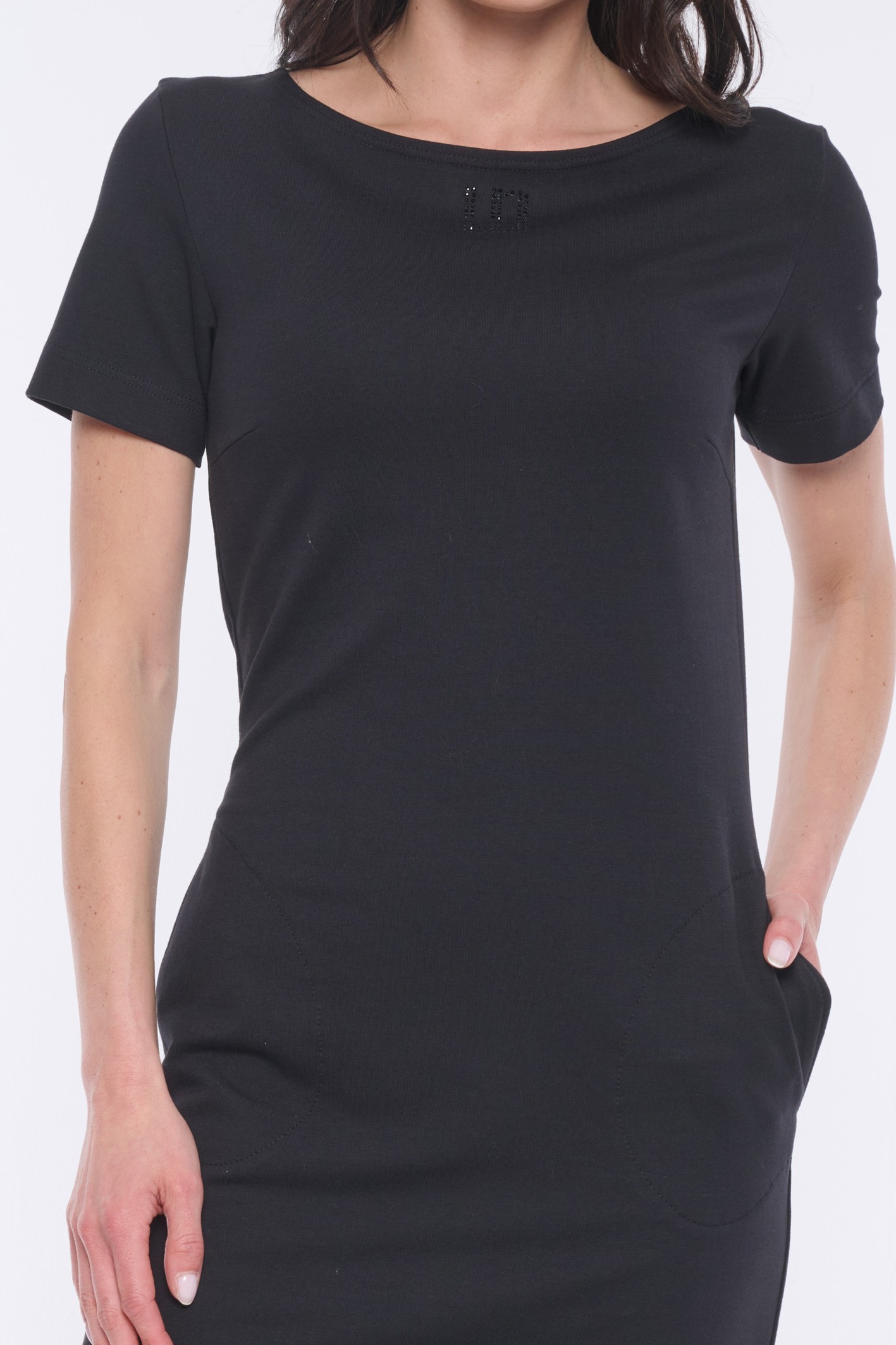 Úpletové nadčasové šaty. Na předním díle nový typ loga INF z krystalů Preciosa.