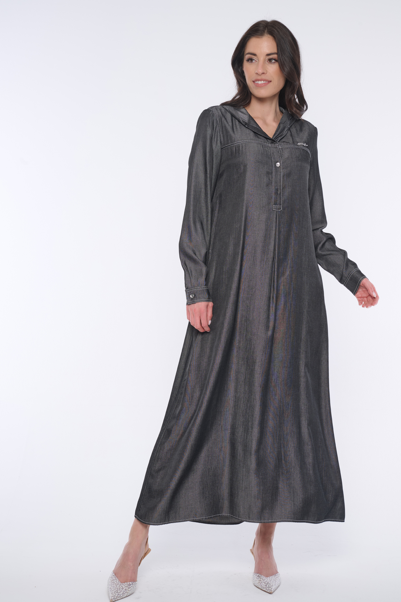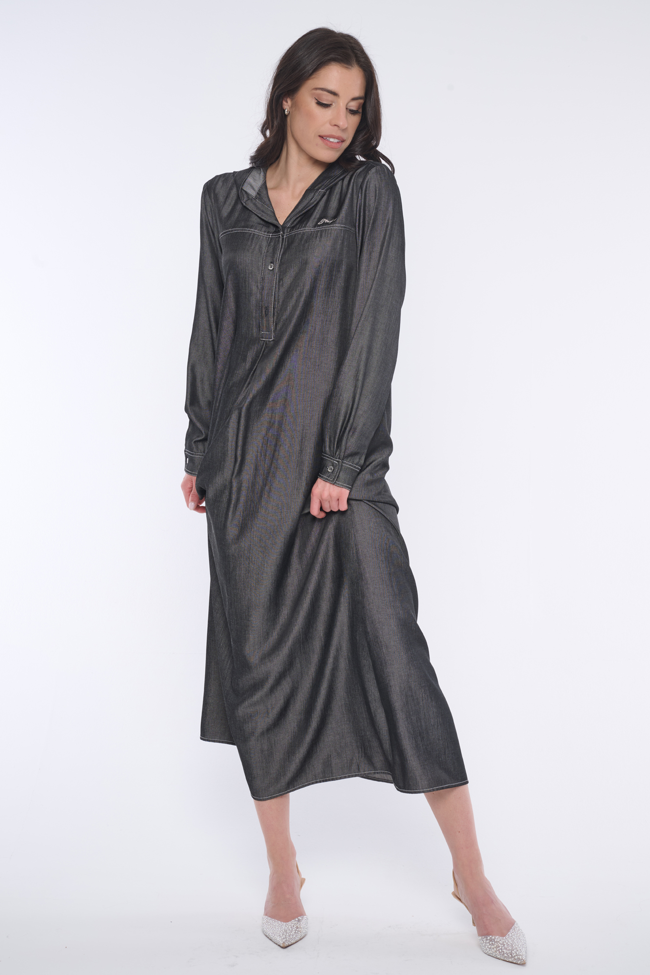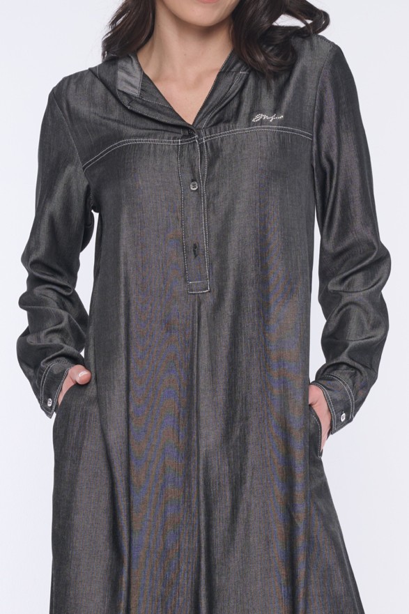 Ležérní šaty "džínového looku" s dlouhými rukávy a kapucí. Na předním díle je kapsička s minimalistickým logem INF ze zlatých krystalů Swarovski. Stříbrné knoflíčky.