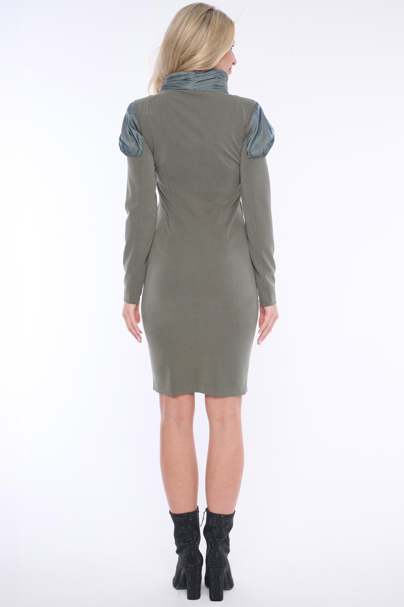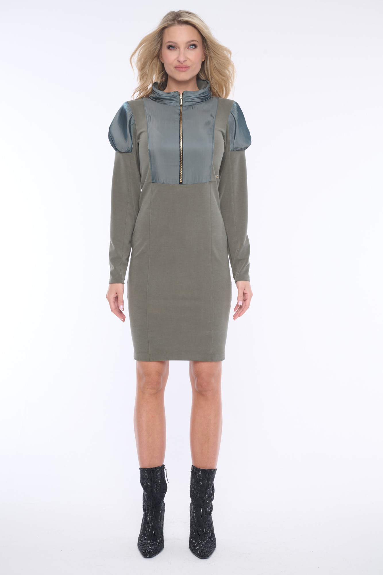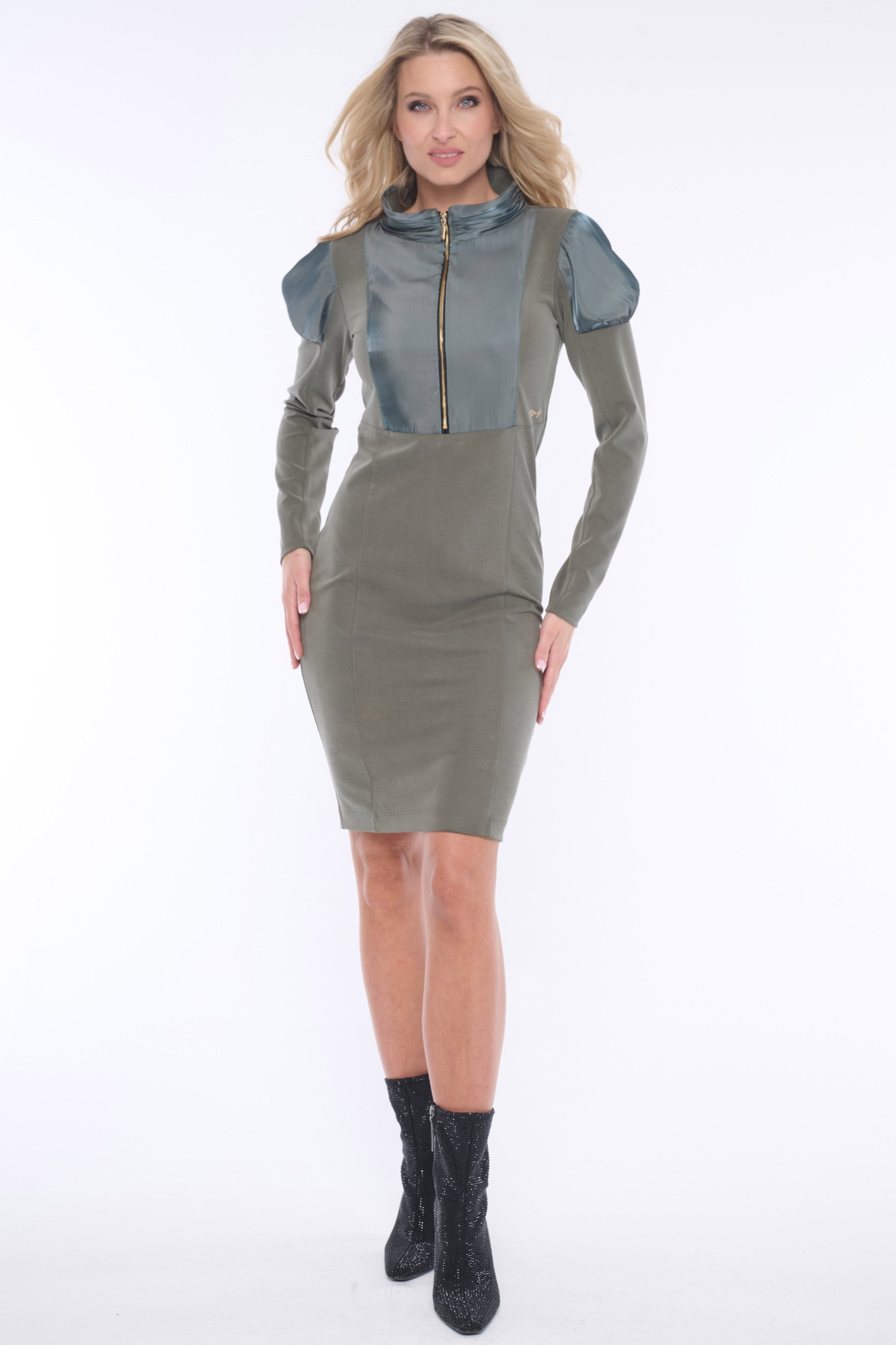 Elegantní šaty z velmi jemného broušeného žebra "cupro", doplněné luxusní lesklou látkou s nabíranými rukávy a jemnými krystaly Swarowski. Praktické rozepínání ve předu na zip. Dostupné ve dvou barevných variantách.