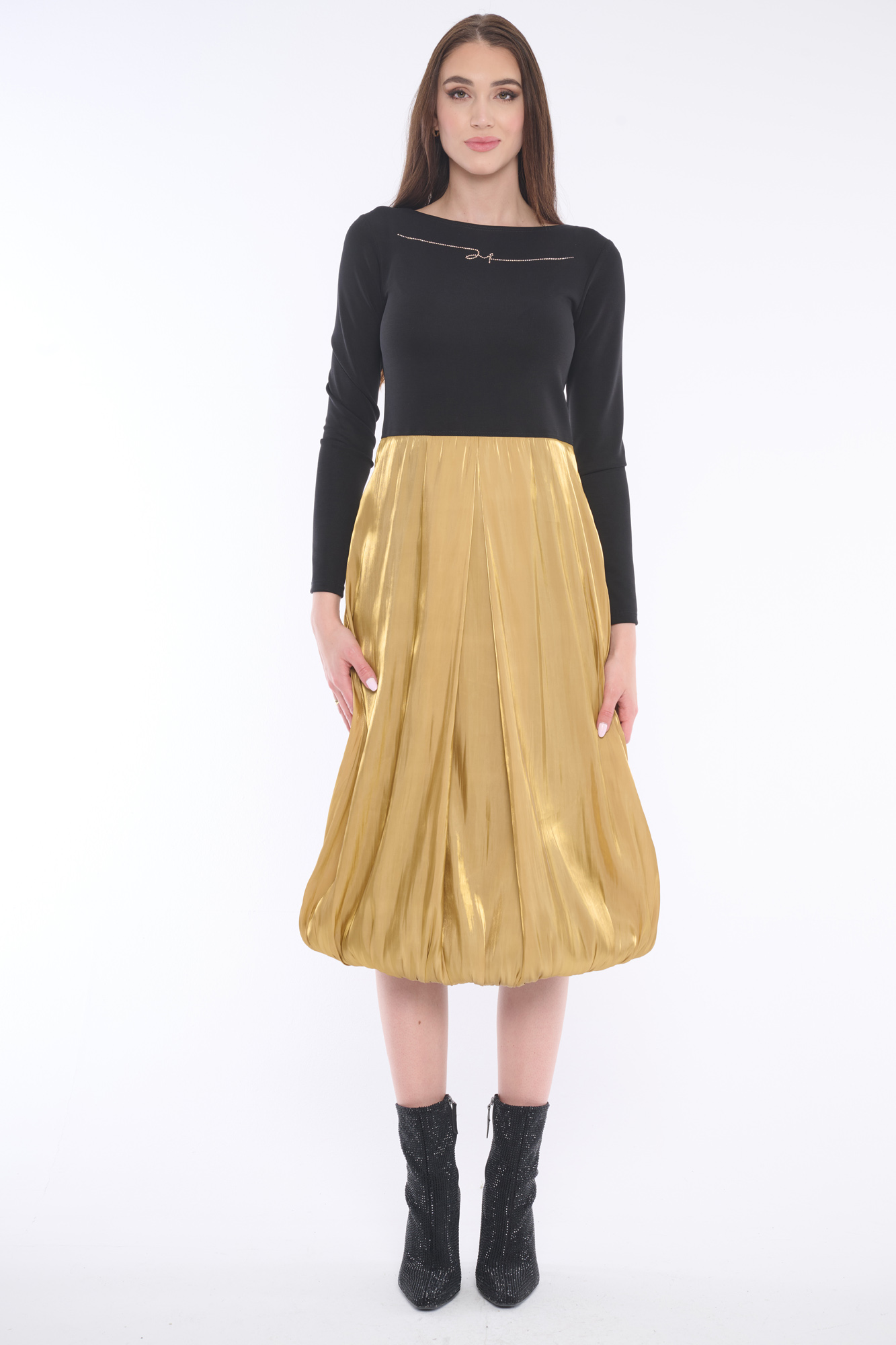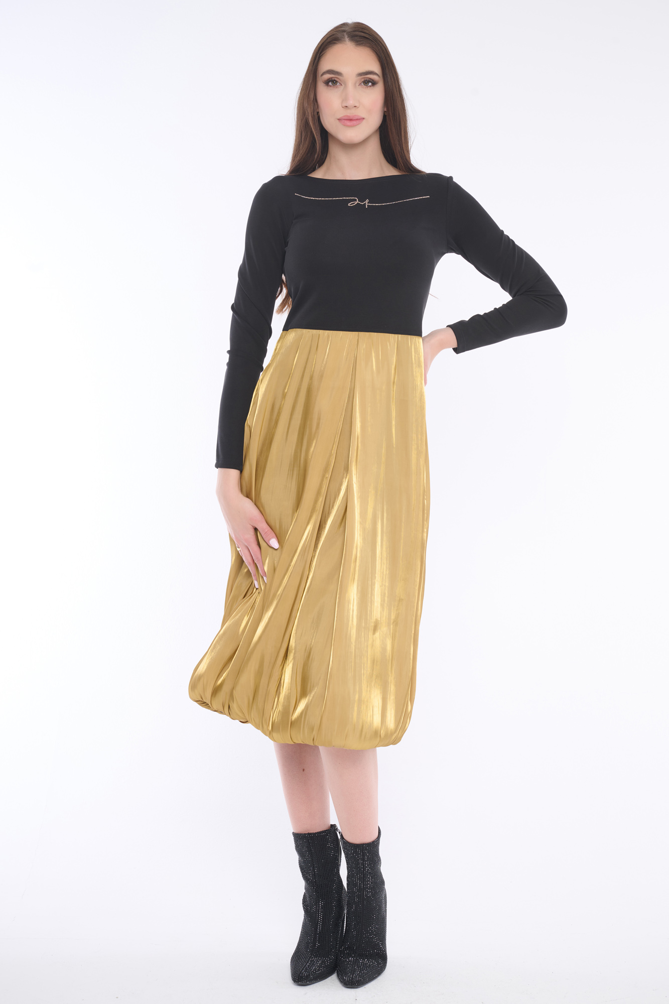 Luxusní šaty s lesklou balonovou sukní doplněné krystaly Preciosa. Dostupné ve dvou barevných variantách.