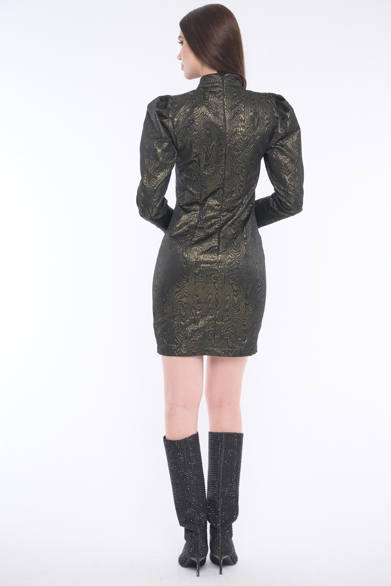 Luxusní koktejlové šaty s nabíranými rukávy ideální na večírek. Pevná kvalitní látka s metalovými odlesky upoutá pozornost každého. Detail tvoří jemné krystaly Preciosa. Dostupné ve dvou variantách.
