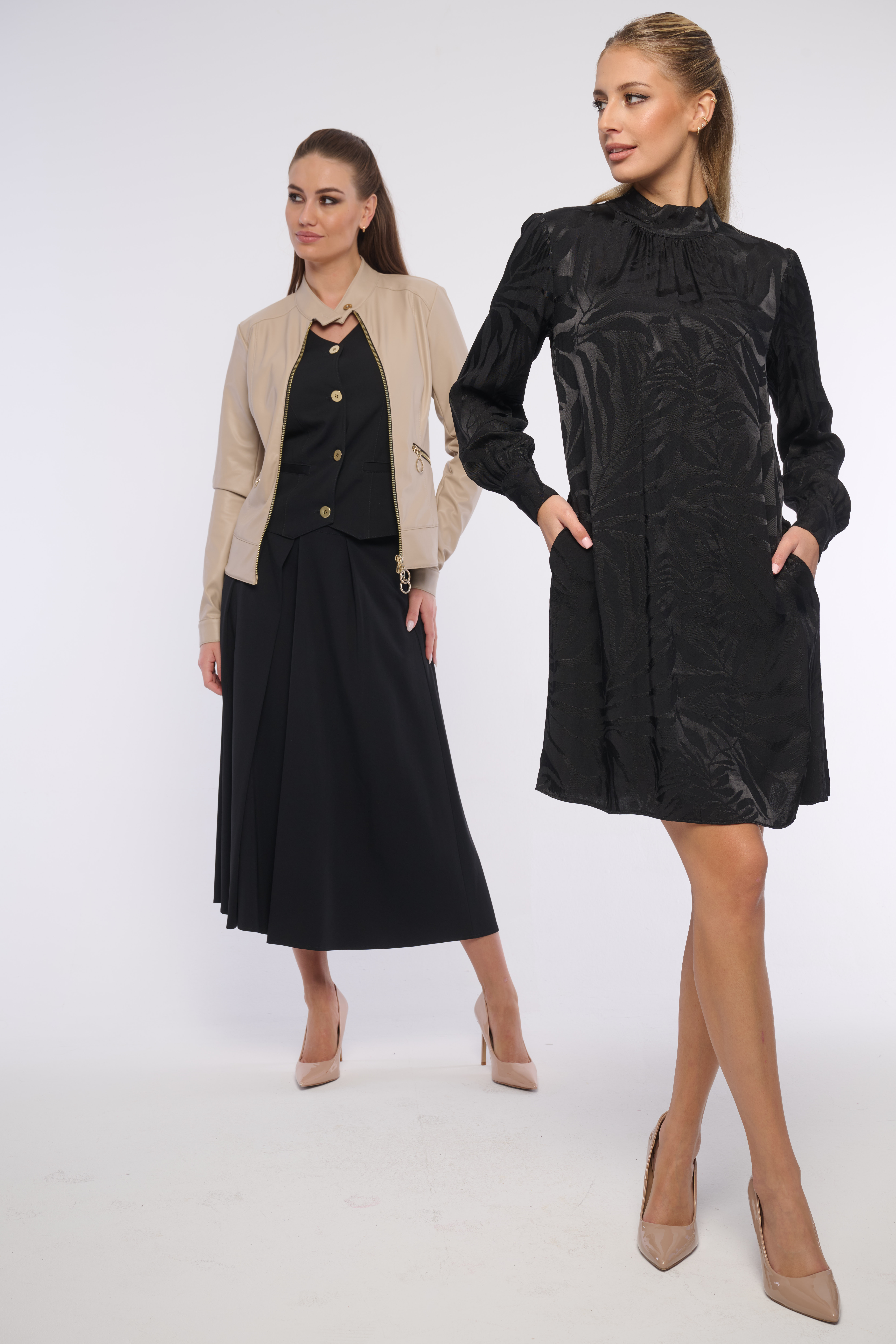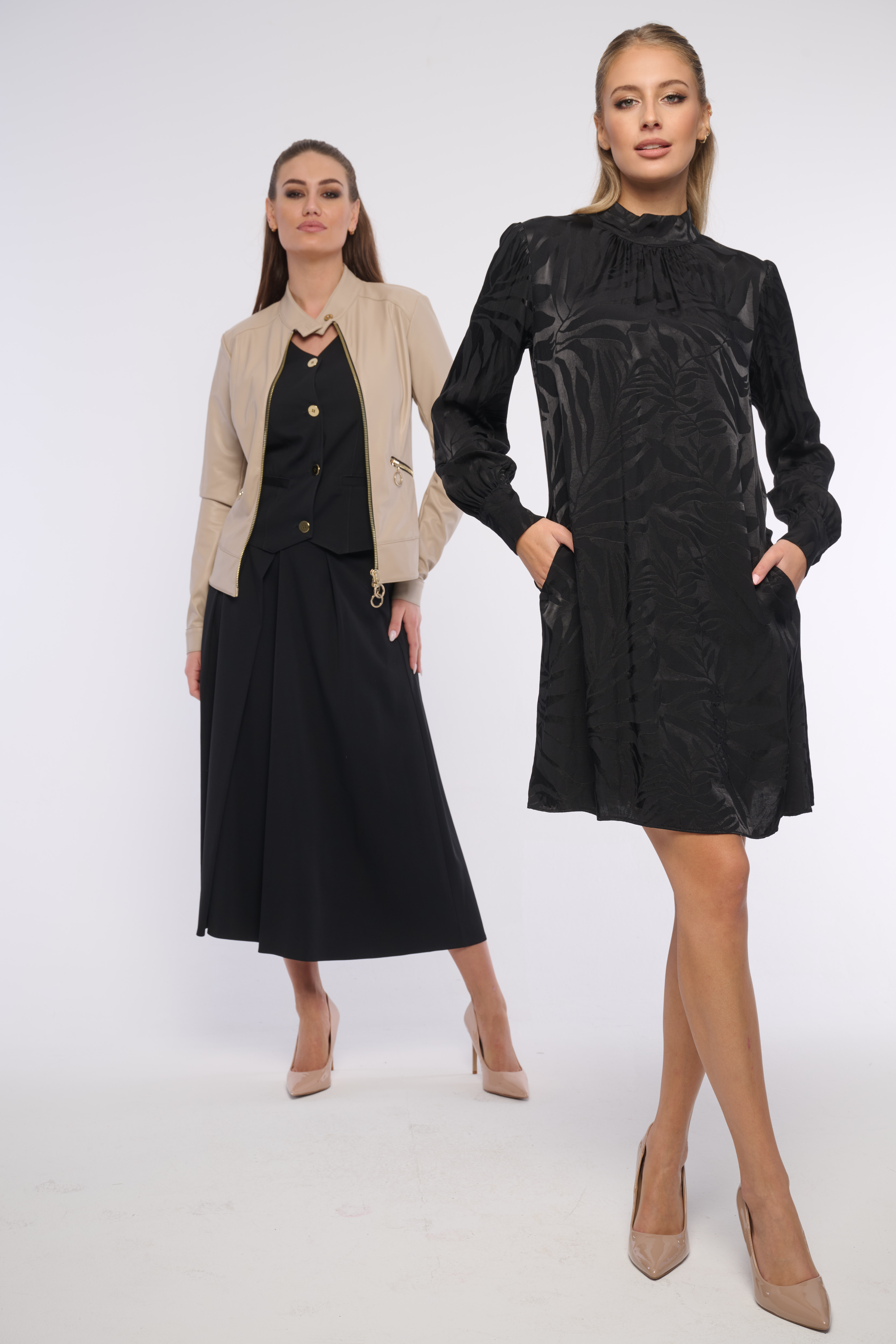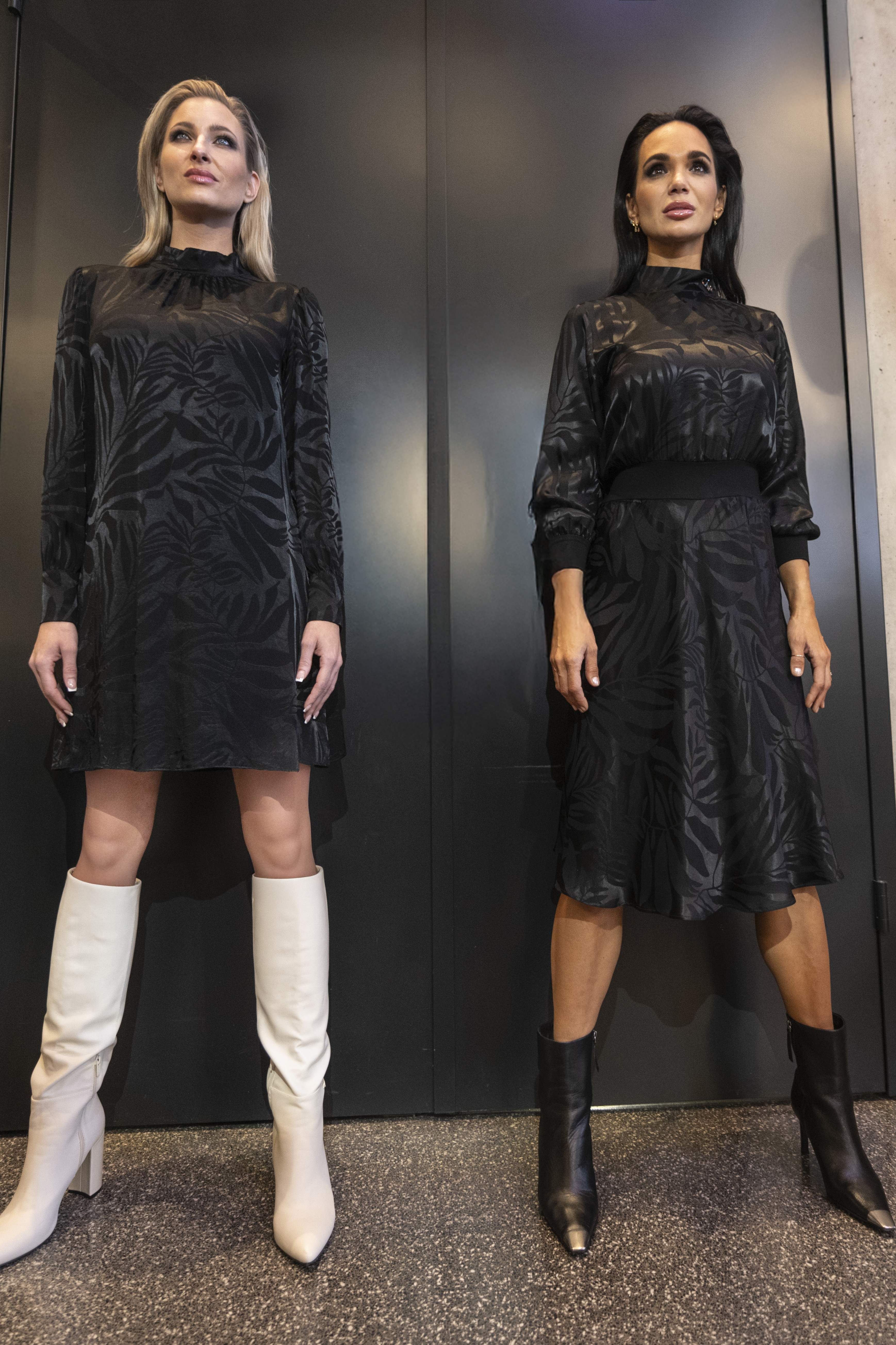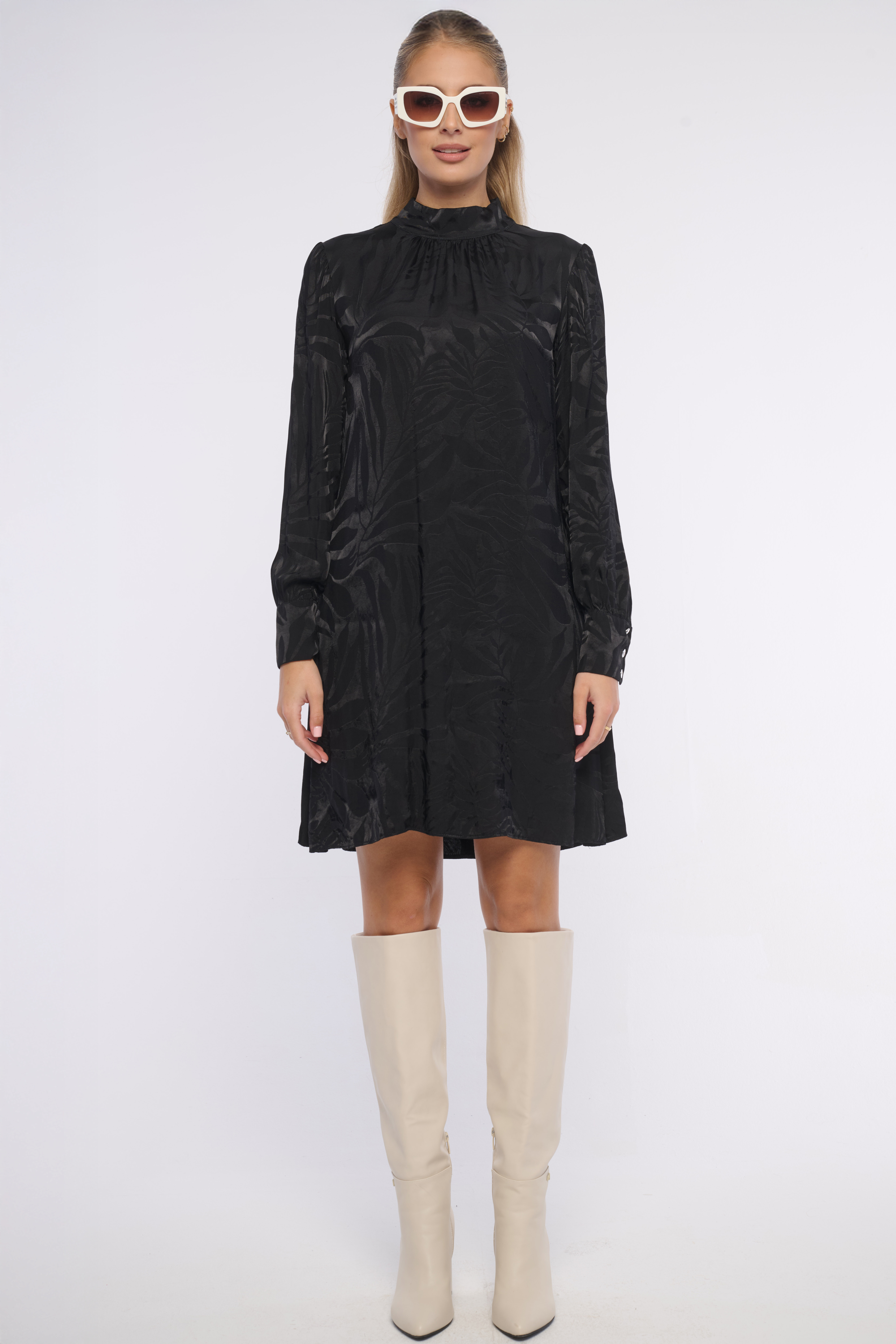 Volné krátké šaty z luxusního lehkého materiálu. Konce rukávů jsou zúžené na knoflíčky. Detailem na krku je logo z luxusních krystalů Preciosa. Šaty ideální na vyjímečné příležitosti i do kanceláře. Dostupné ve dvou barevných variantách.