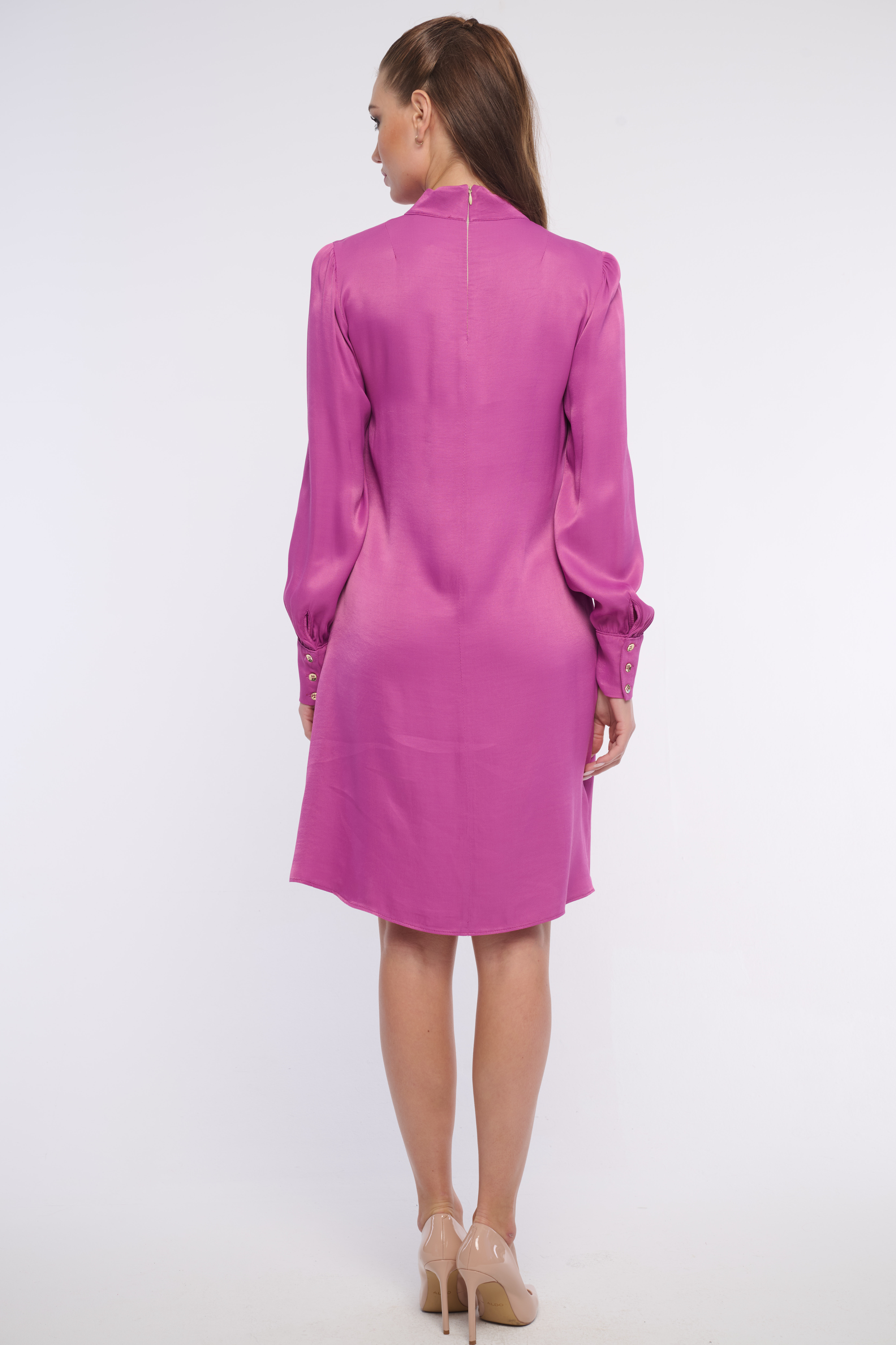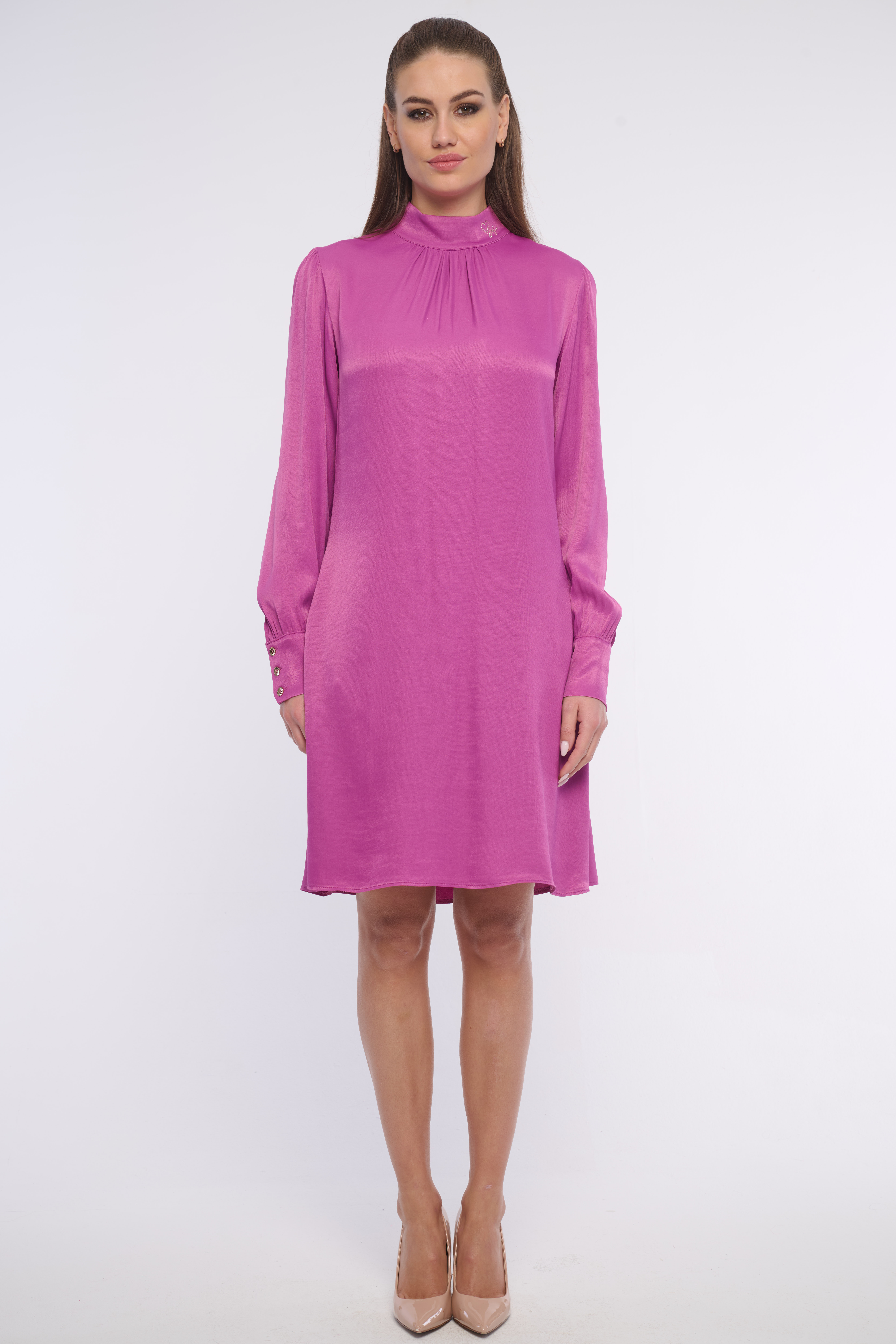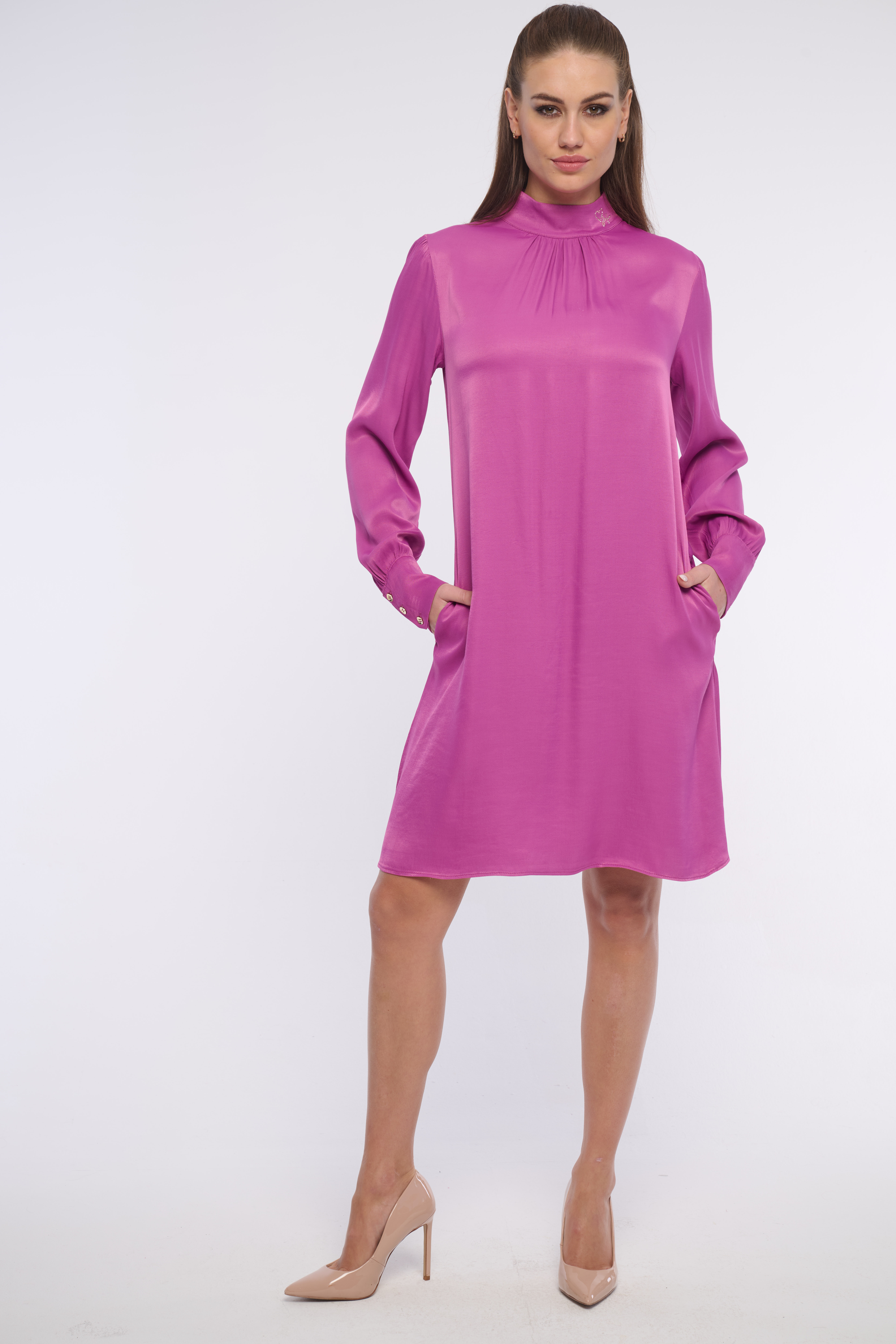 Volné krátké šaty z luxusního lehkého materiálu. Konce rukávů jsou zúžené na knoflíčky. Detailem na krku je logo z luxusních krystalů Preciosa. Šaty ideální na vyjímečné příležitosti i do kanceláře. Dostupné ve dvou barevných variantách.