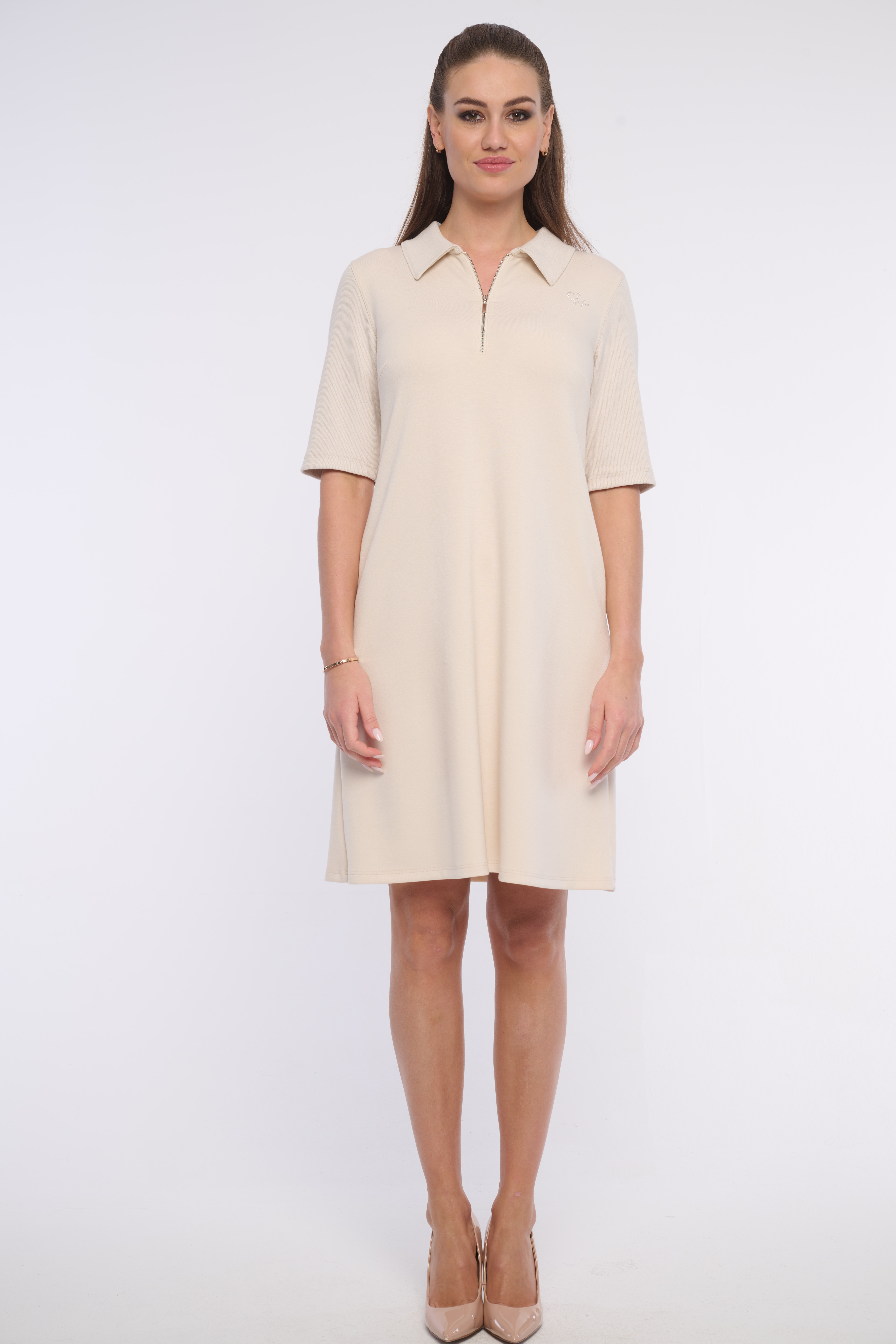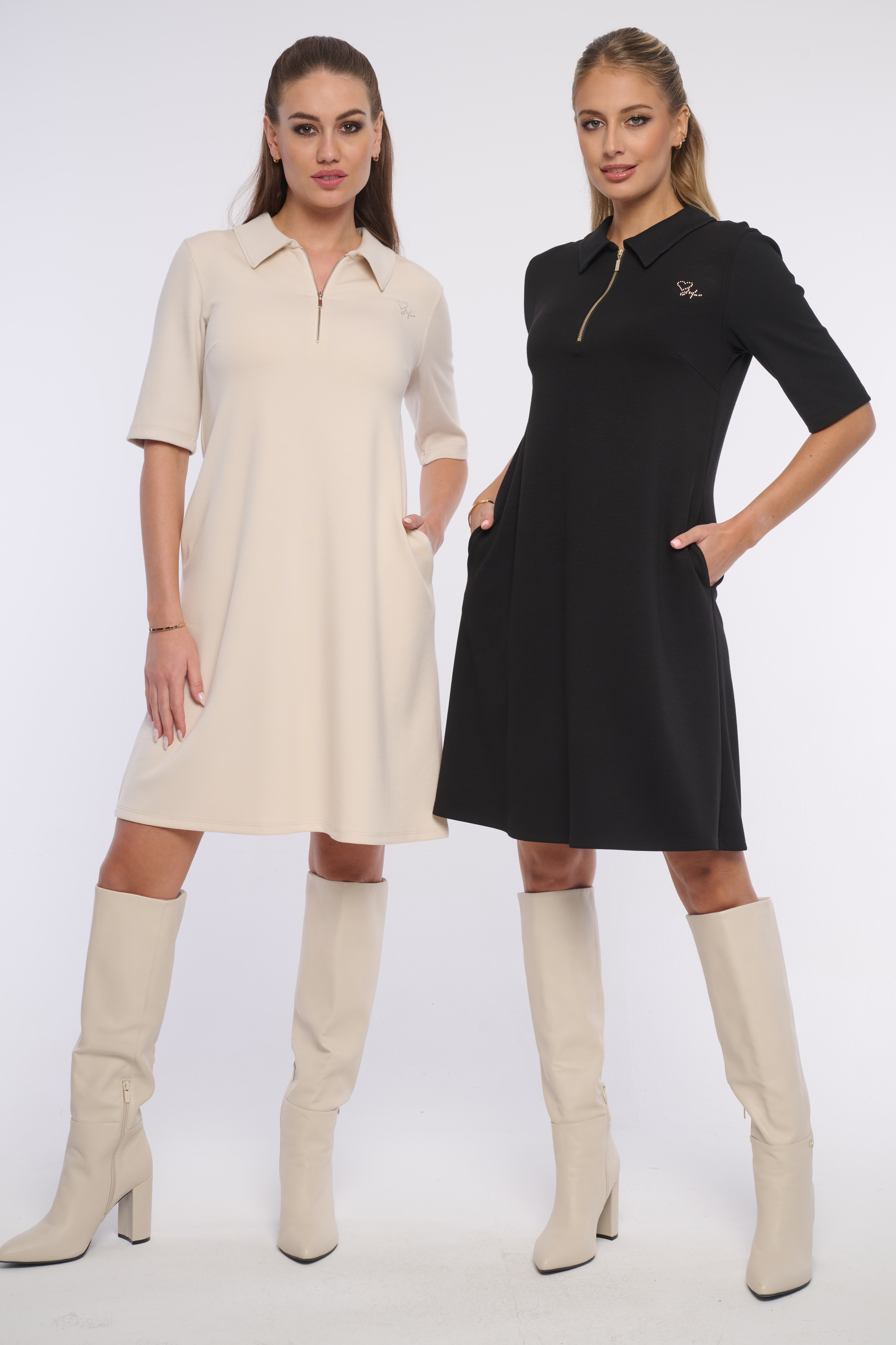 Volné šaty s kapsami z kombinace materiálů - velmi příjemného hladkého a rukávy s límečkem jsou ze žebrového materiálu. Detailem je logo z luxusních krystalů značky Preciosa. Pro ležérnější vzhled si můžete rozepnout zip ve výstřihu. Dostupné ve dvou barevných variantách.