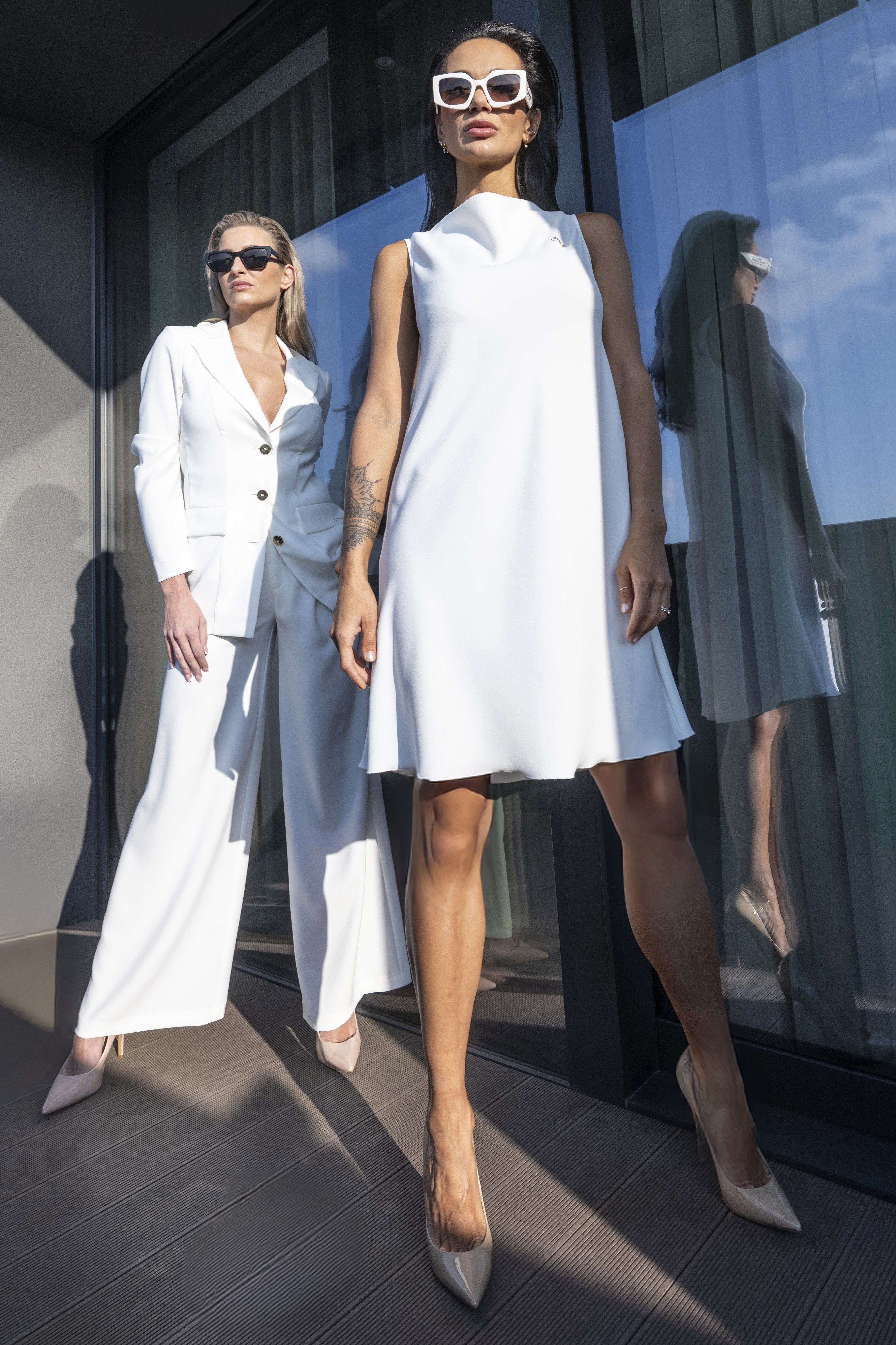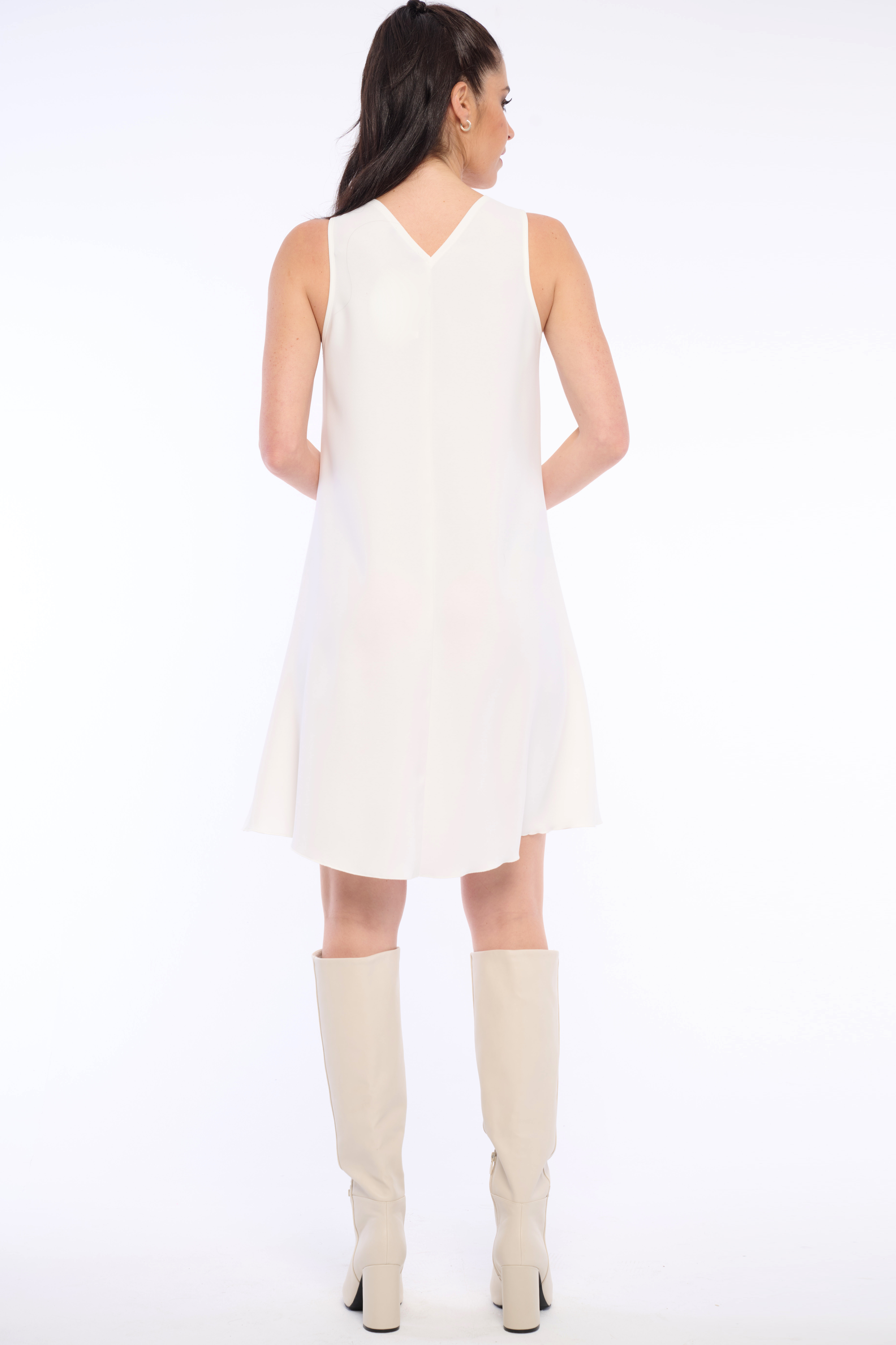 Krátké šaty z lehkého materiálu a vodovým výstřihem. Detail tvoří logo z luxusních krystalů Swarowski. Dostupné ve třech barevných variantách.