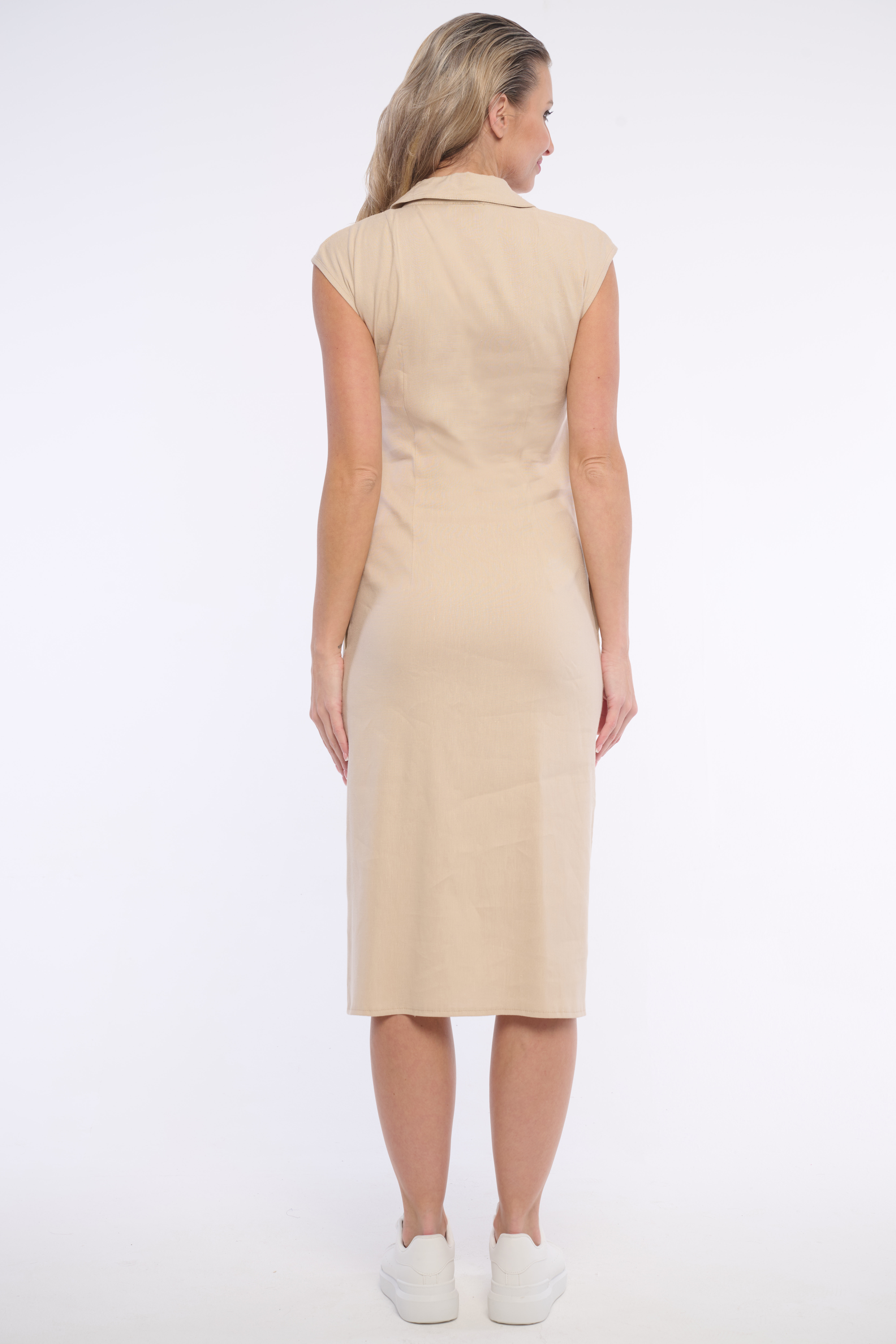Lněné košilové šaty s límečkem na knoflíky. Řasení v pase opticky zužuje pas. Detailem je logo z luxusních krystalů Swarowski. Dostupné ve dvou barevných variantách.