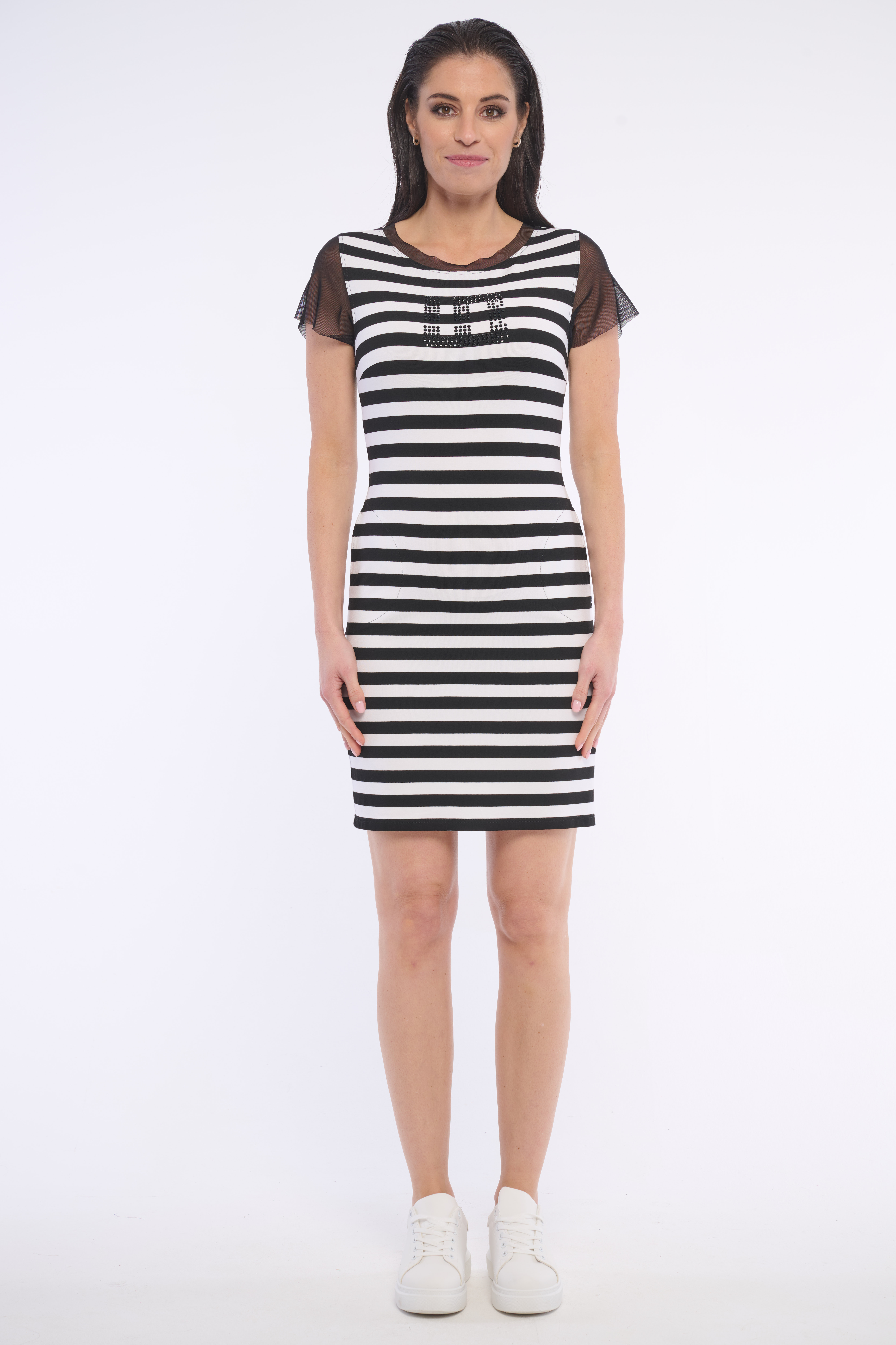 Klasické přiléhavé šaty krásně tvarující postavu. Neobyčejnými detaily jsou tylové rukávy a velké logo z luxusních krystalů Preciosa. Dostupné ve třech variantách.