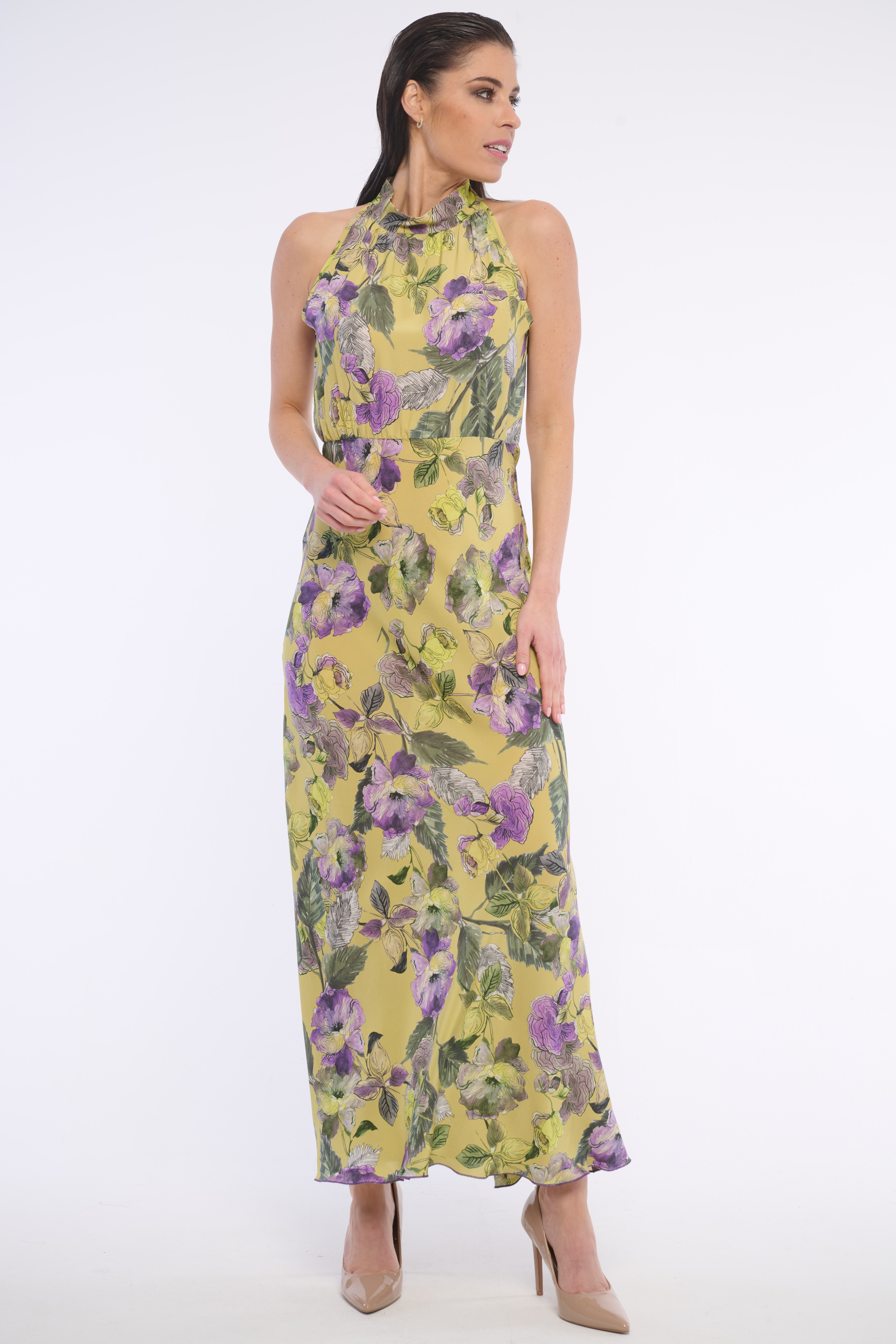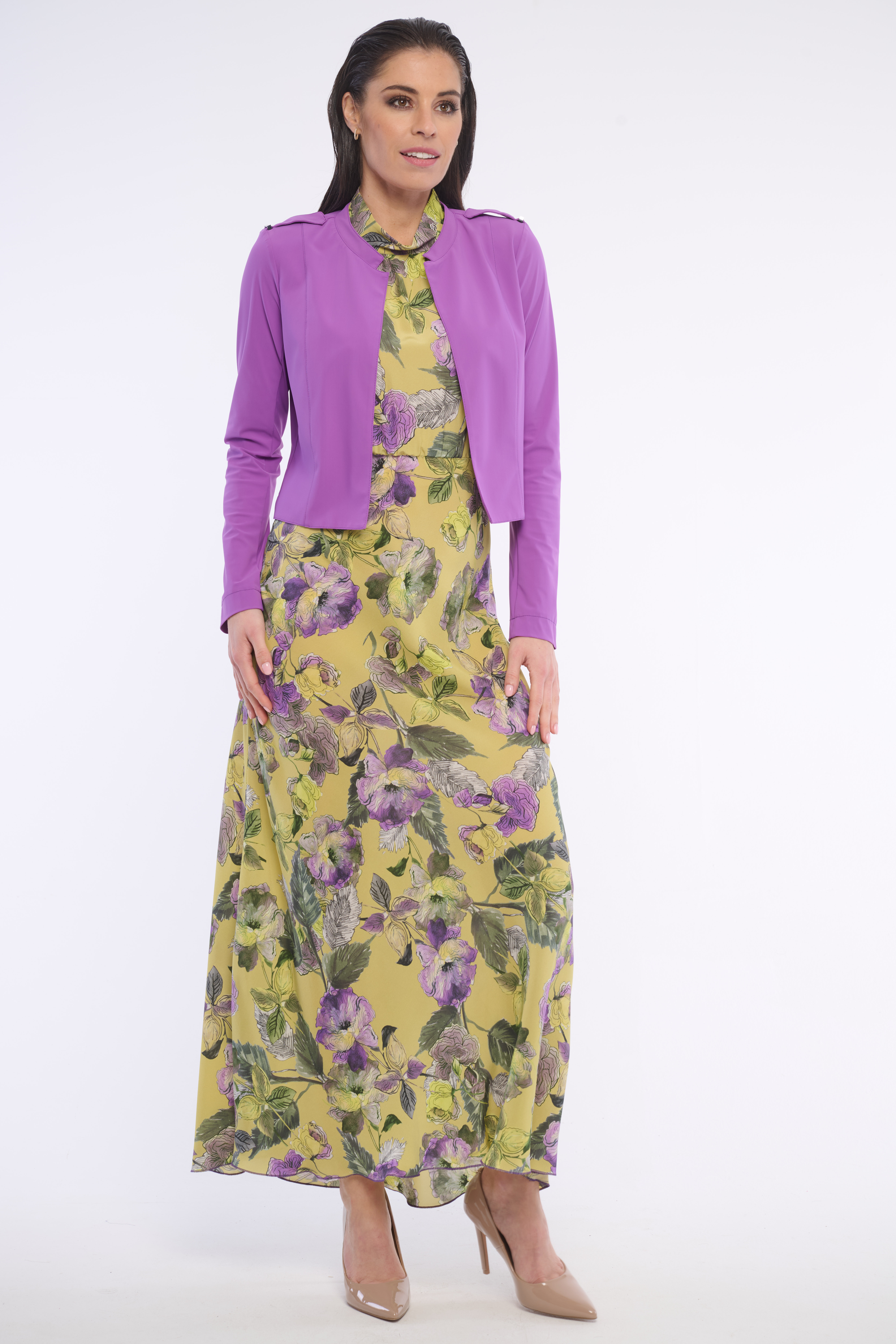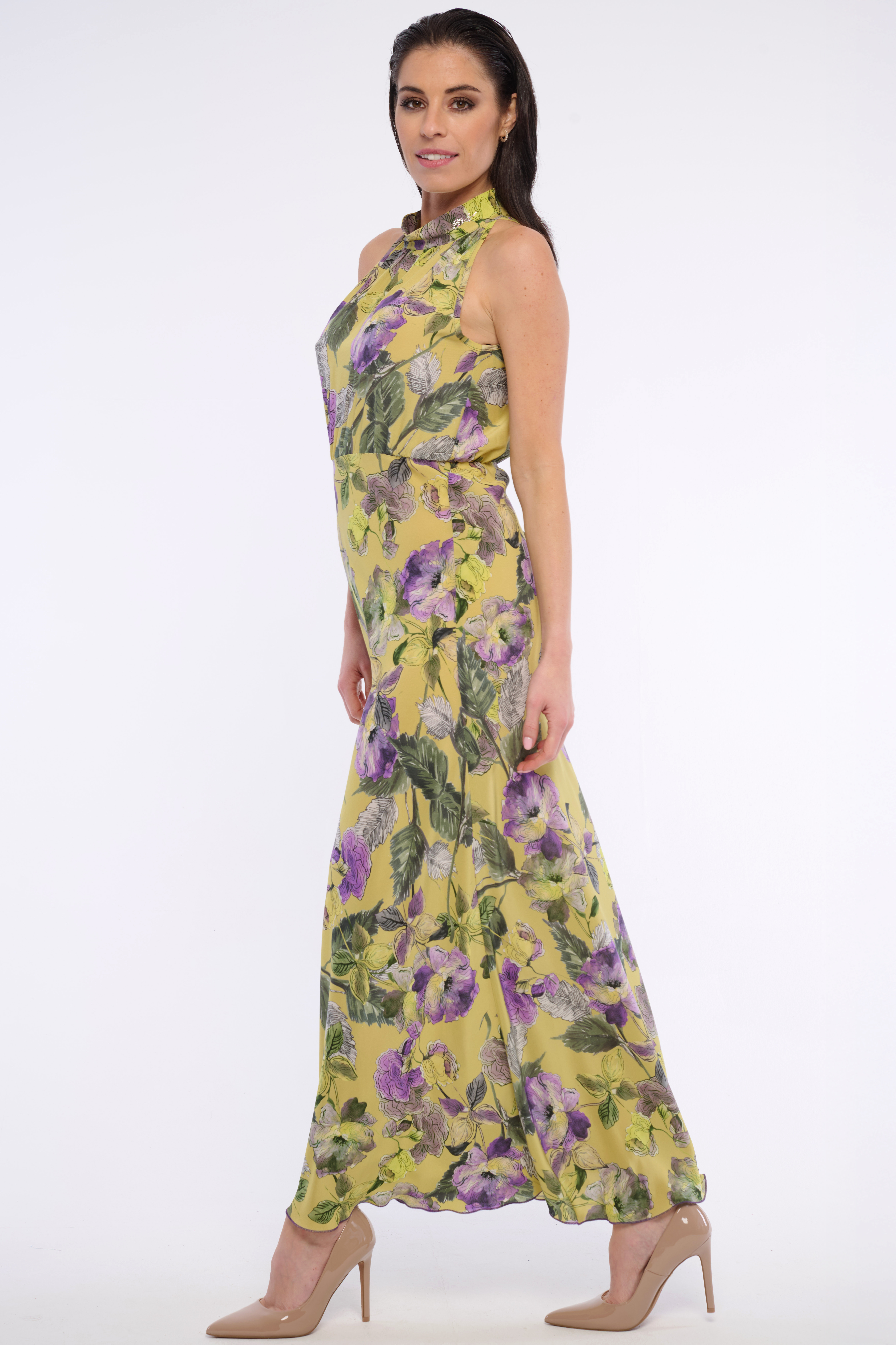 Dlouhé volné šaty se stojákem se zajímavým vzorem. Detailem na krku je logo z luxusních krystalů Swarowski. Dostupné ve dvou barevných variantách.