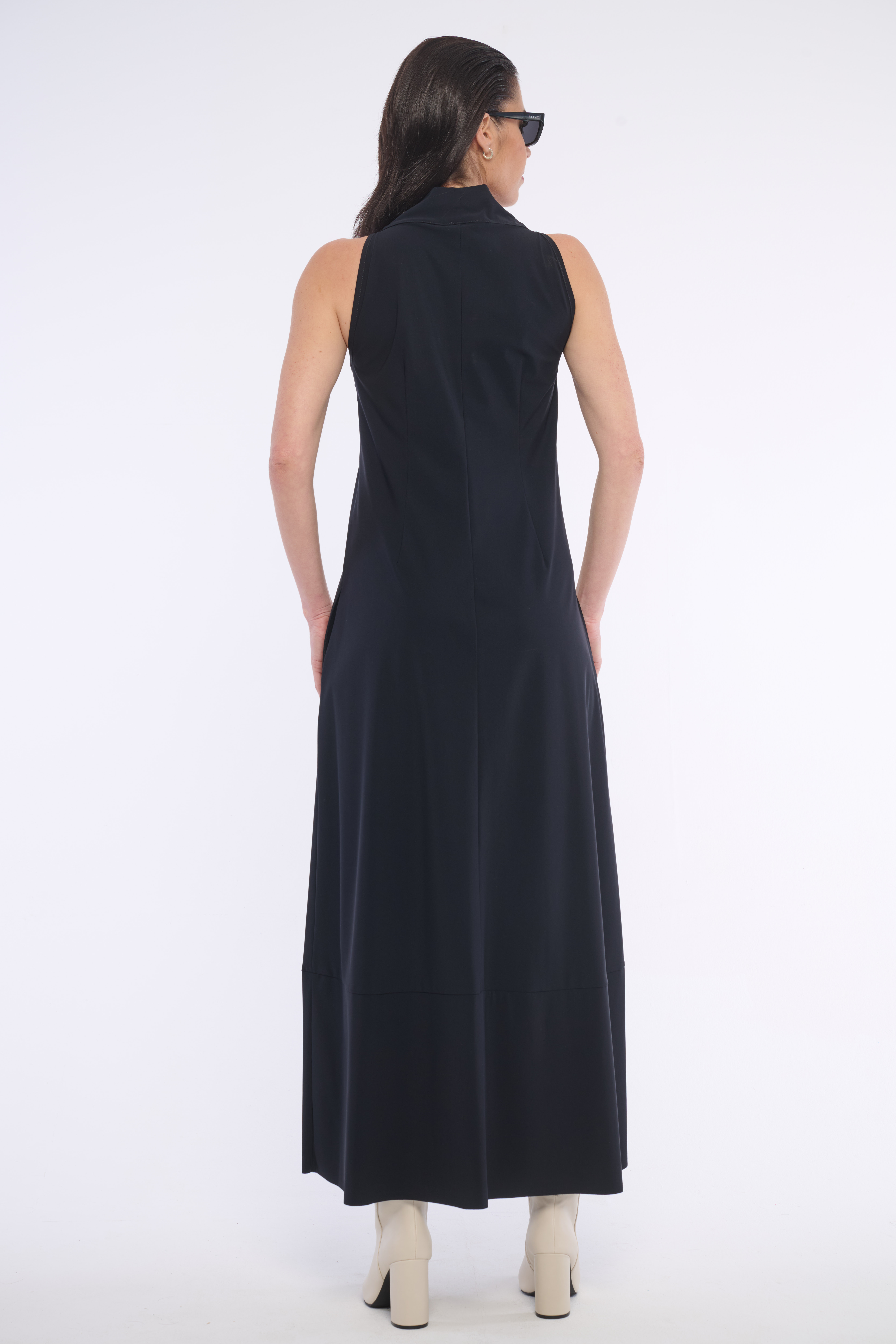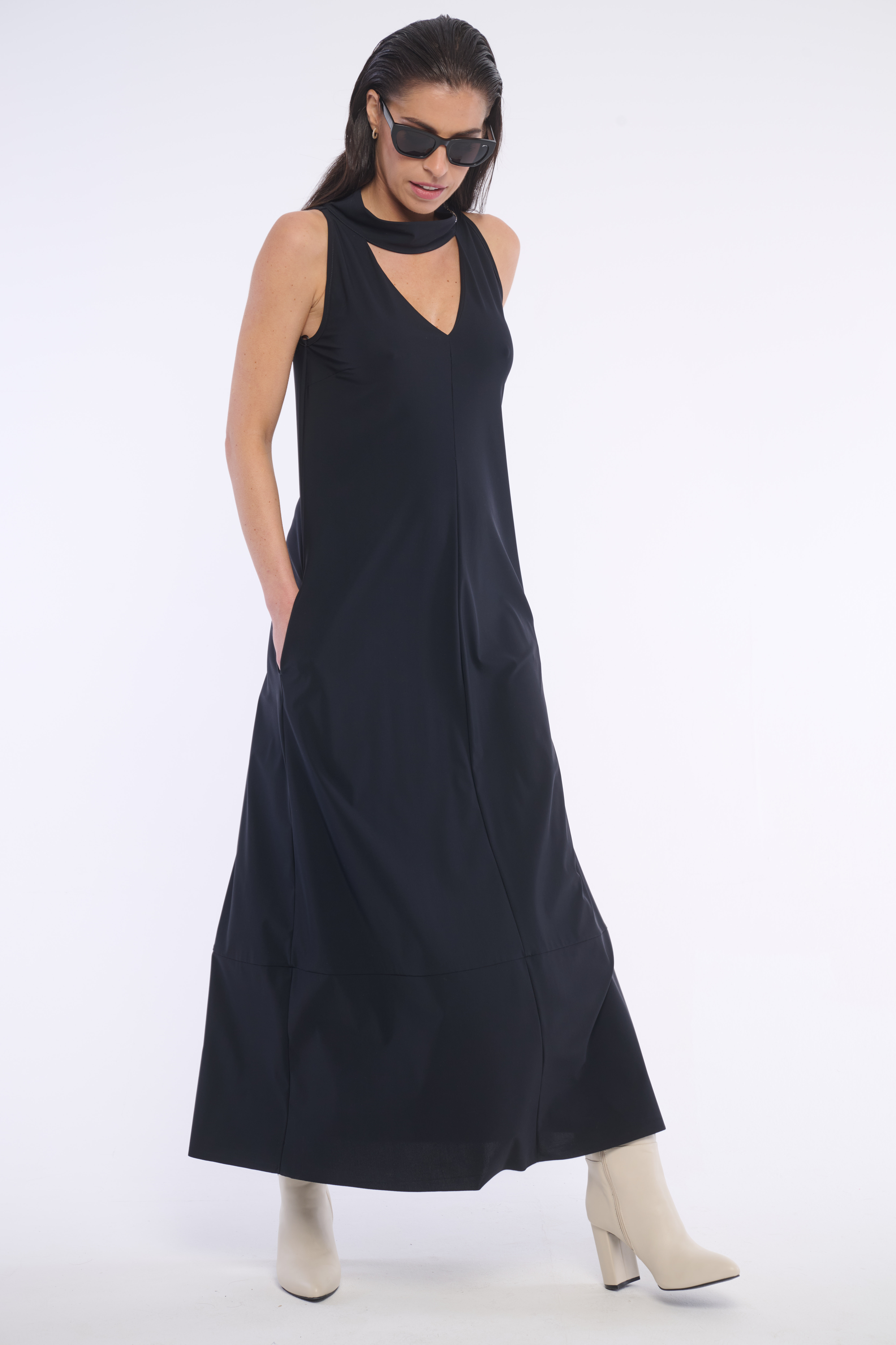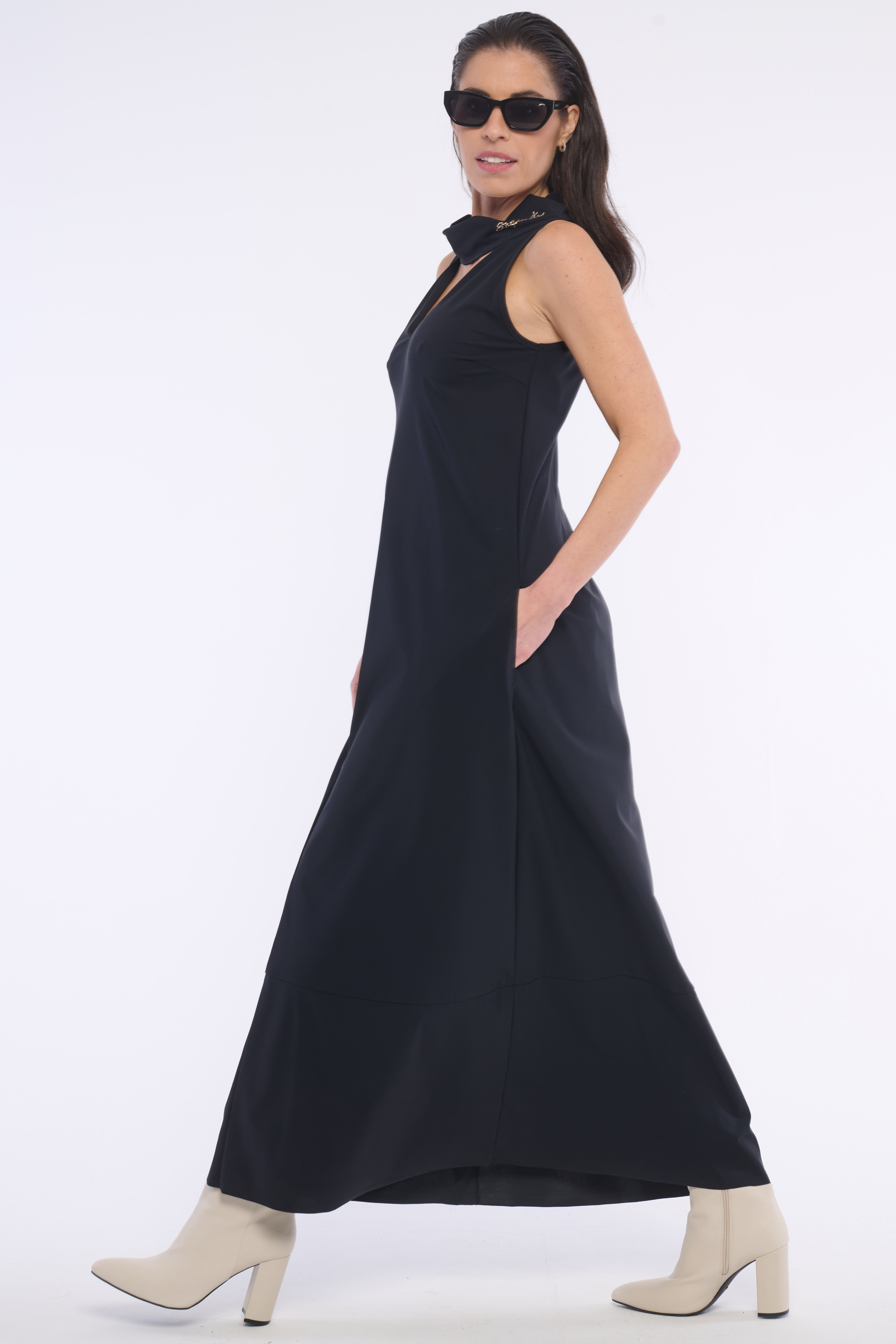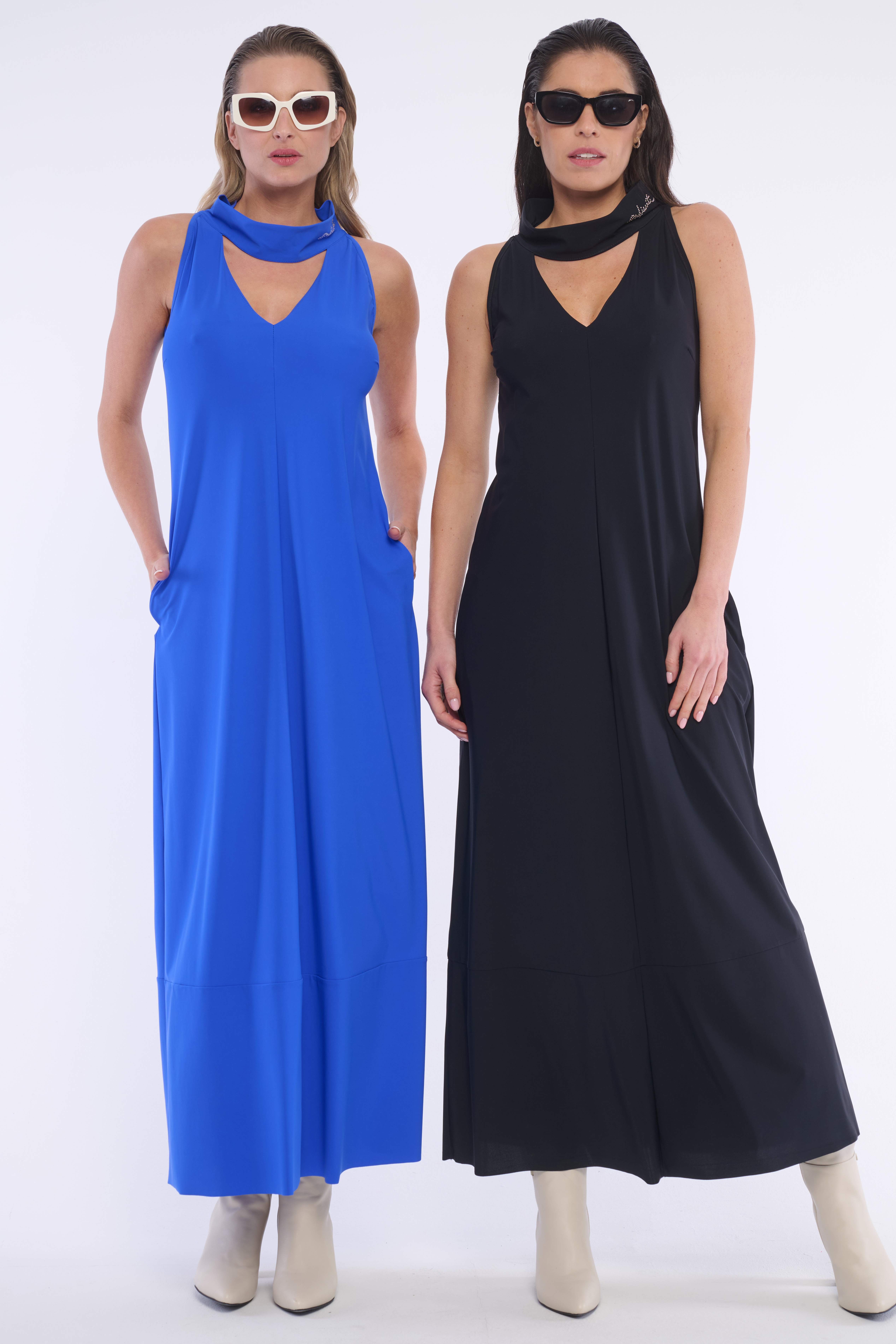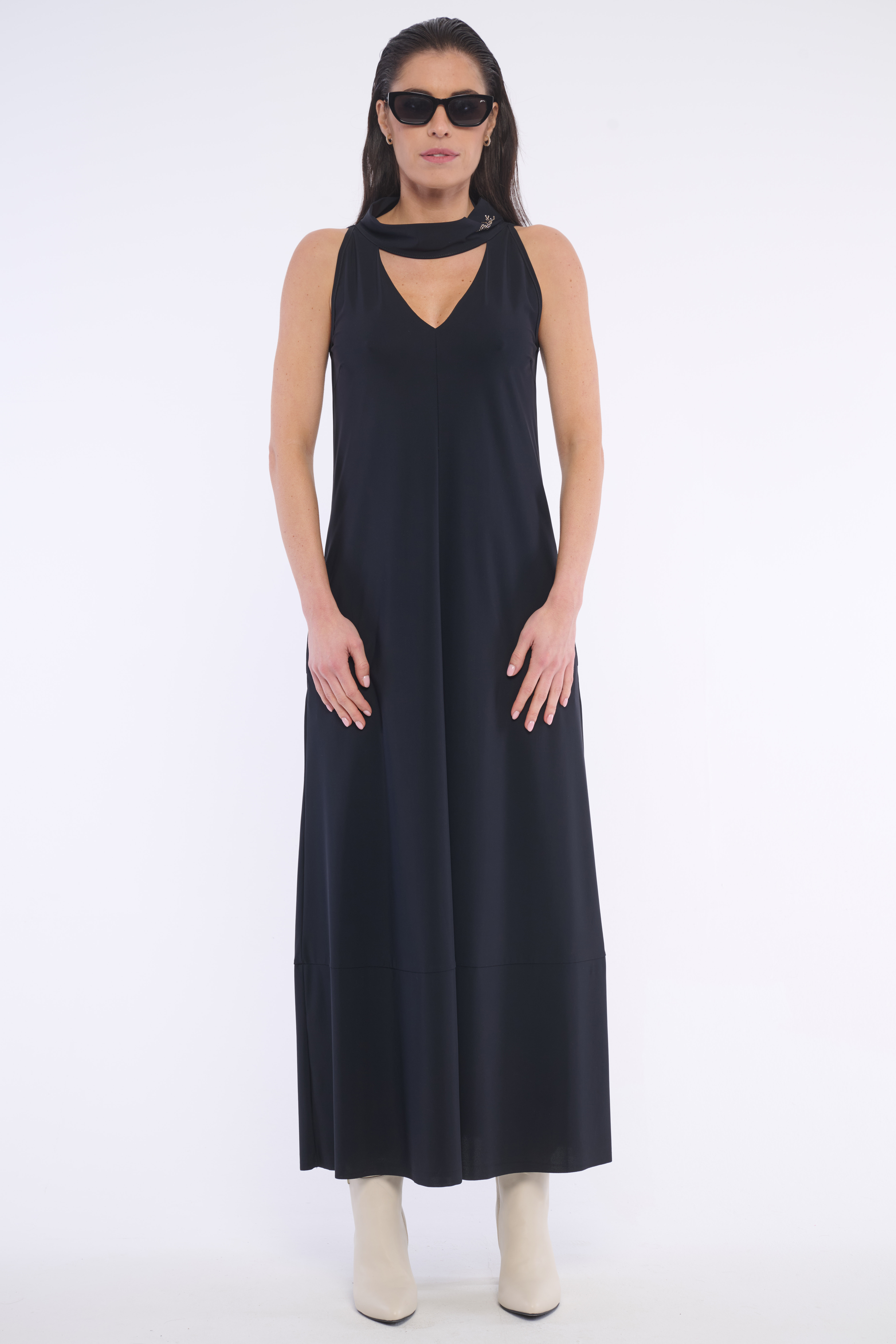 Volné šaty se stojákem a výstřihem do V z velmi příjemného, kvalitního materiálu. Detail na krku tvoří logo z luxusních krystalů Preciosa. Dostupné ve dvou barevných variantách.