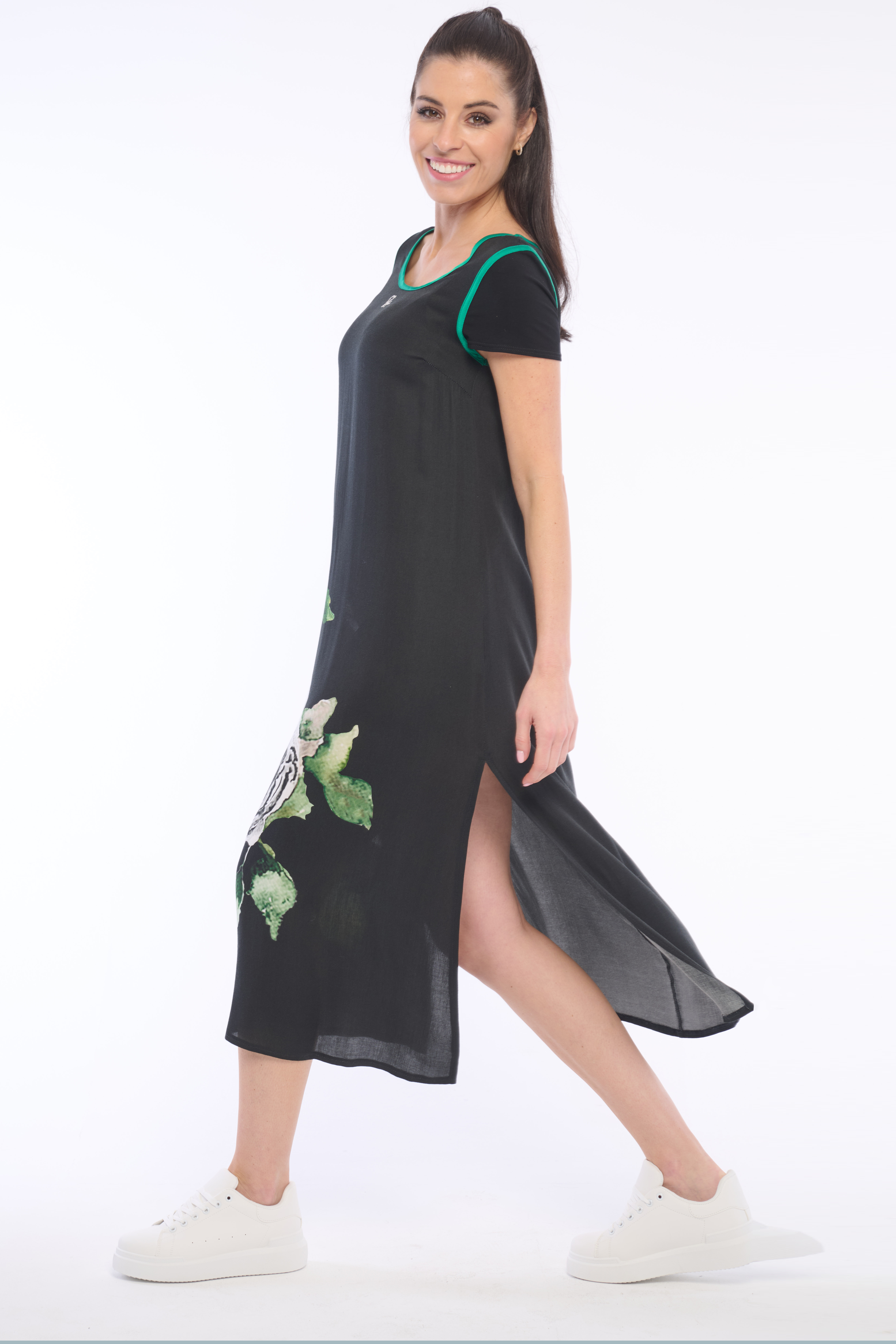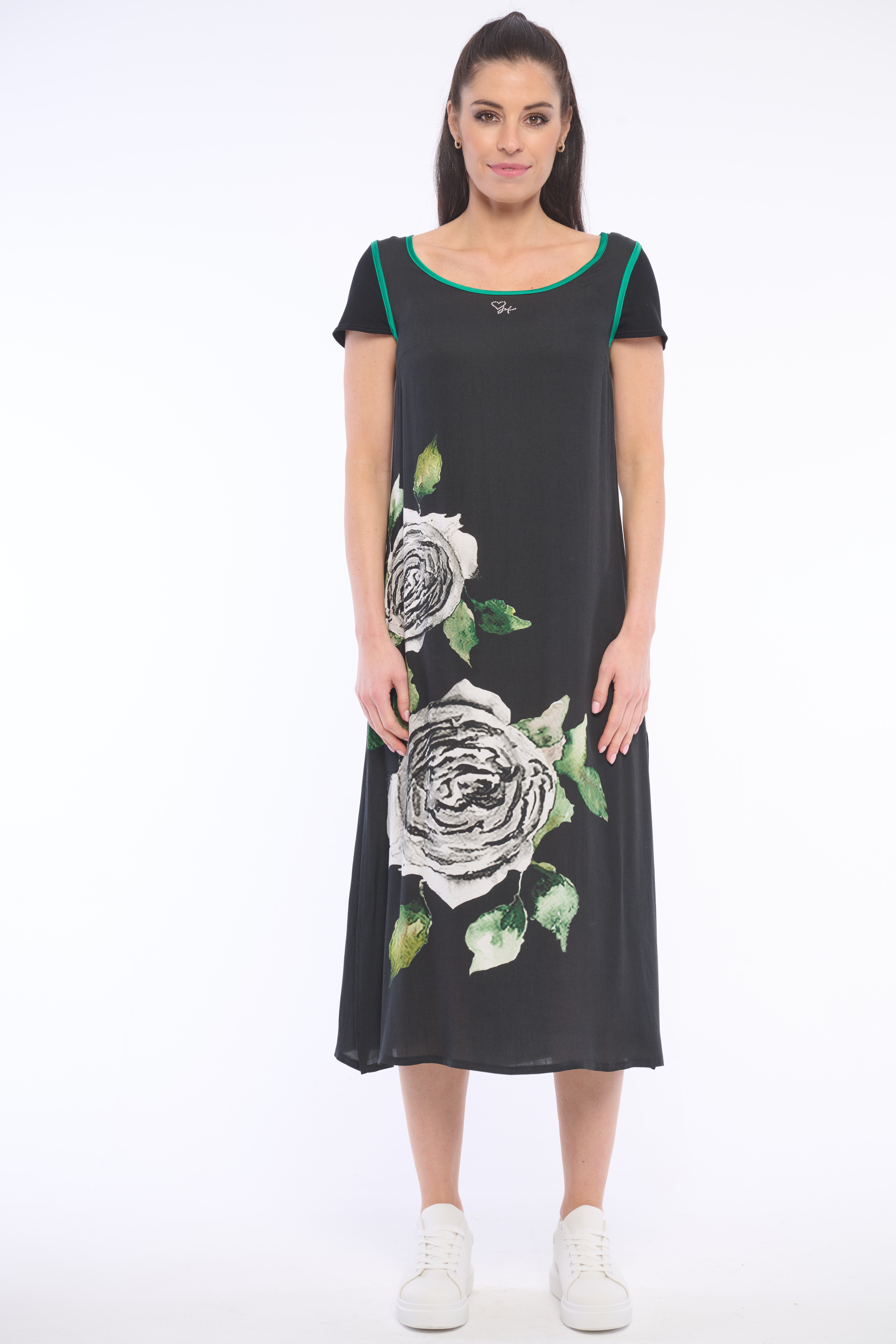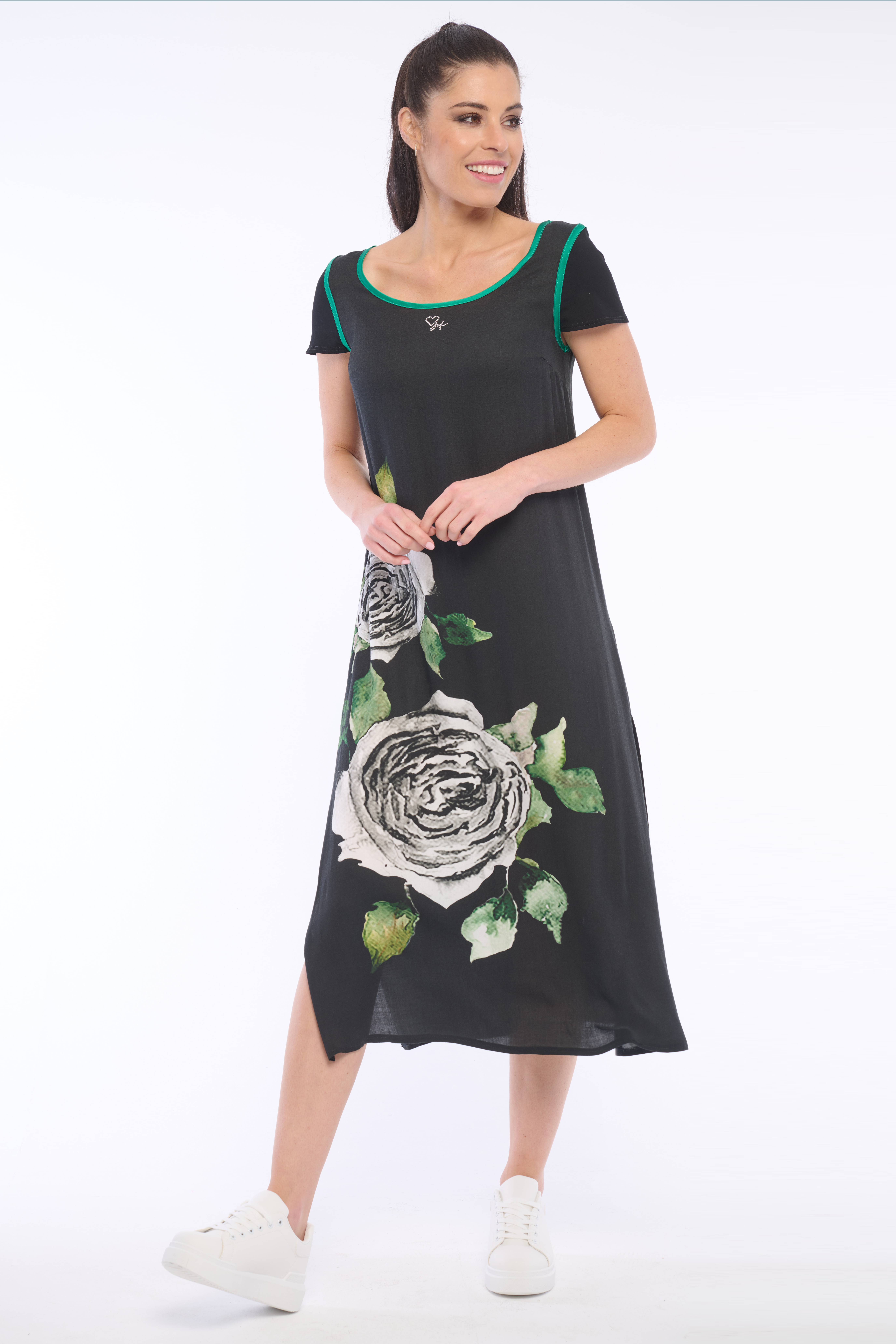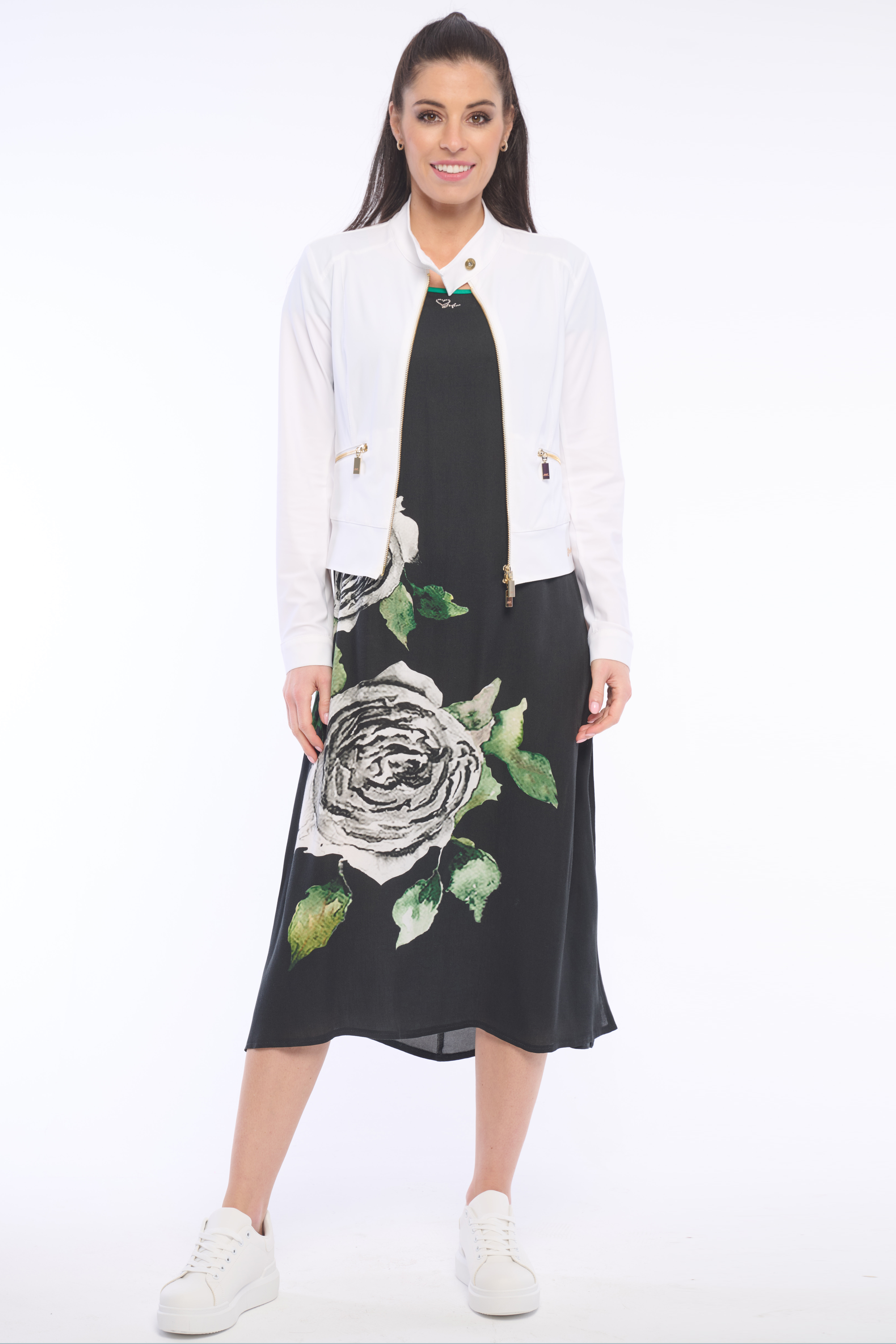 Midi květinové šaty s žebrovými krátkými rukávy, doplněné jemným logem z luxusních krystalů Preciosa. Svým jedinečným vzorem zaujmou každého. Dostupné ve dvou květovaných variantách.