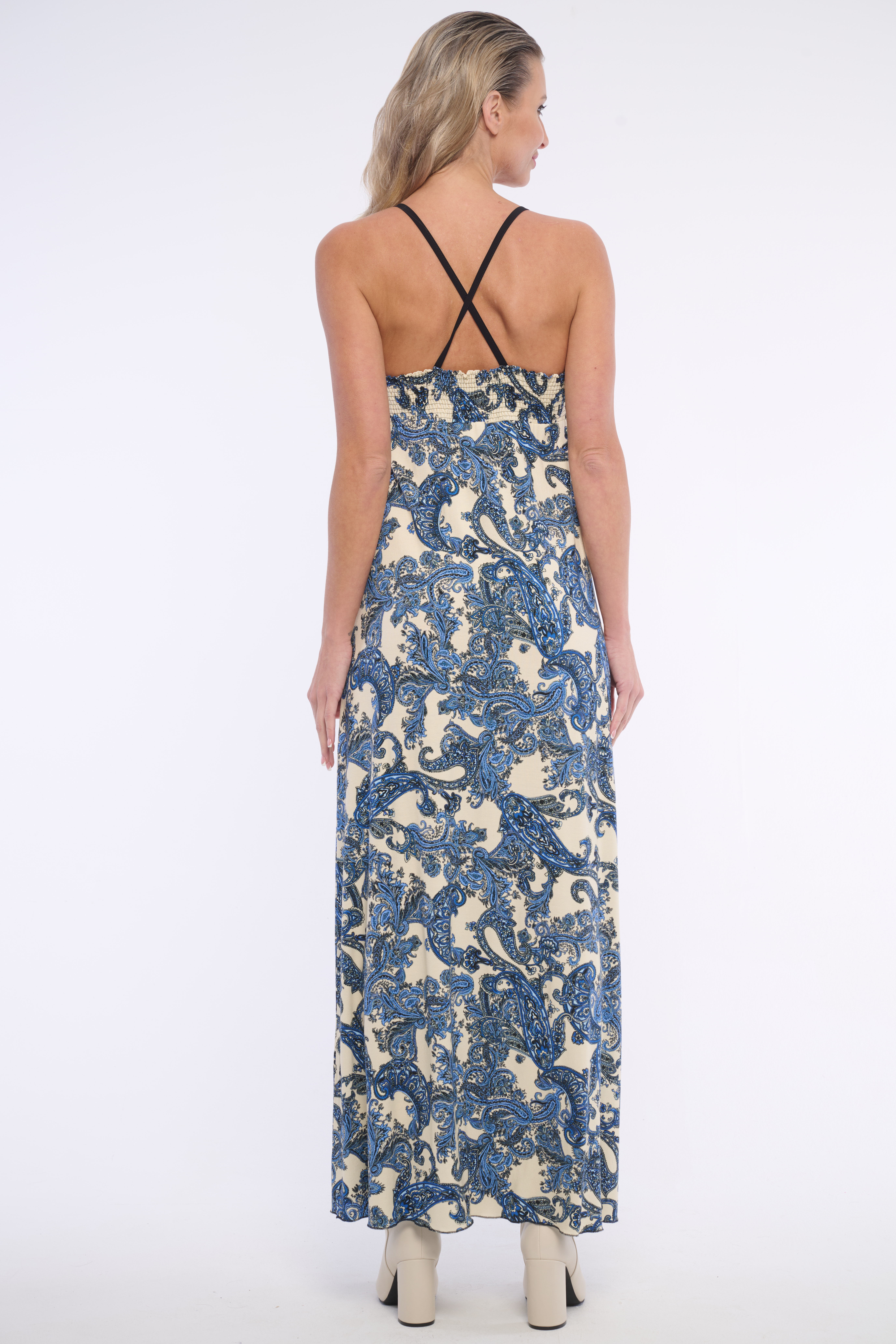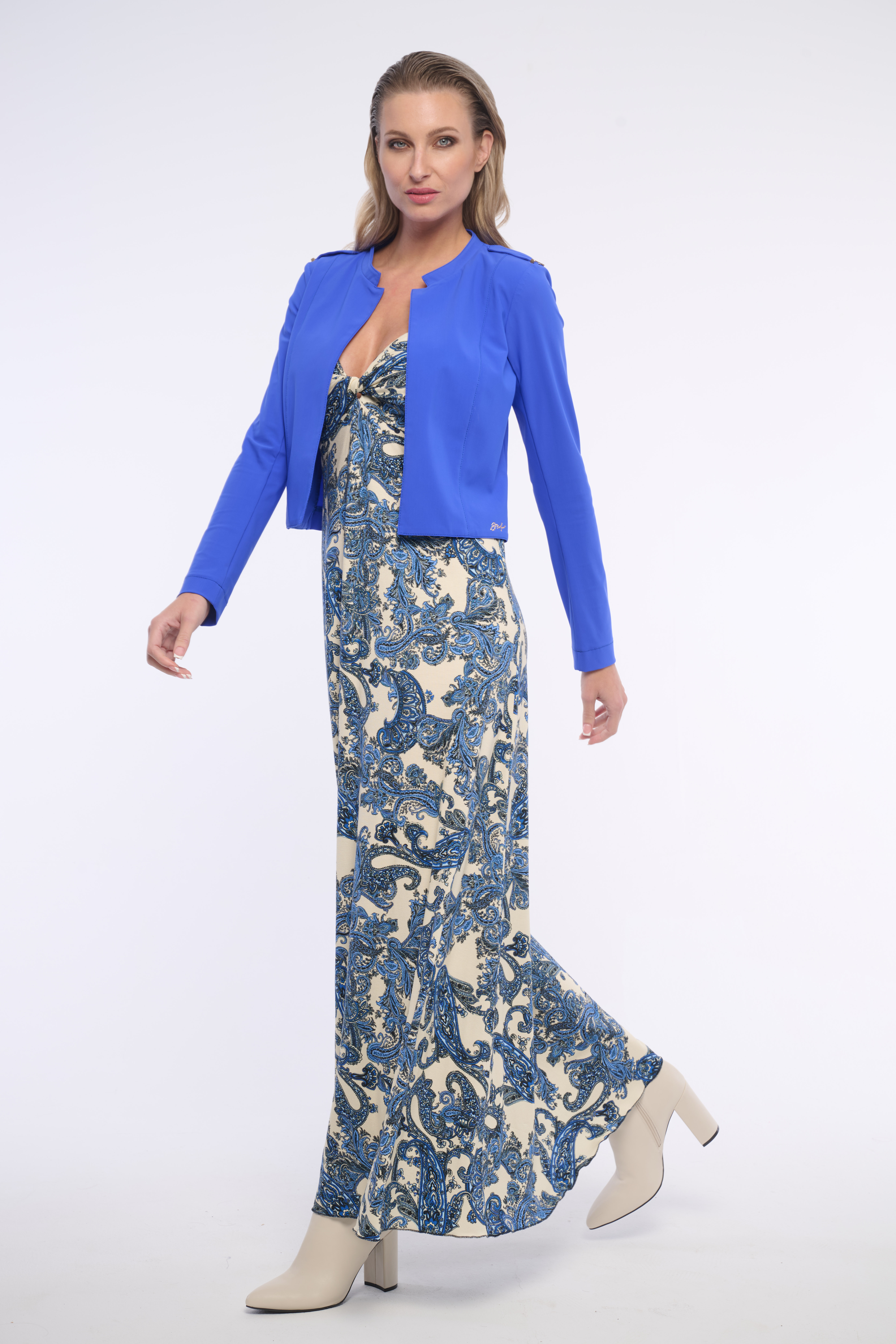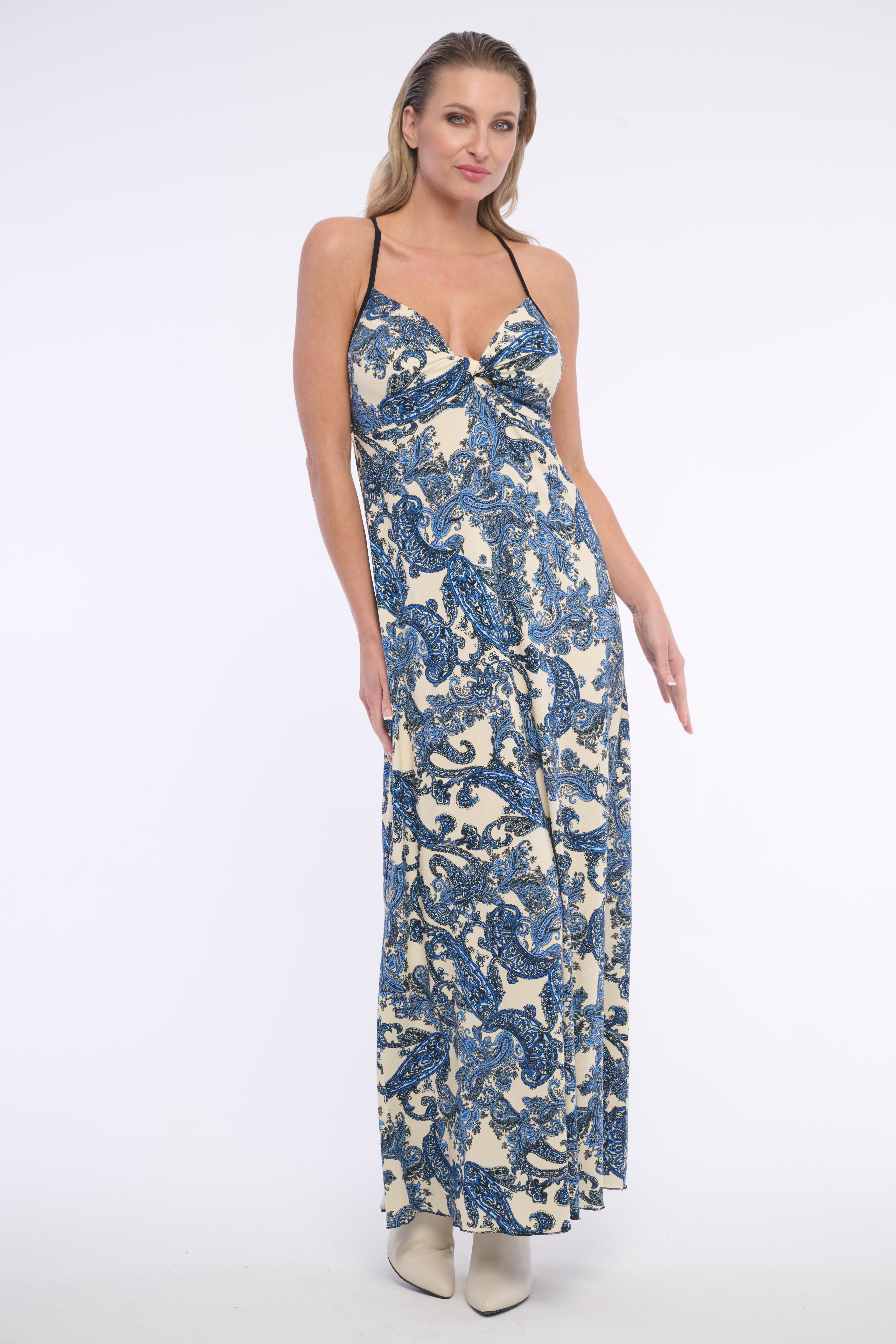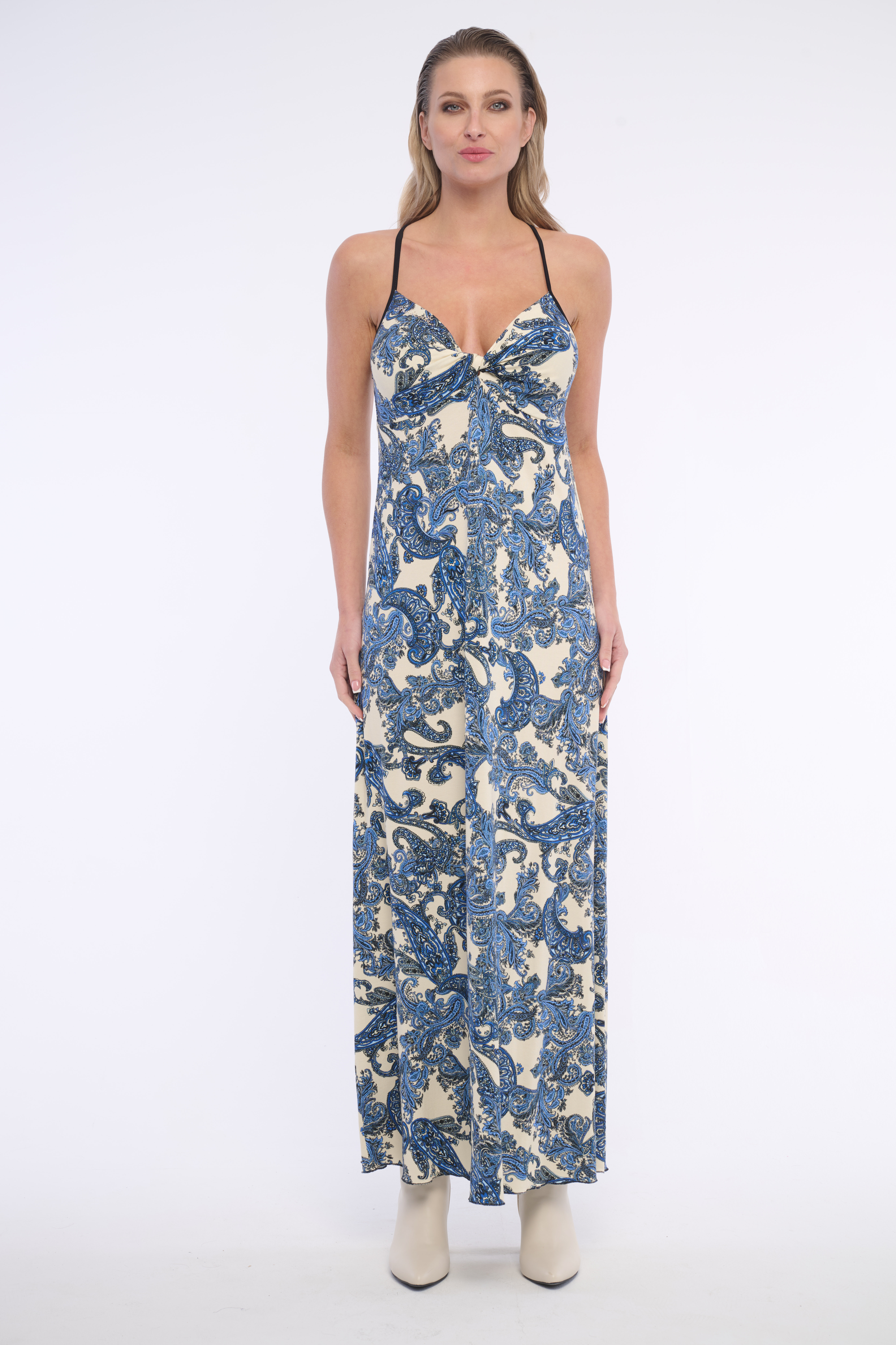 Dlouhé, slušivé, volné šaty s uzlem ve výstřihu do V. Jejich kašmírový vzor zaujme každého. Vhodné na volný čas i vyjímečné události. Dostupné ve dvou barevných variantách.