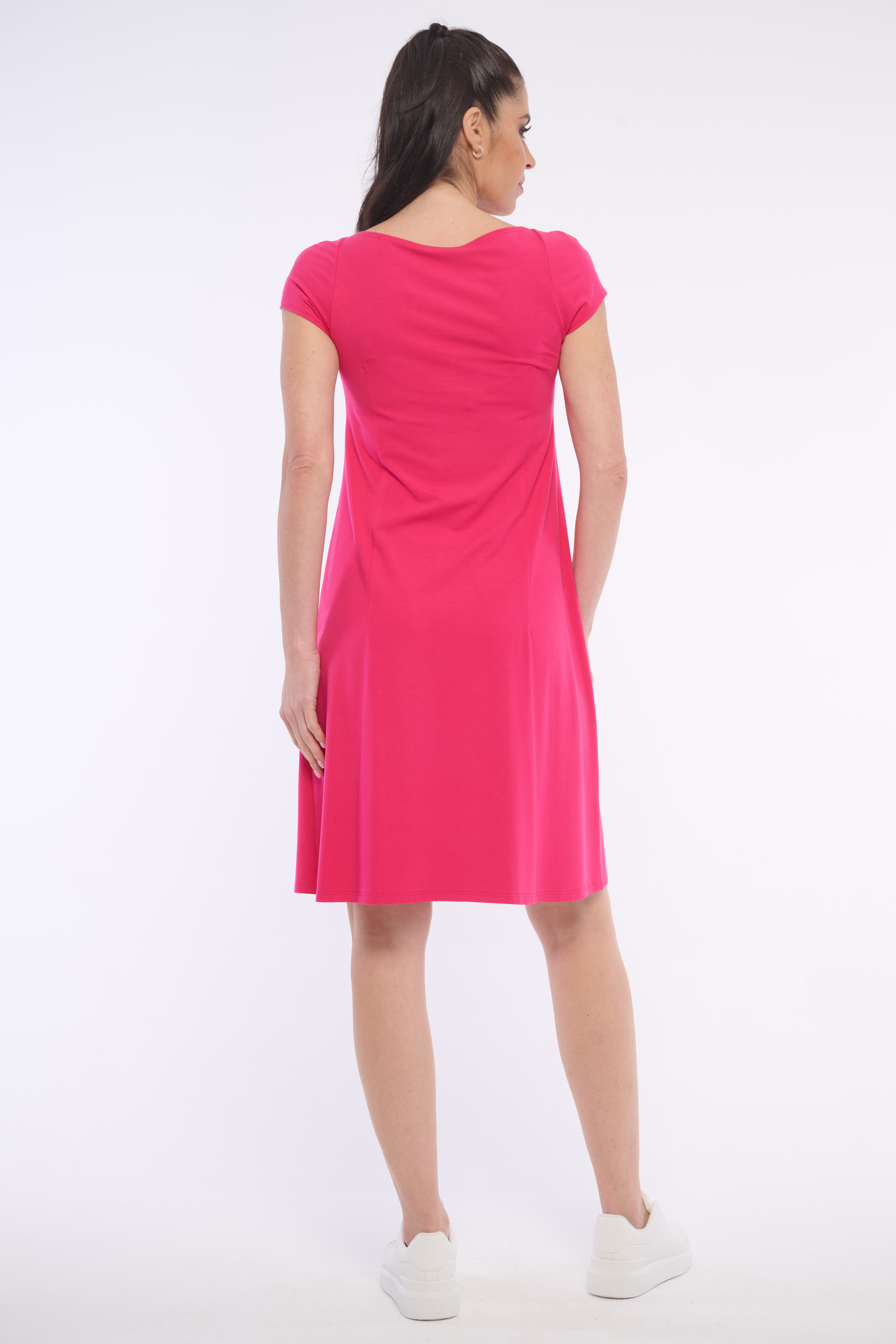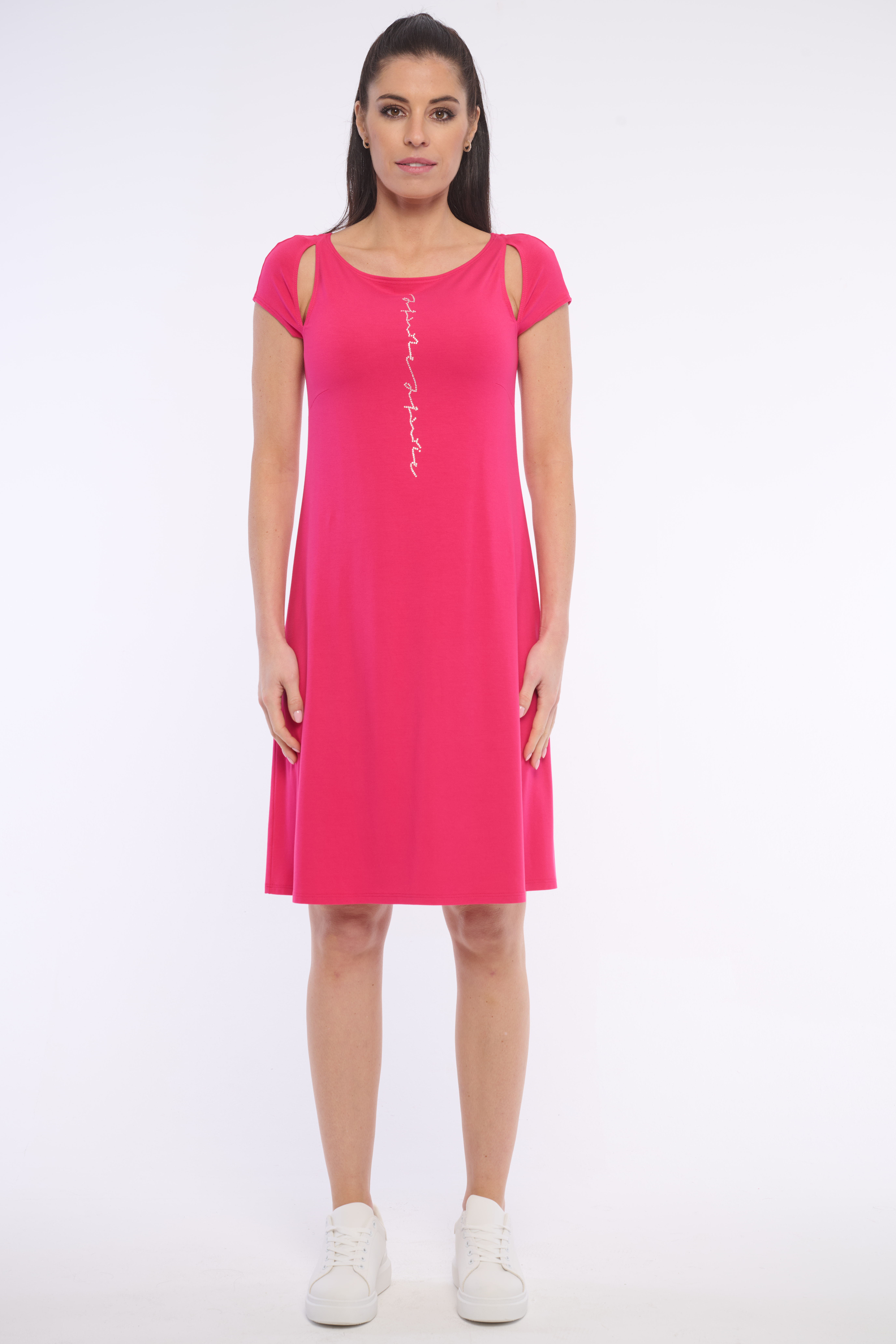 Pohodlné šaty vhodné na každou příležitost ozvláštněné průstřihy v oblasti ramen. Luxusní doplněk tvoří nápis z krystalů Preciosa. Dostupné ve třech barevných variantách.