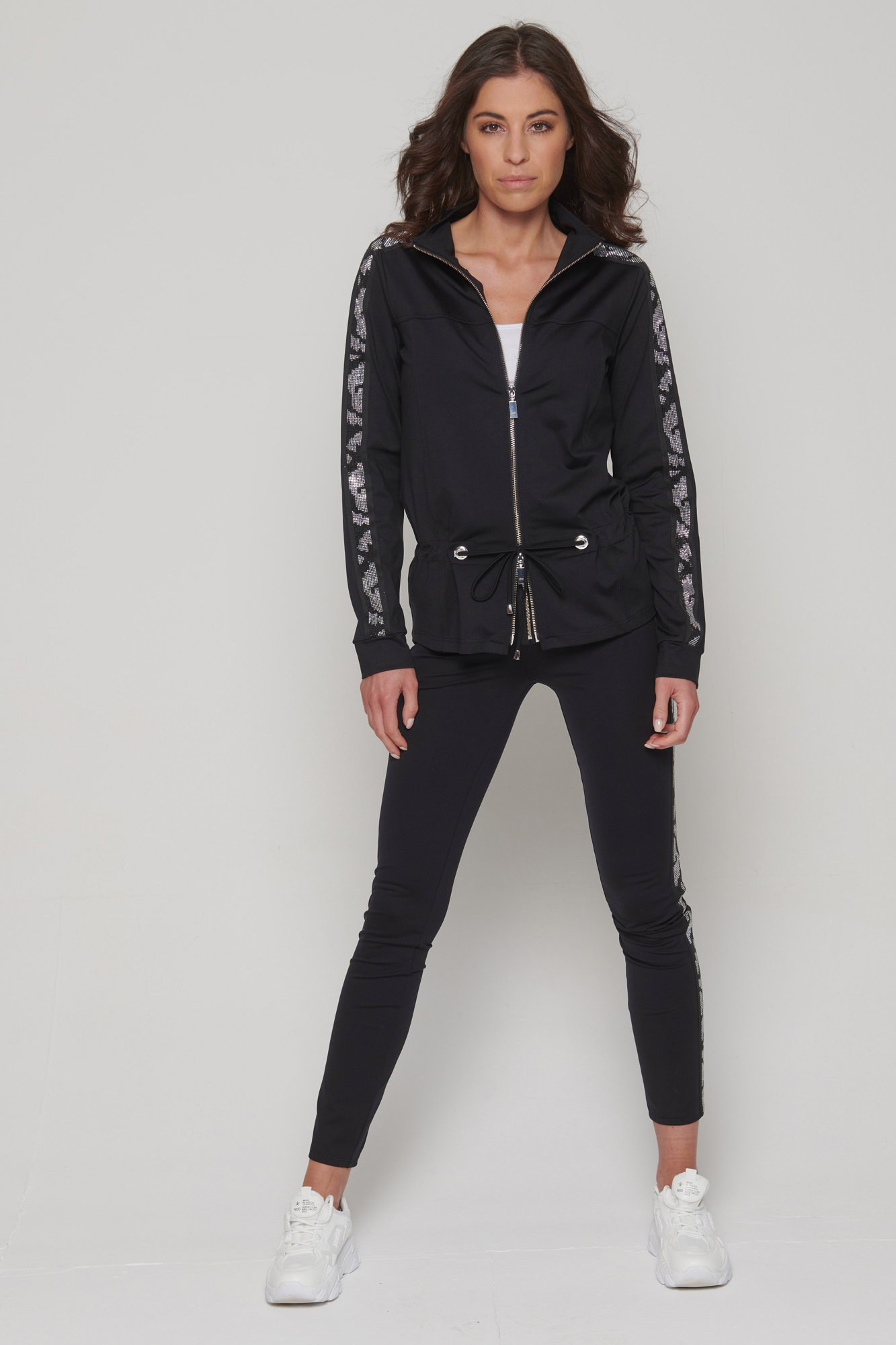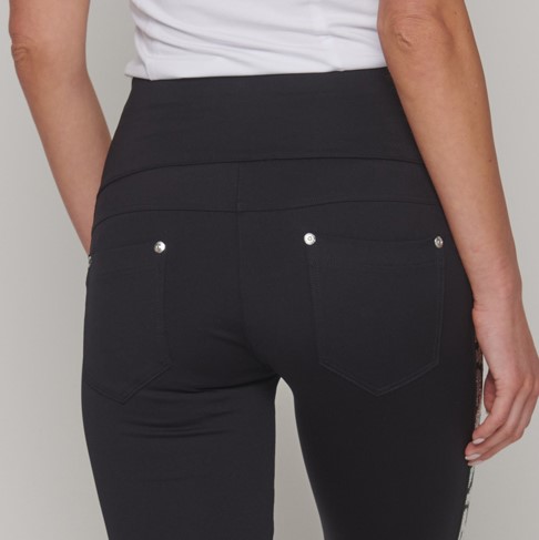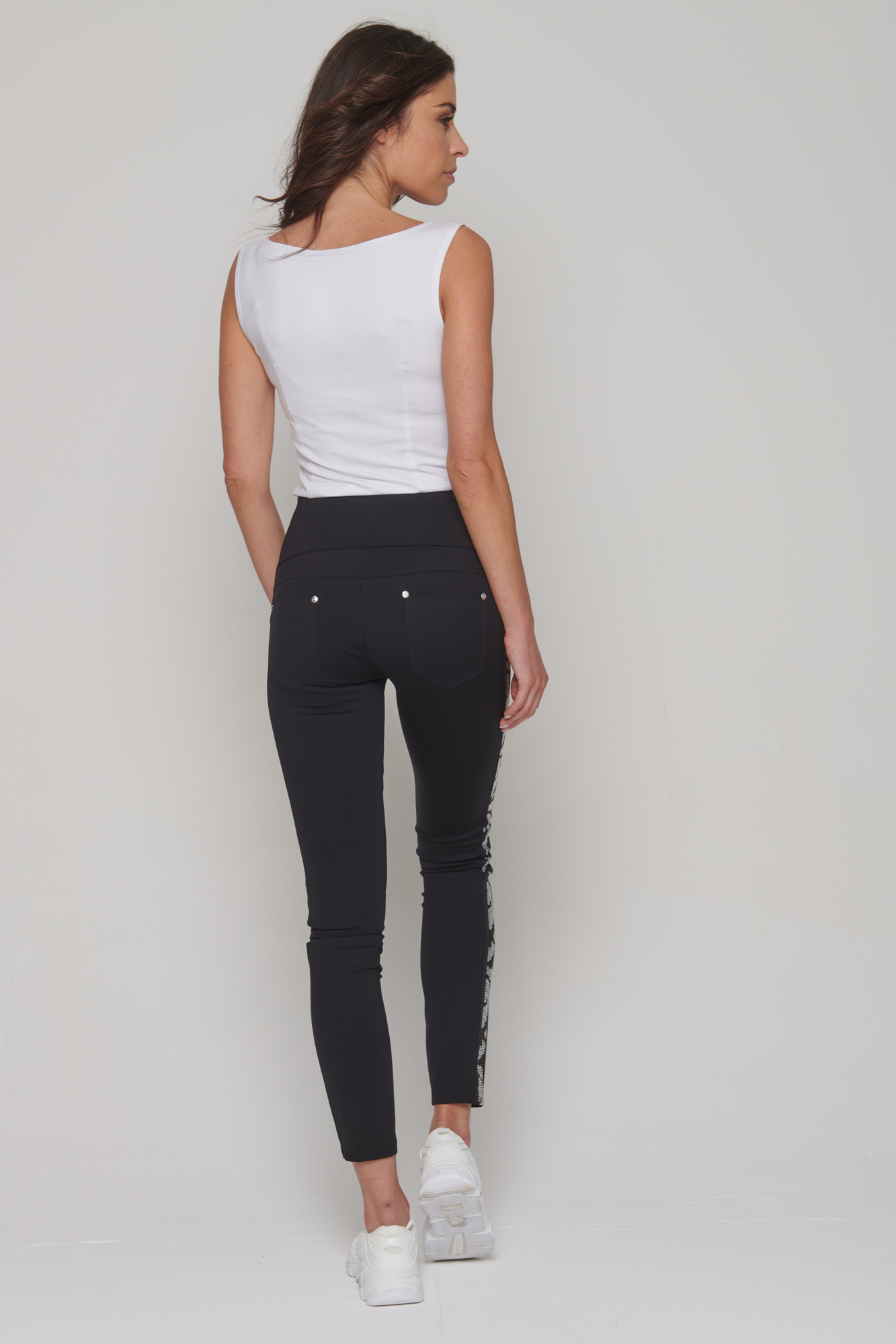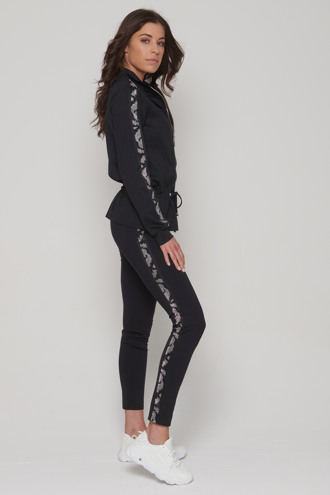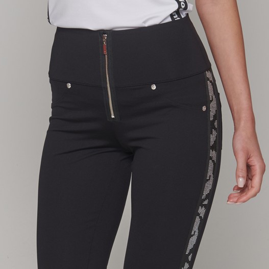 Černé legíny s krystalovým lampasem a stříbrnými doplňky.