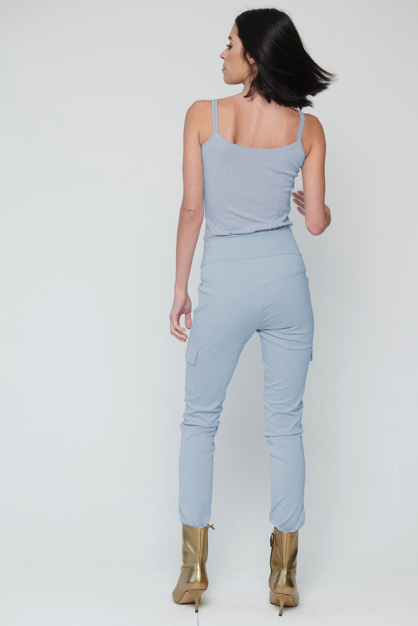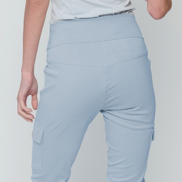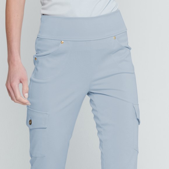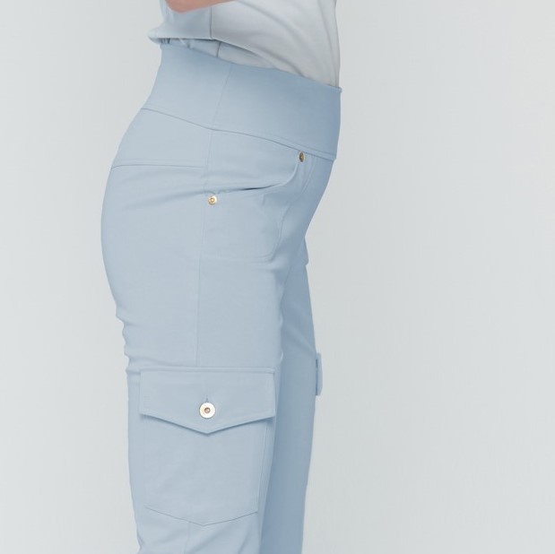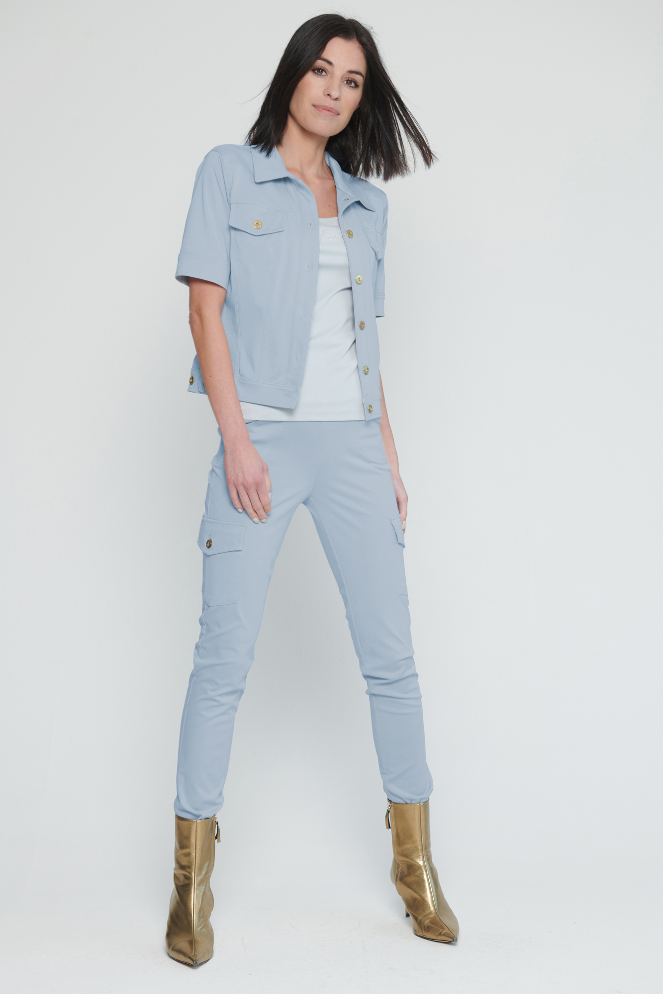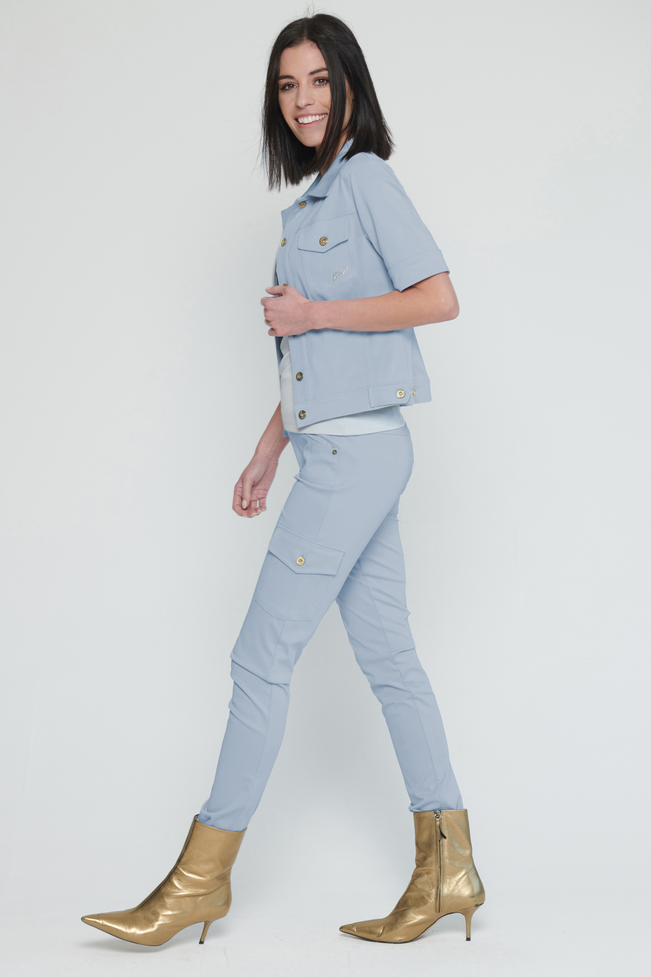 Kalhoty džínového střihu. Zlaté knoflíky a doplňky.