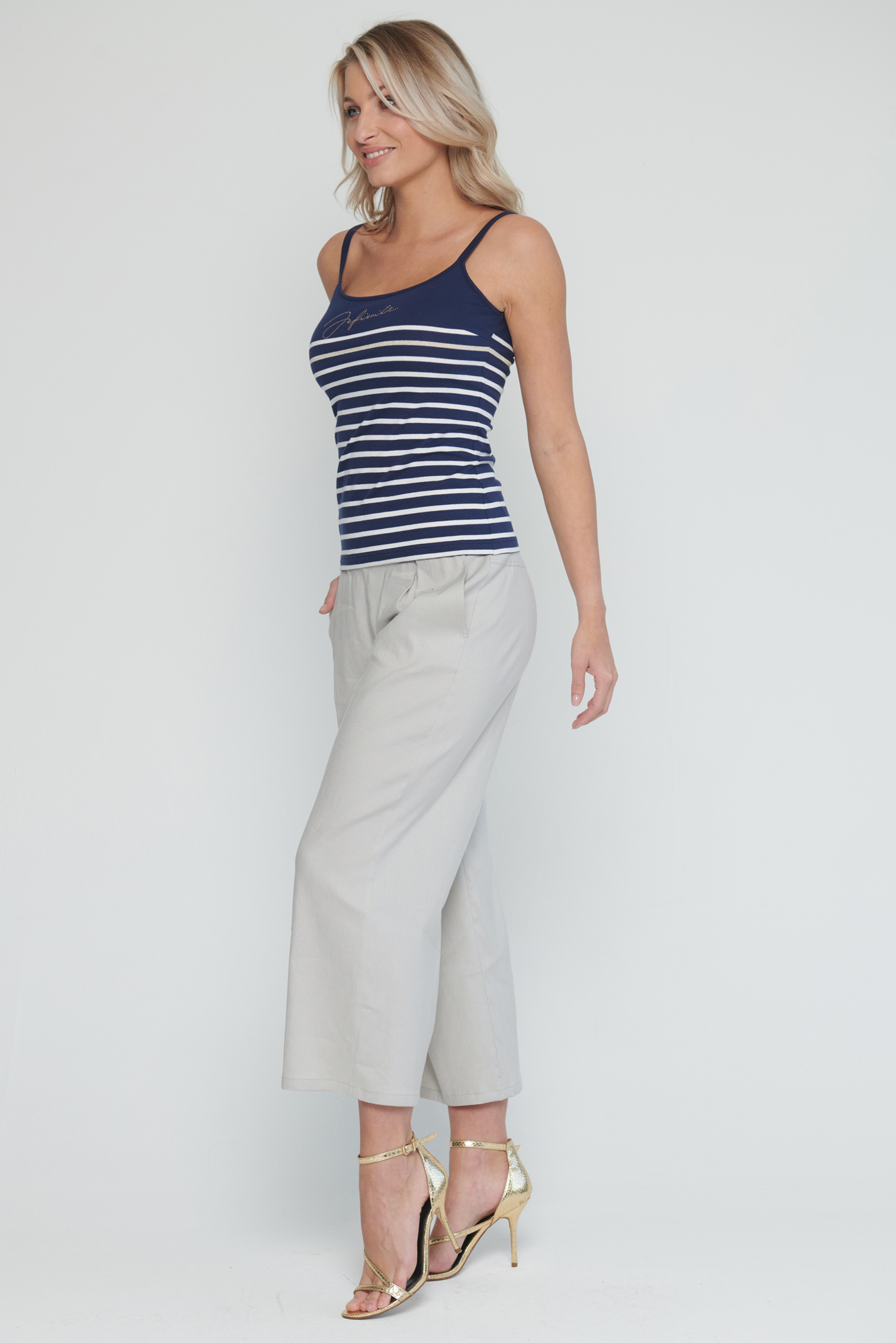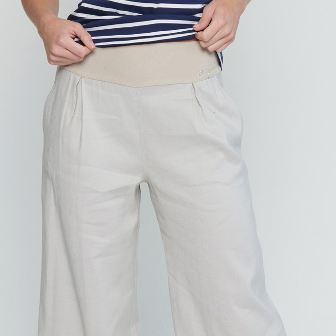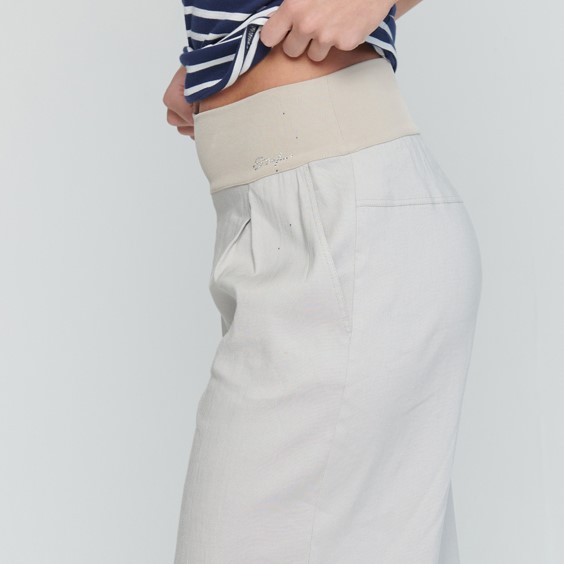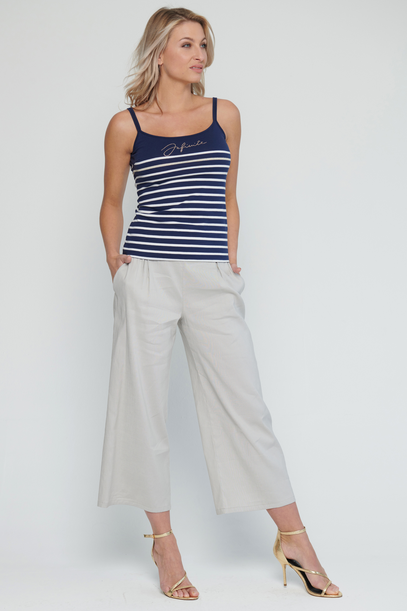 Široké culottes kalhoty do půlky lýtek. V pase strečový úplet. Na předním díle malé efektní crystal logo INF.