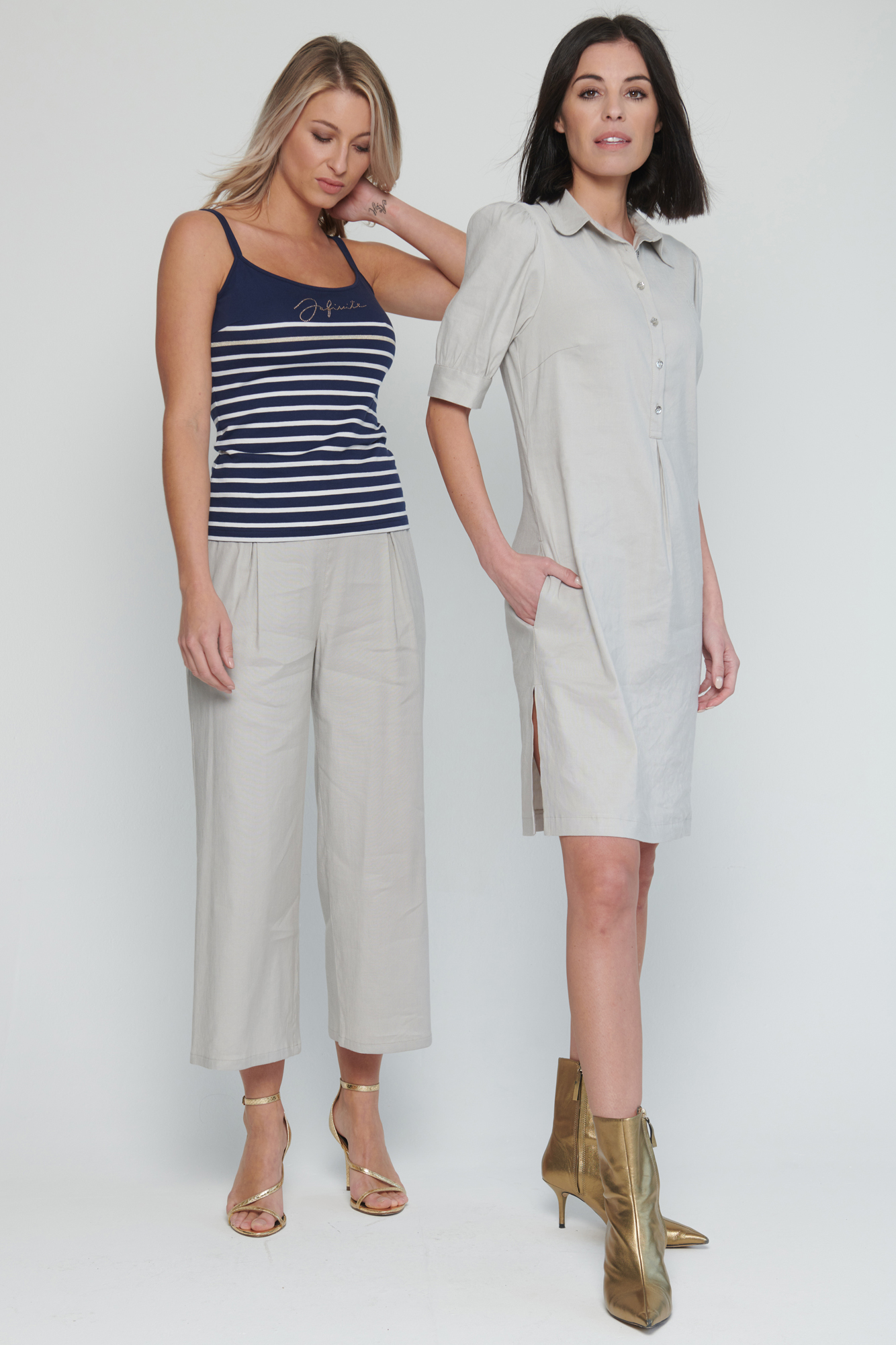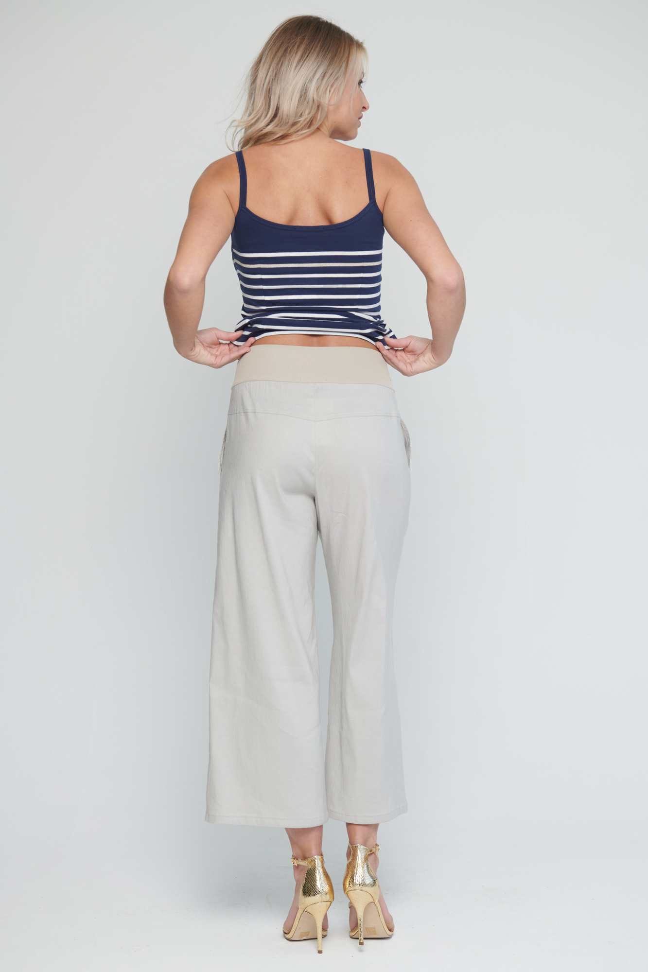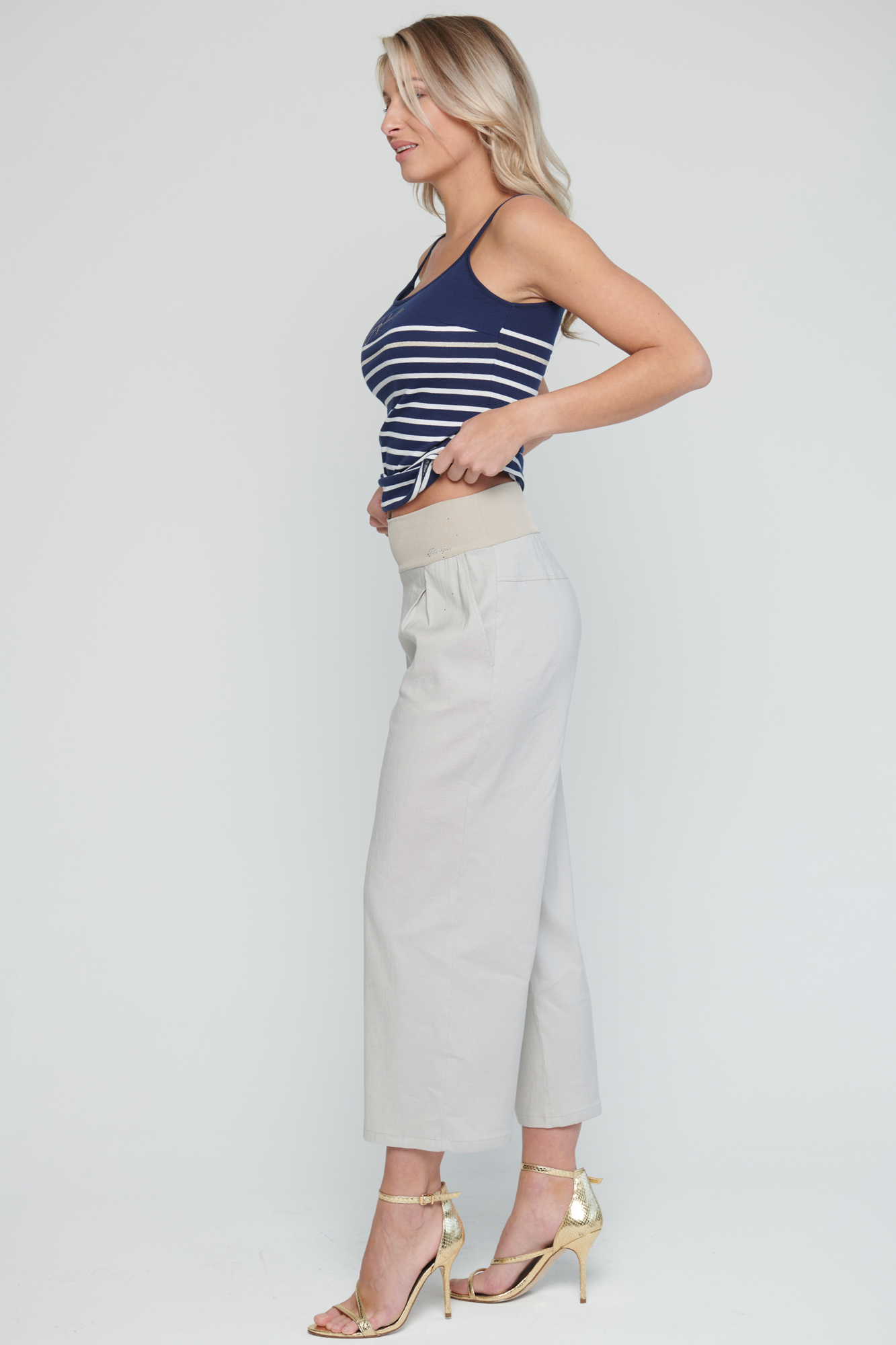 Široké culottes kalhoty do půlky lýtek. V pase strečový úplet. Na předním díle malé efektní crystal logo INF.