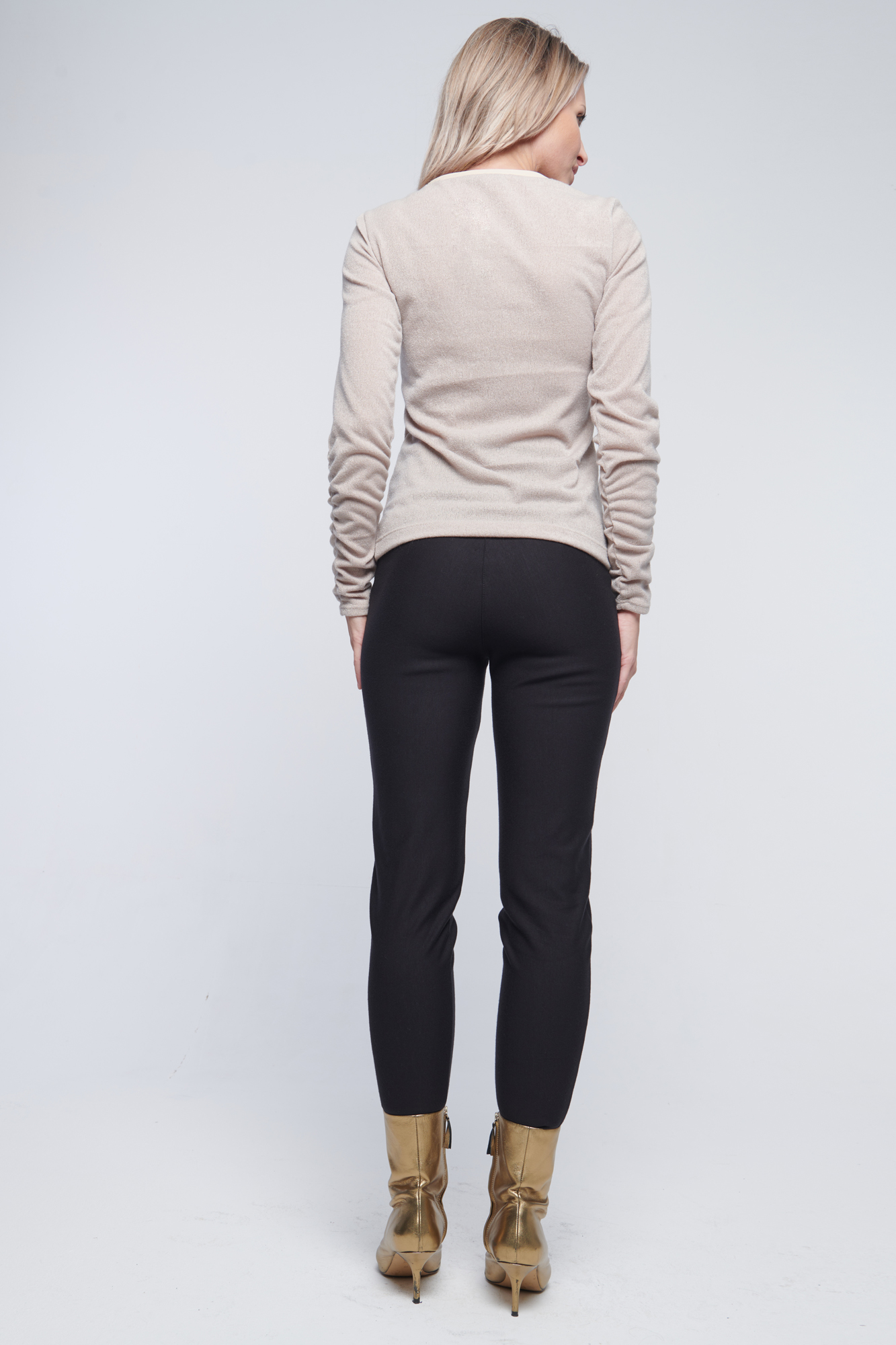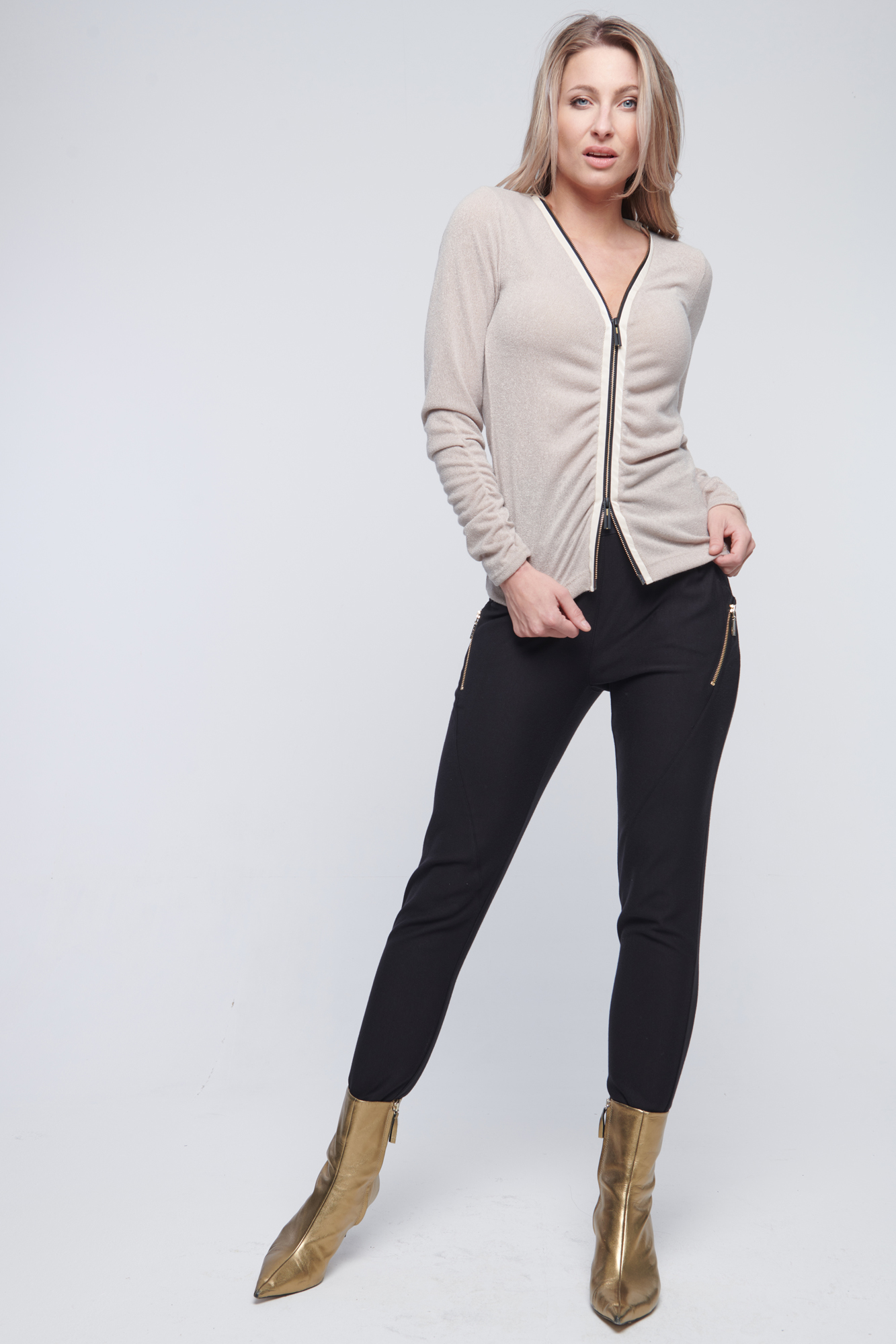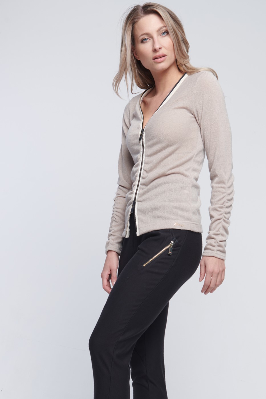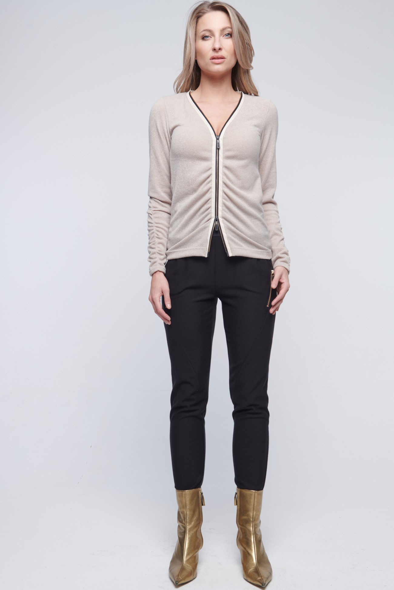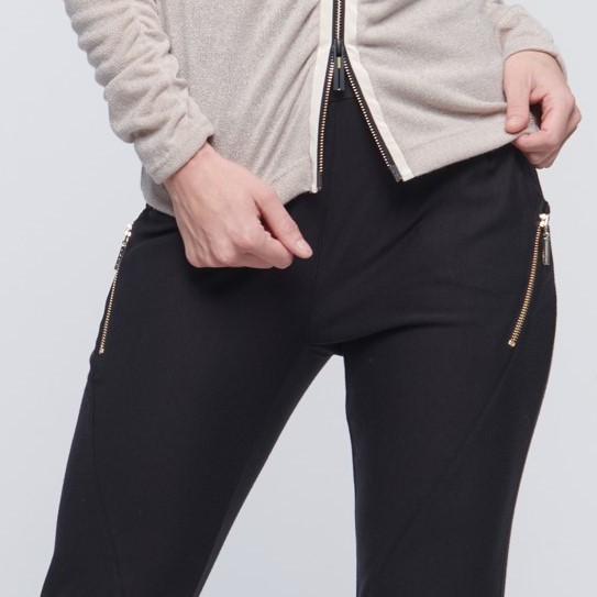 Kalhoty volnějšího střihu se strečovým pasem. Crystal logo INF v pase. Zlaté zipy.