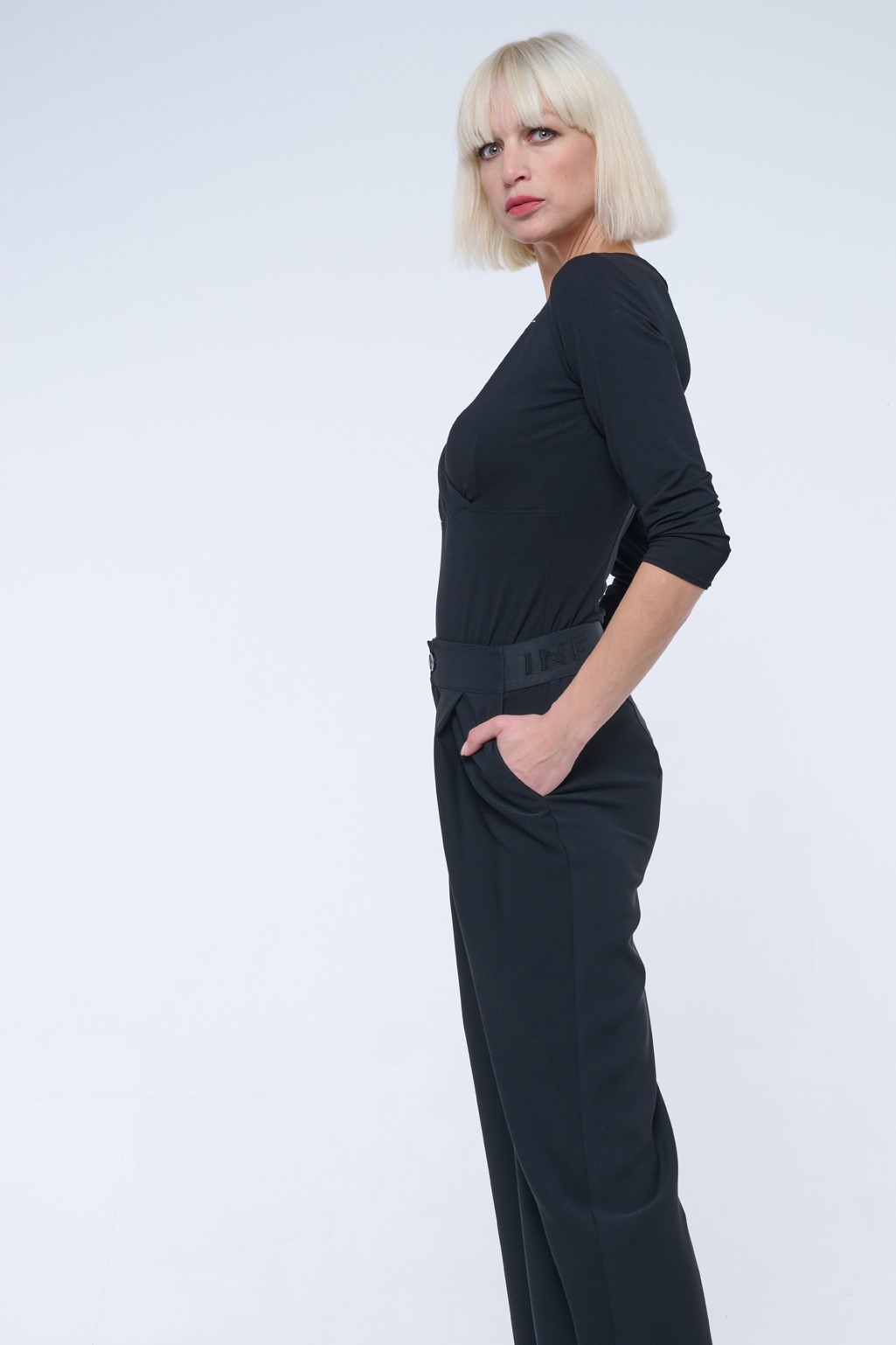 Kalhoty volnějšího střihu, v pase guma INF.