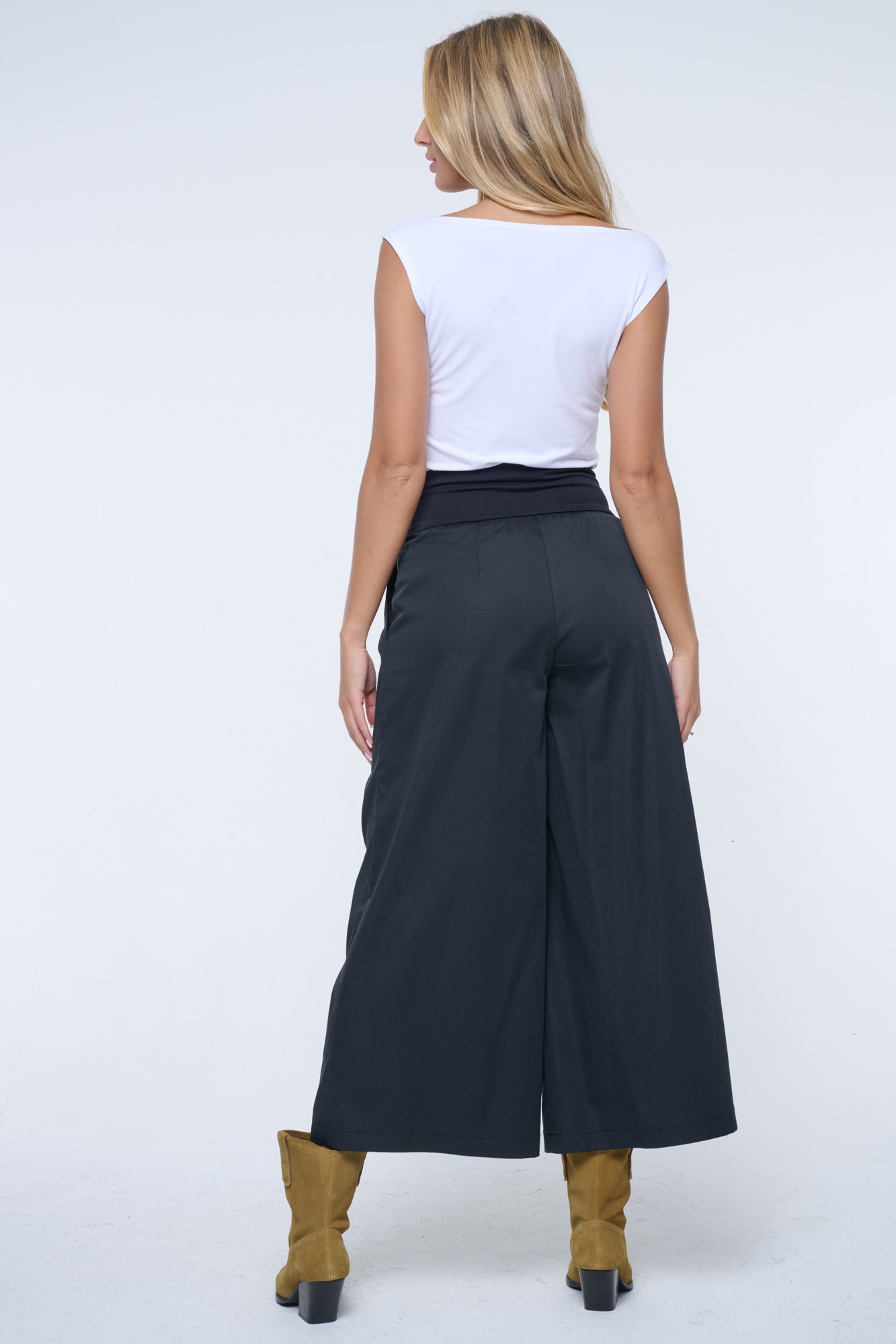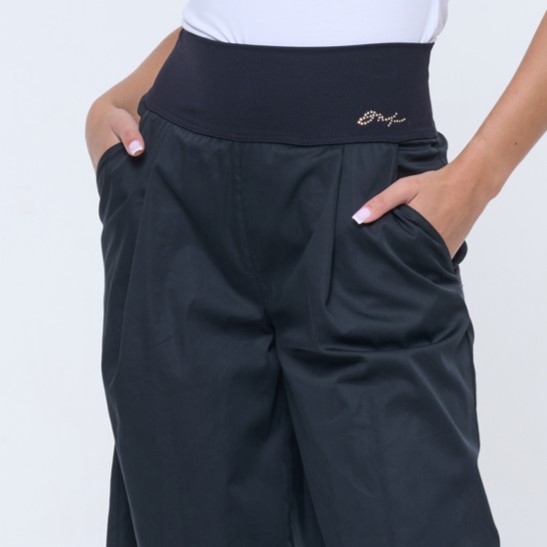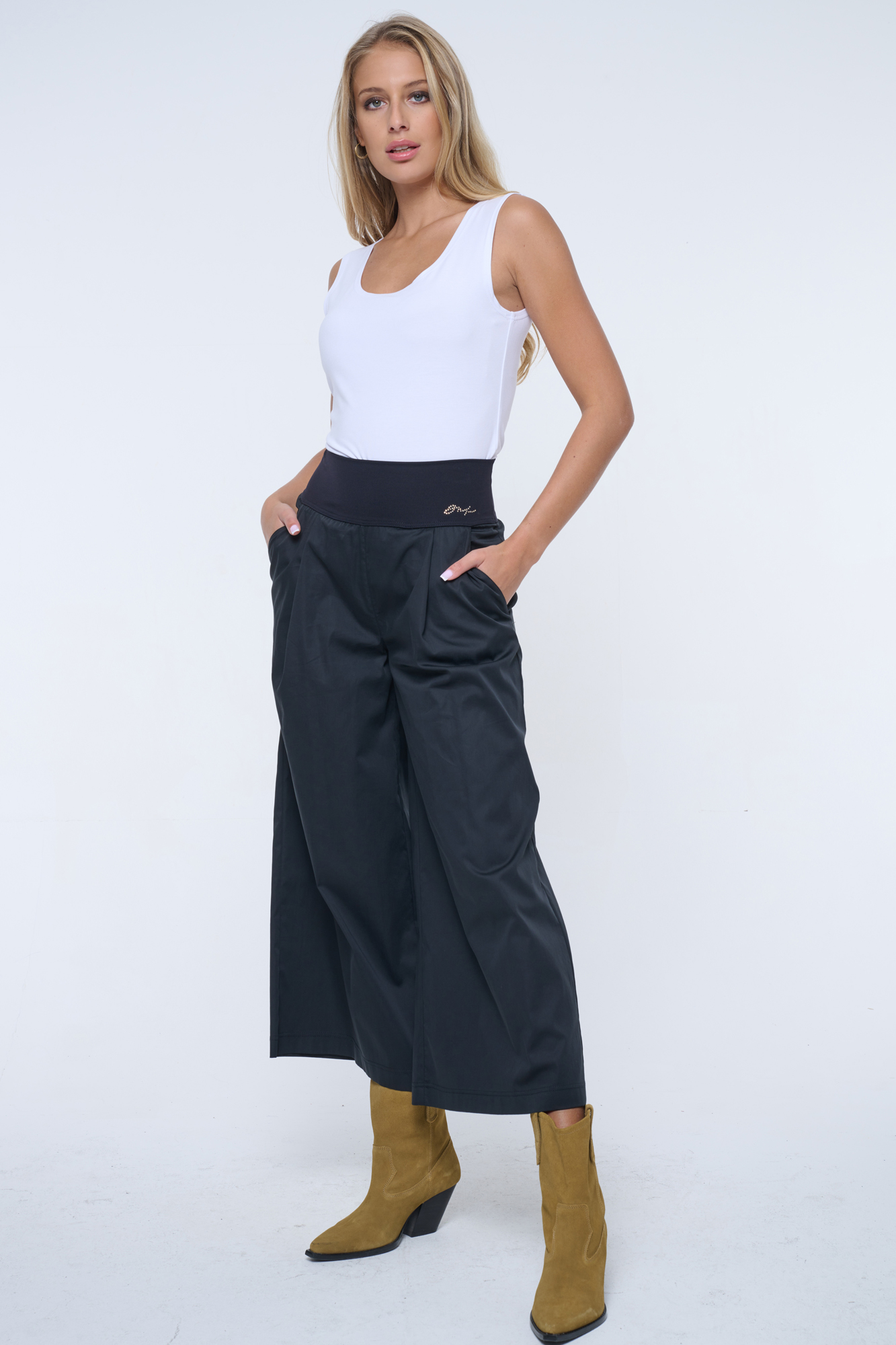 Culottes široké kalhoty. Malé zlaté krystalové logo INF v pase. Pas je ze strečového materiálu.