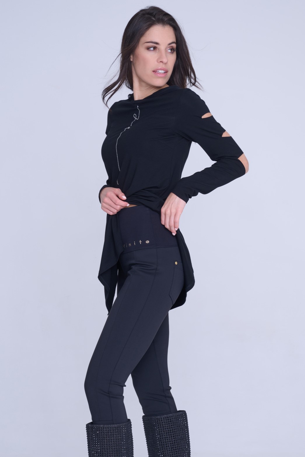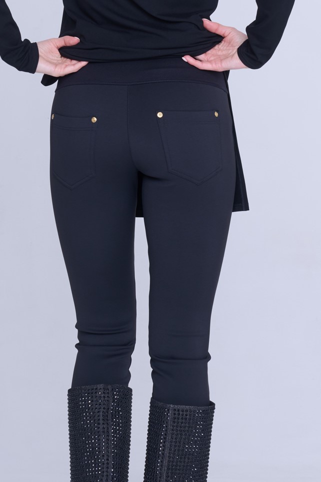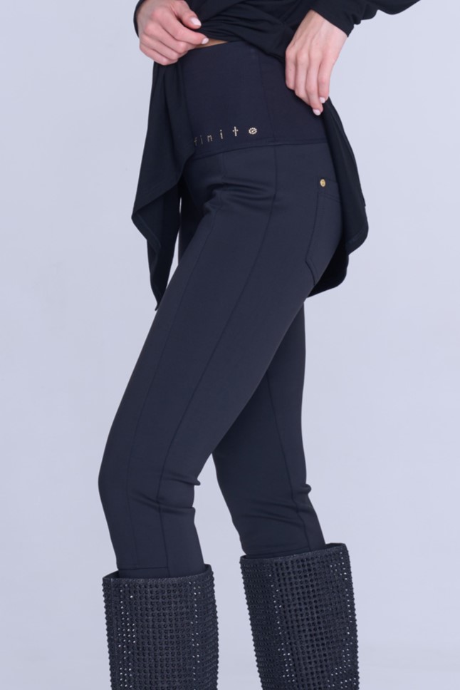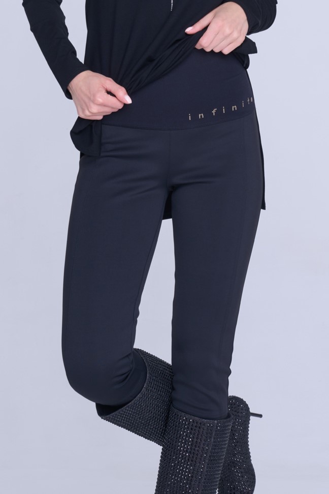 Kalhoty legínového typu. Na zadním díle kapsy. V pase strečový úplet a nápis Infinite ze zlatých krystalů Preciosa.