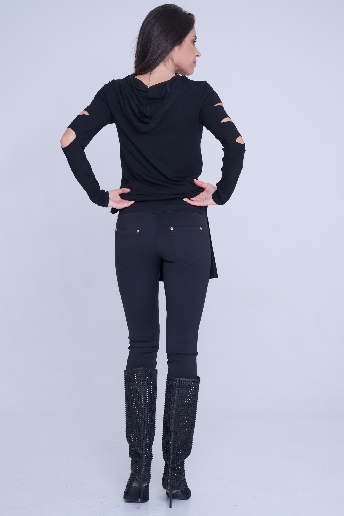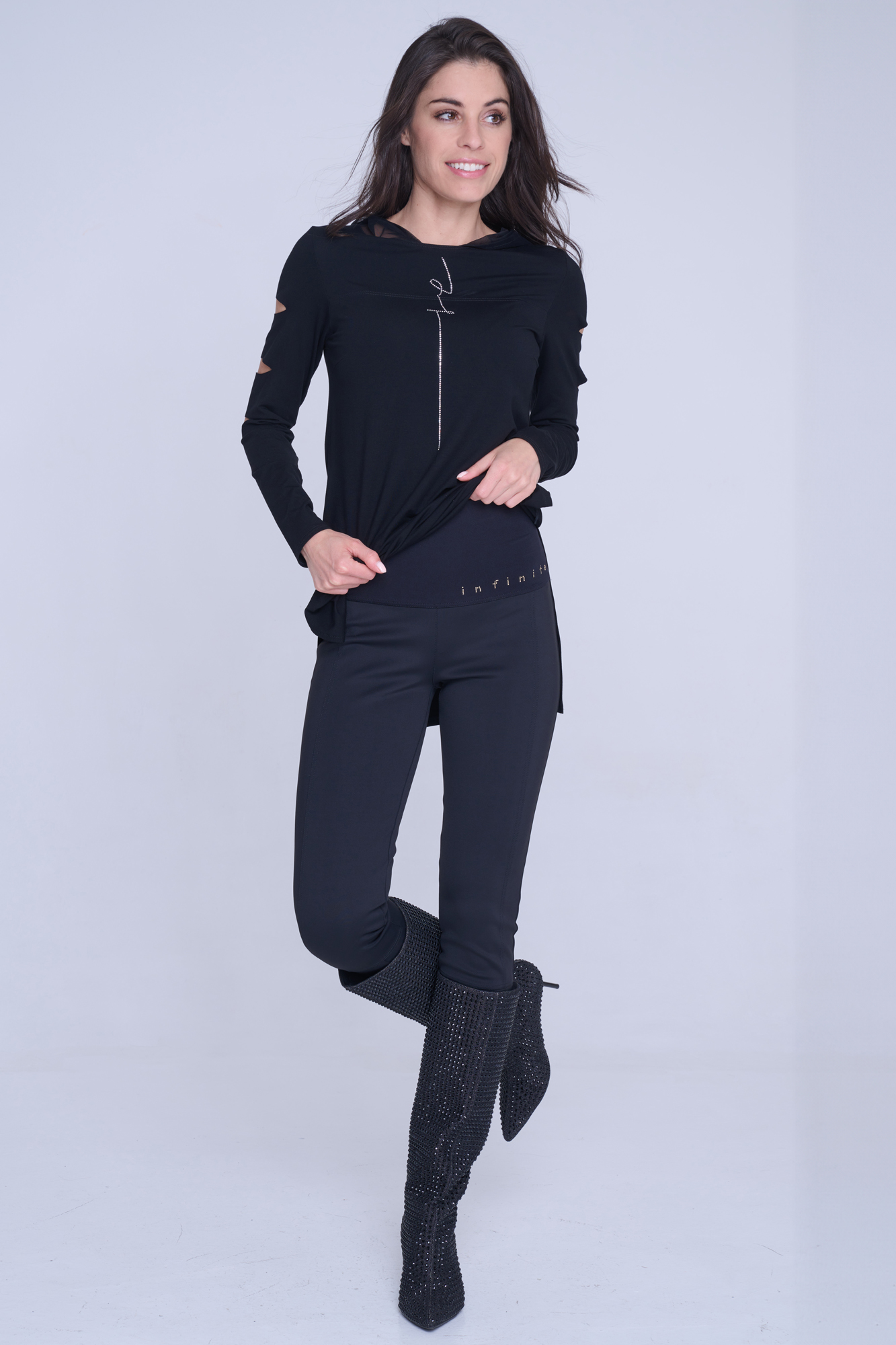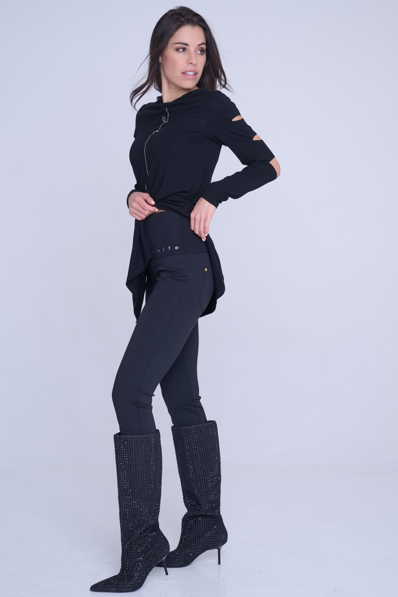 Kalhoty legínového typu. Na zadním díle kapsy. V pase strečový úplet a nápis Infinite ze zlatých krystalů Preciosa.