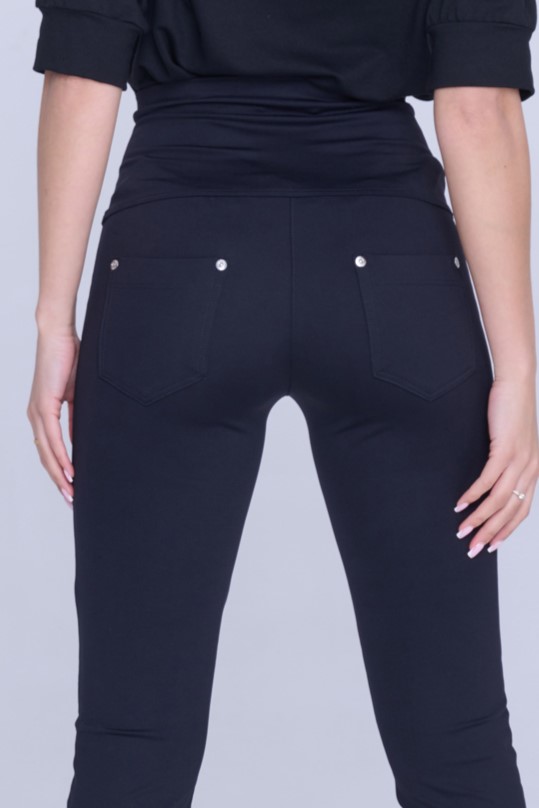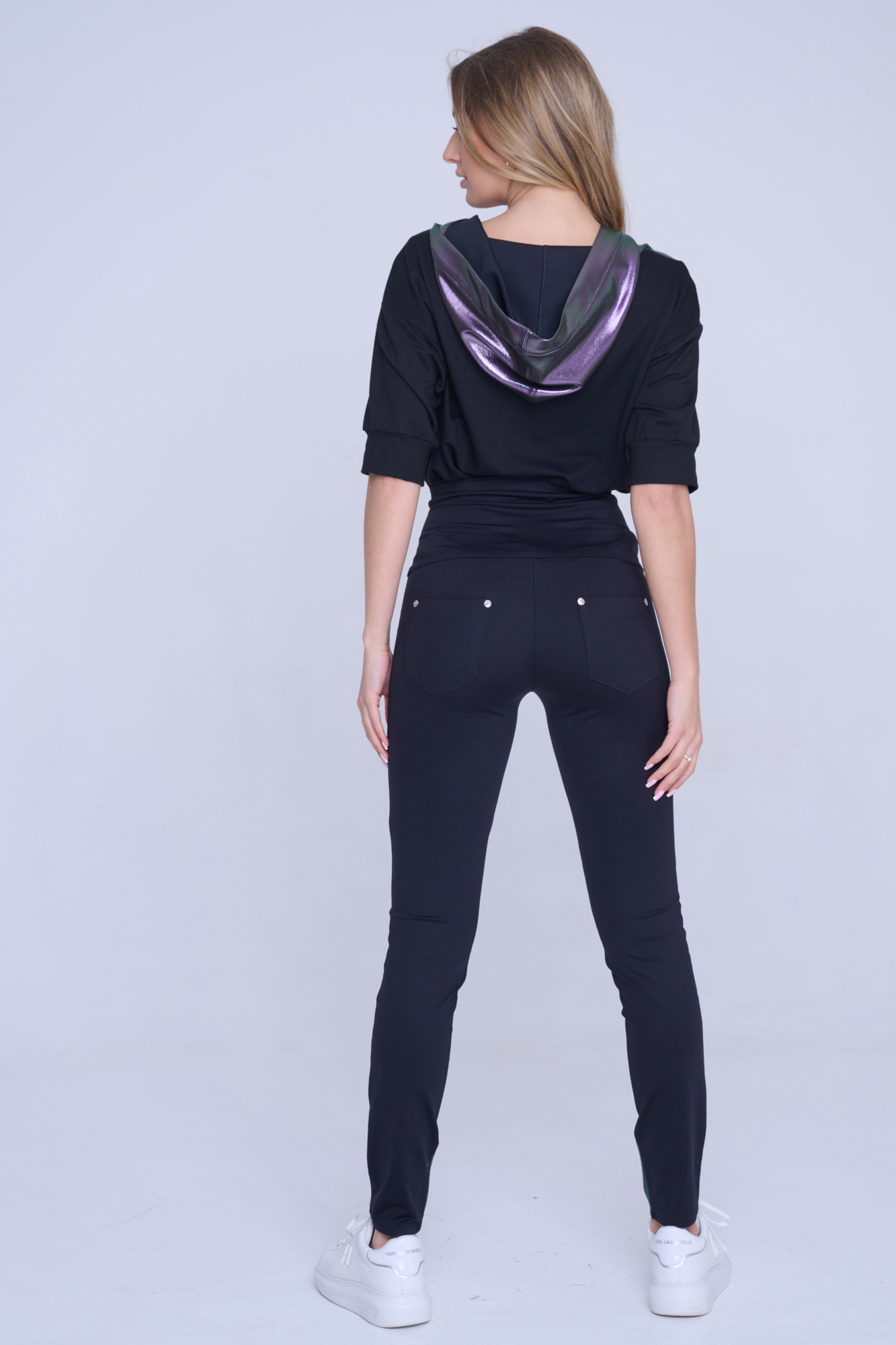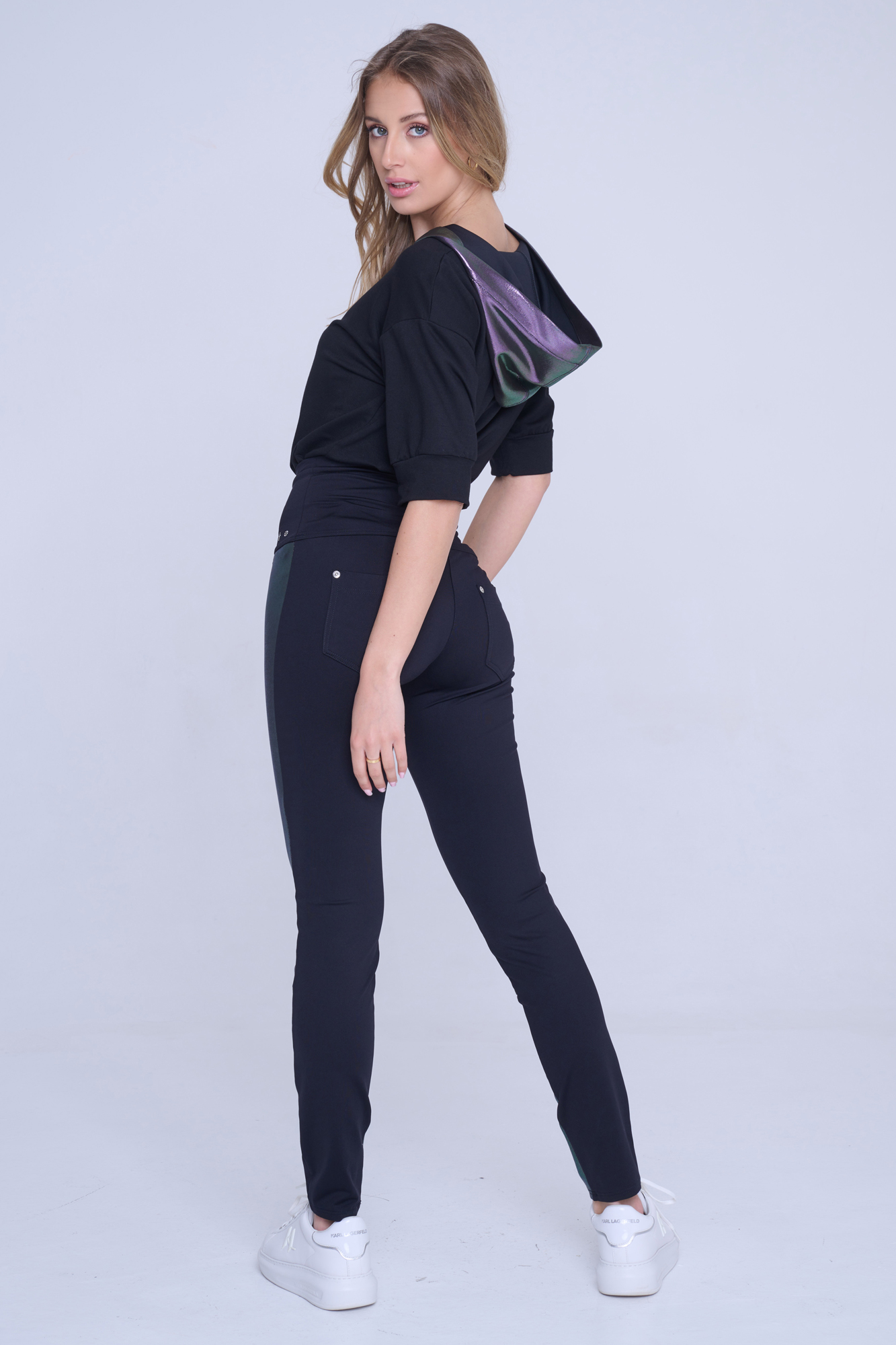 Kalhotové legíny s efektním lesklým materiálem. Na předním díle nápis Infinite ze zlatých krystalů Preciosa.
